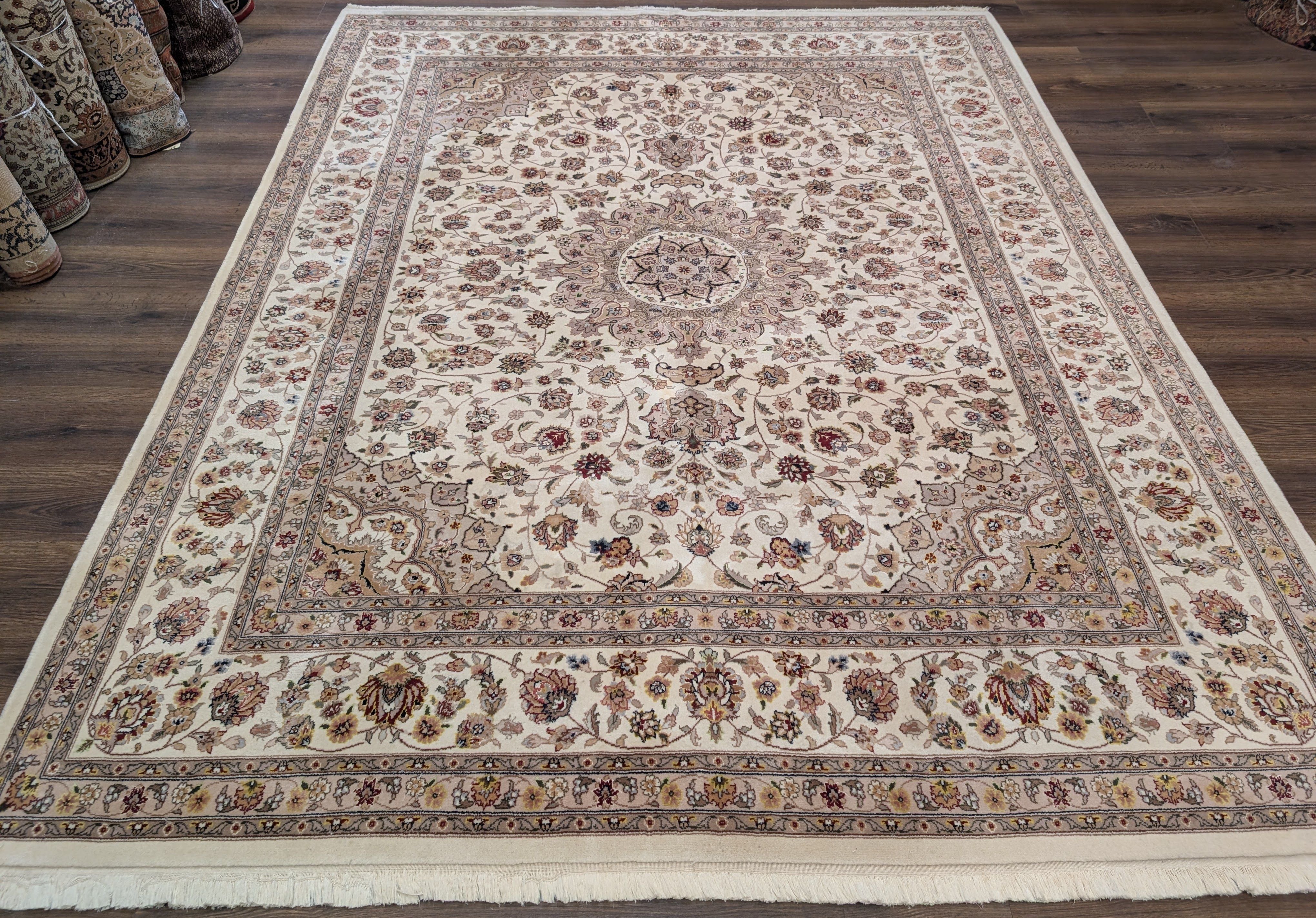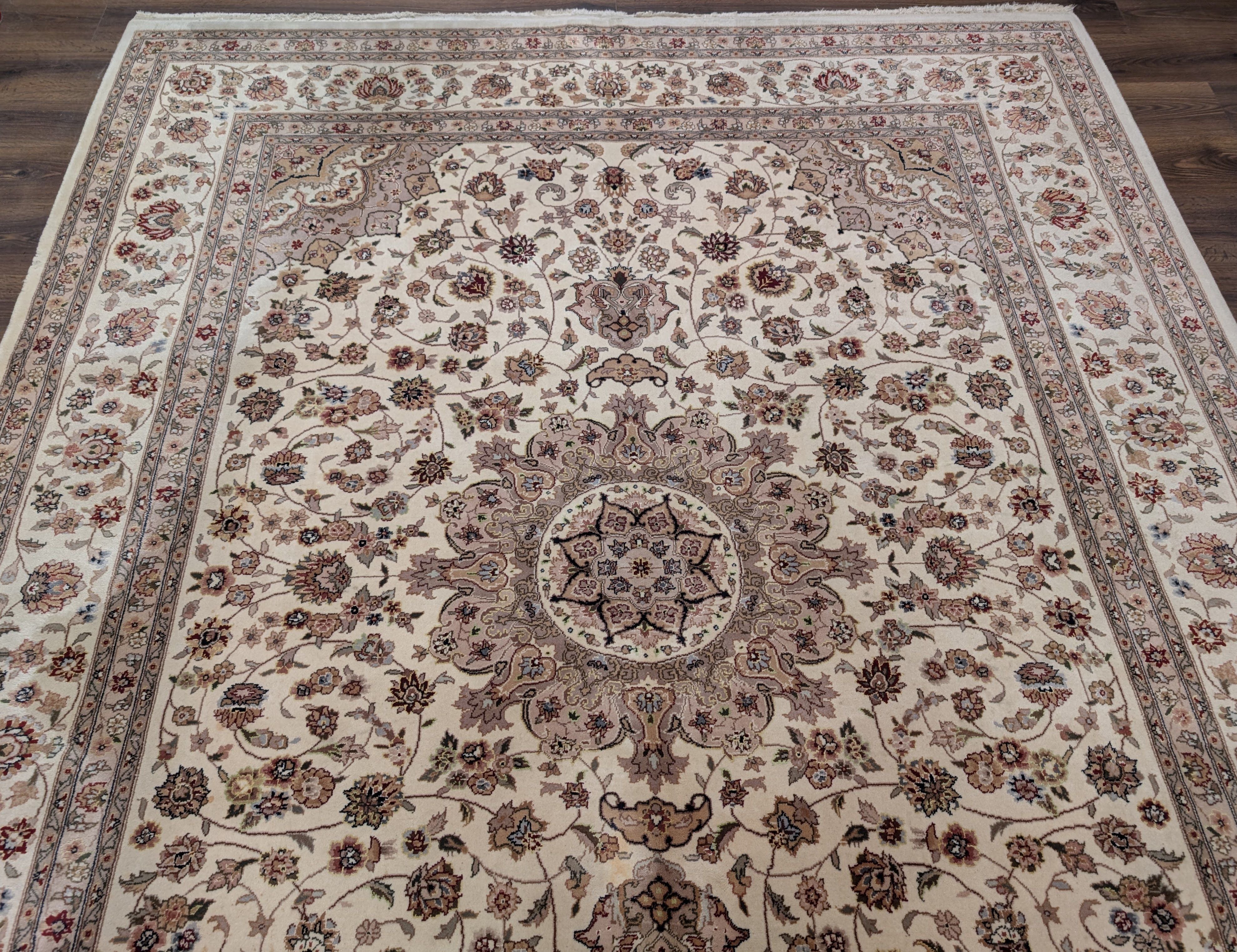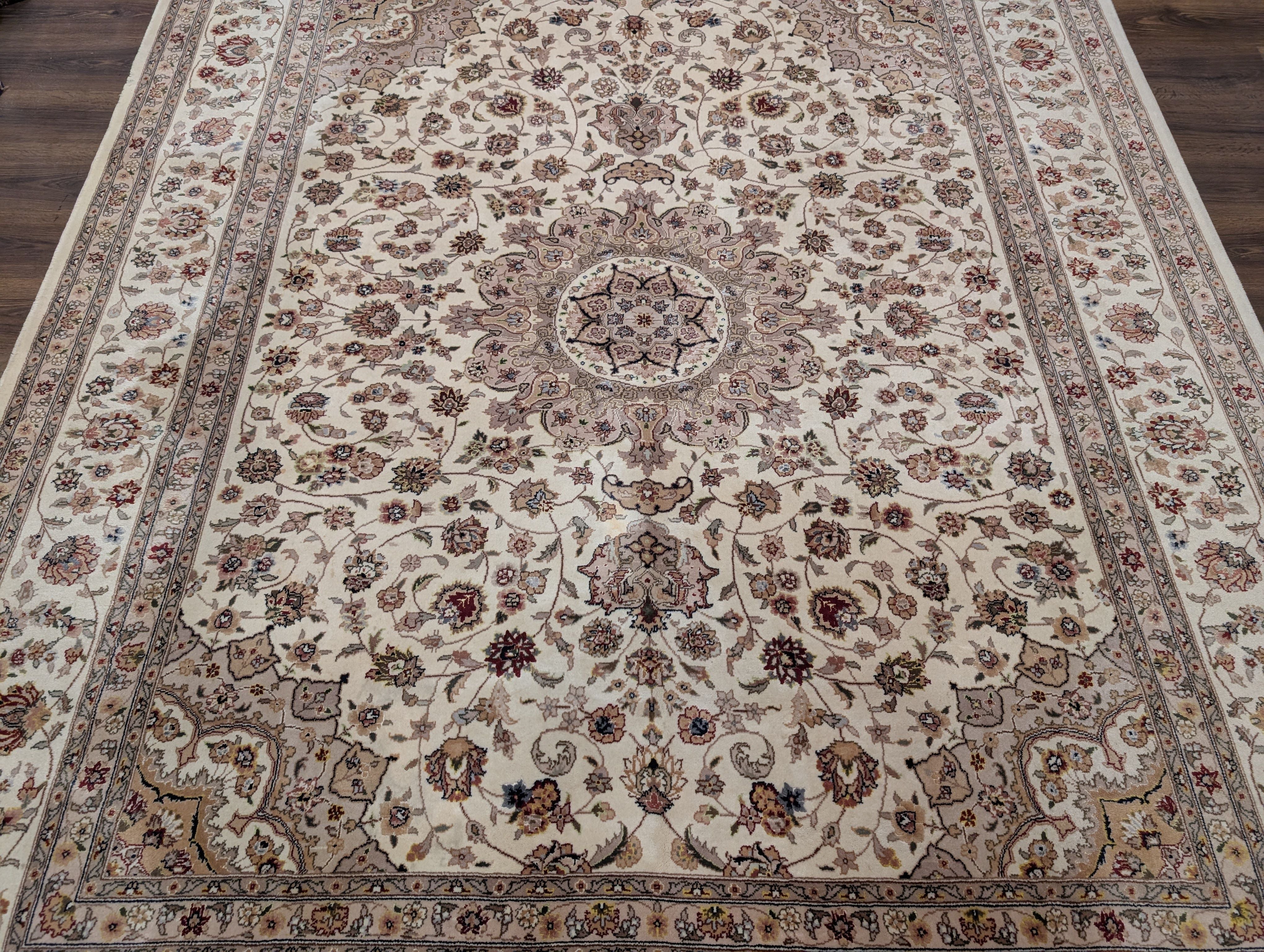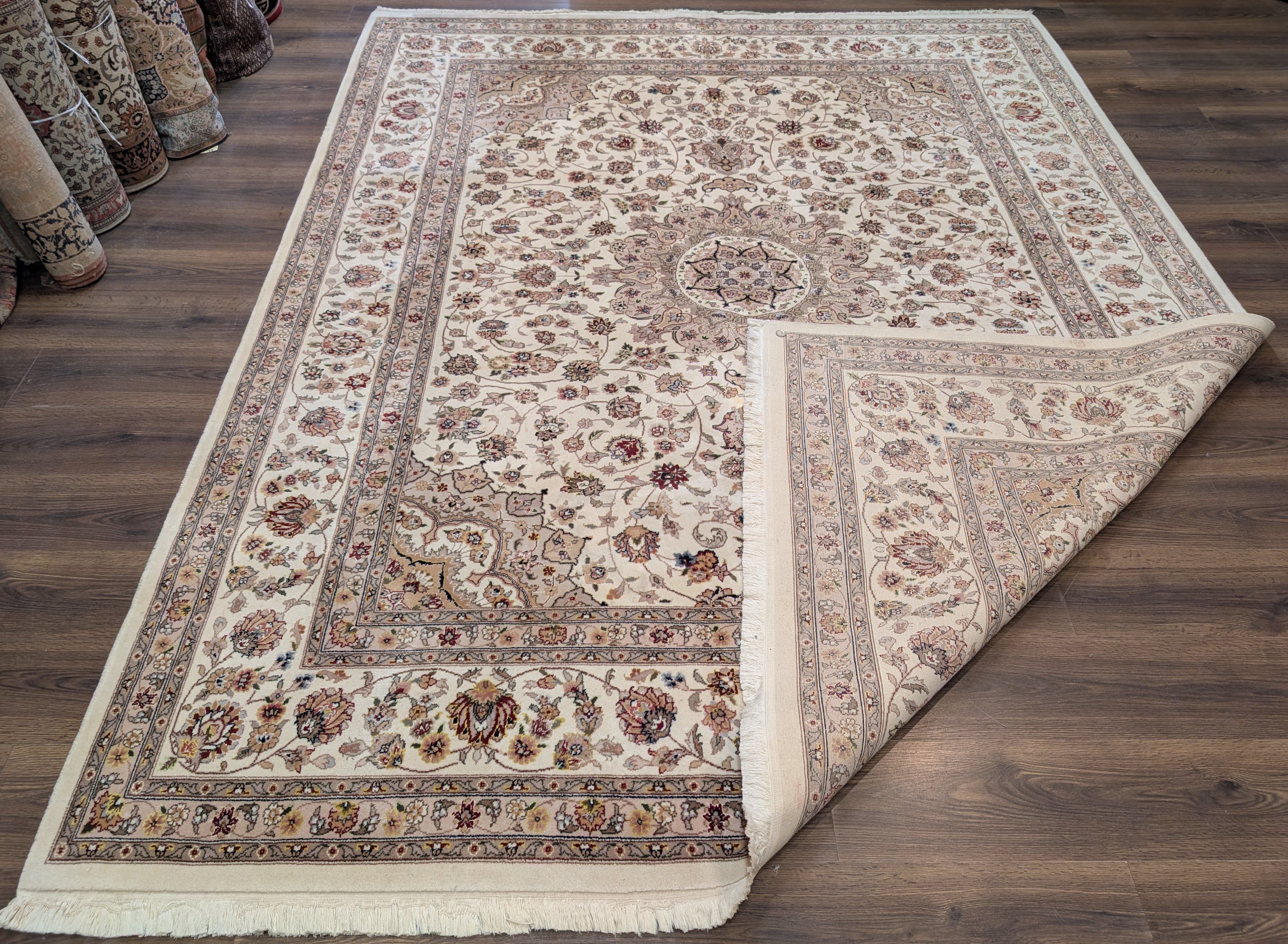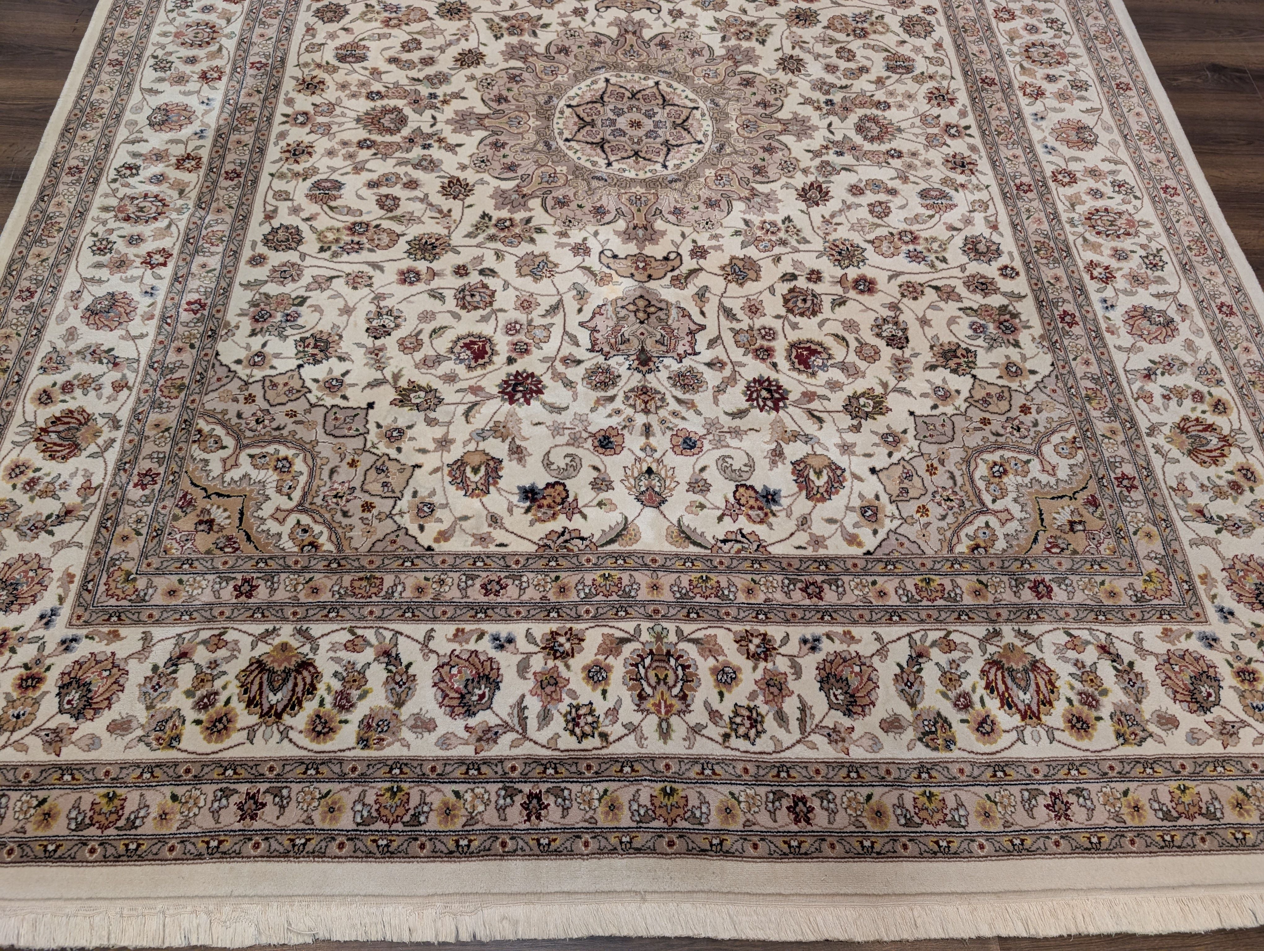 Pak Persian Rug 8x10, Finely Hand Knotted, Ivory/Cream, Floral Medallion, Wool Carpet