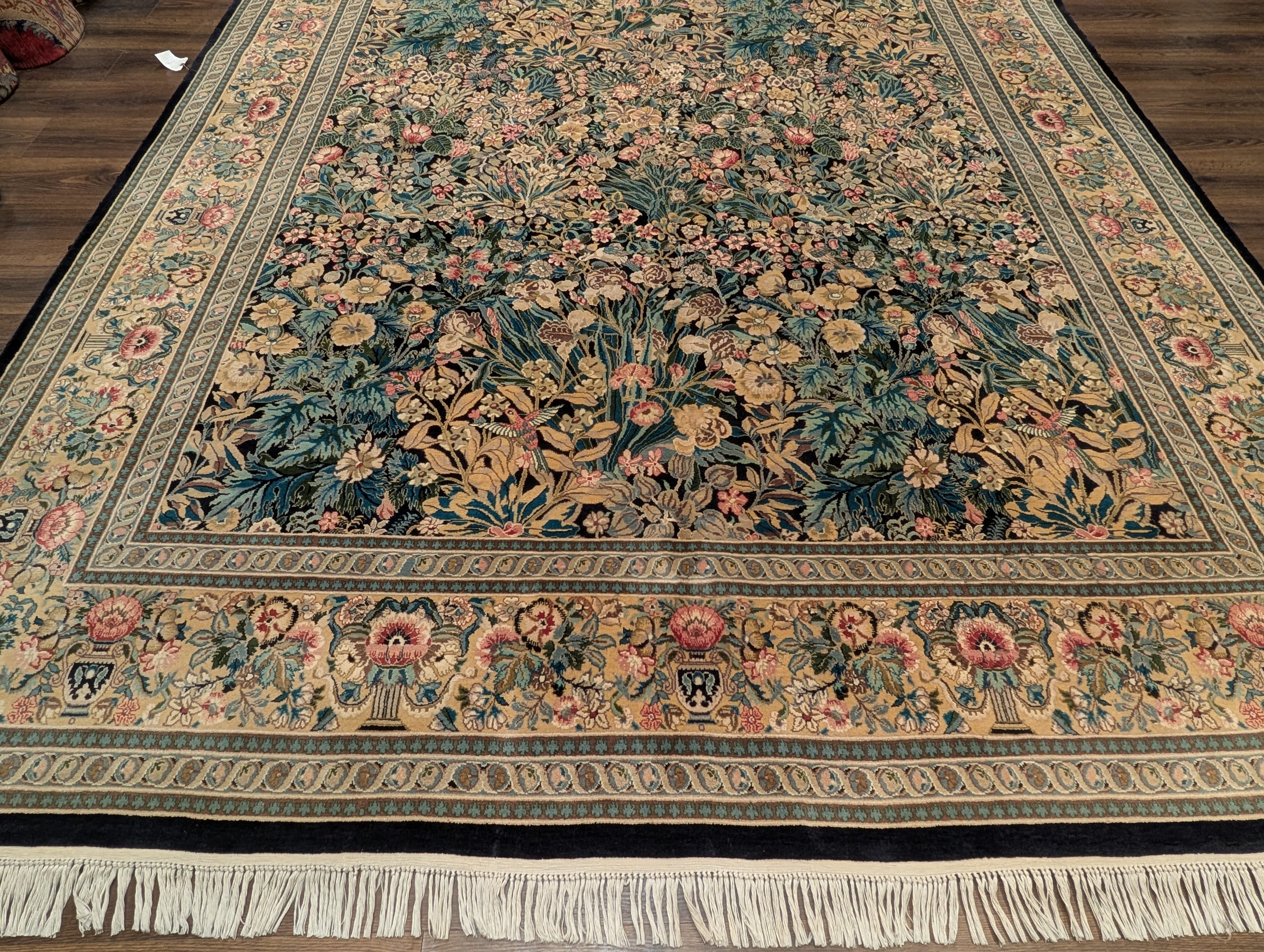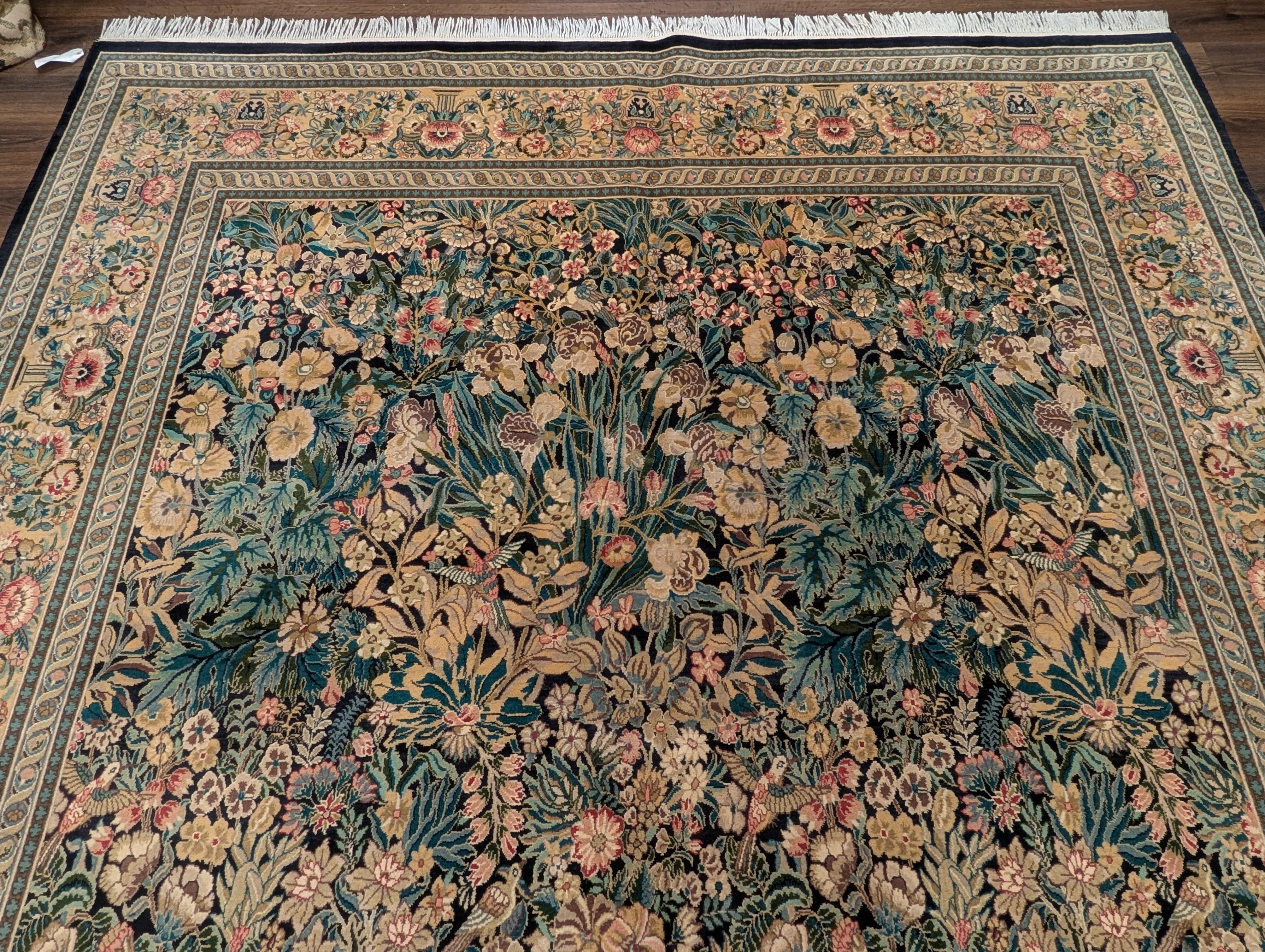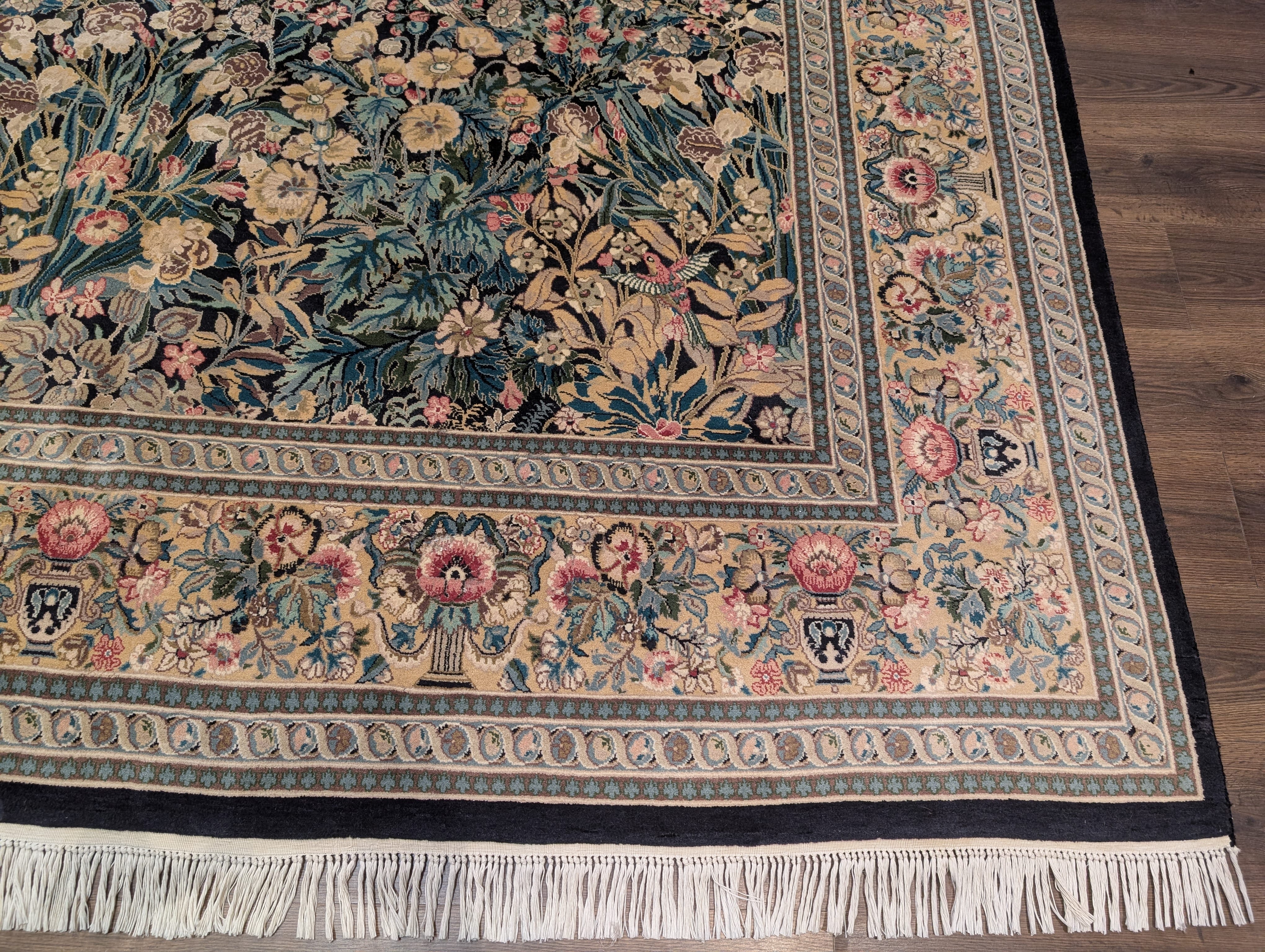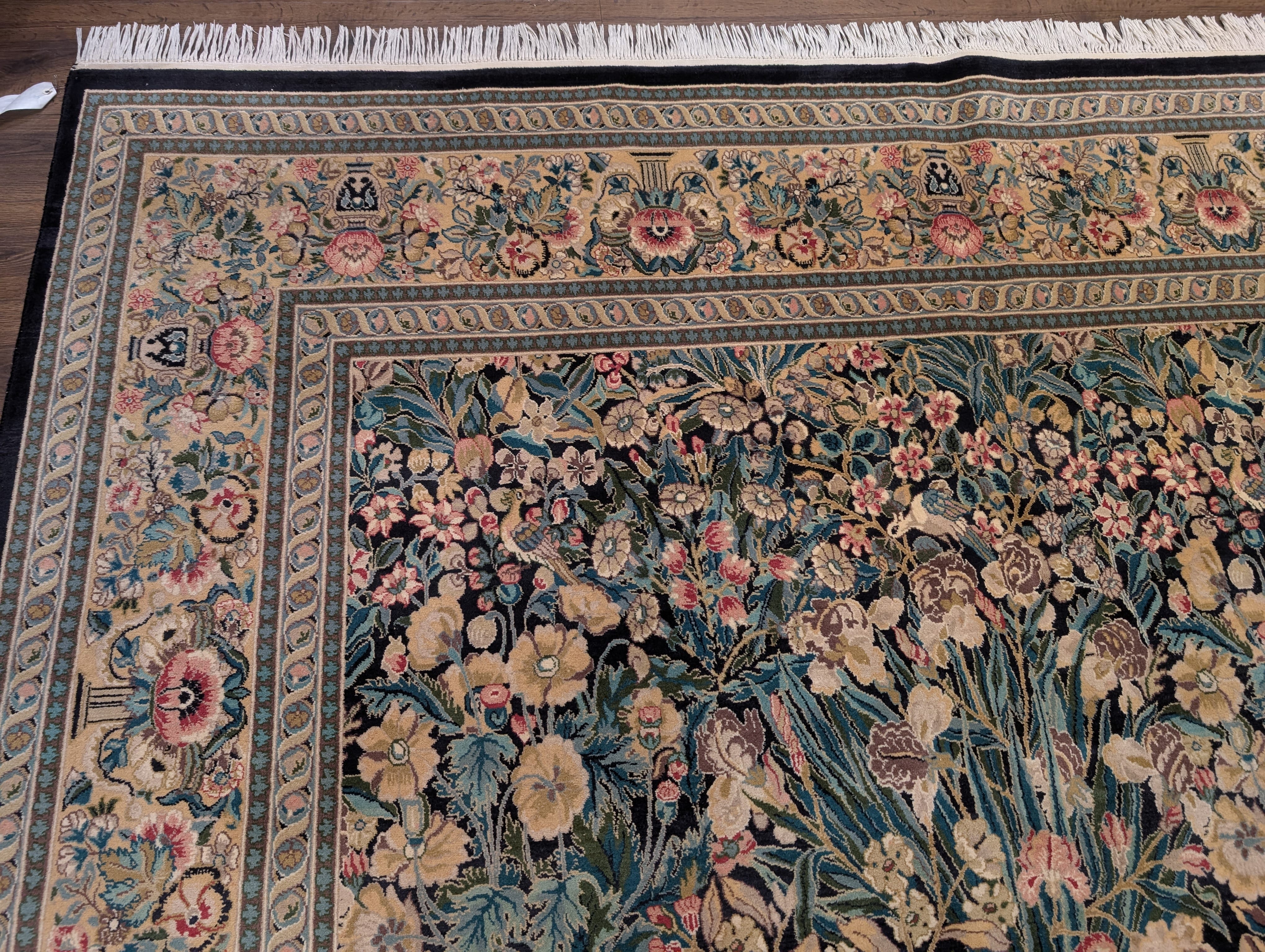 Pakistani Rug 9x13, William Morris Pattern, Fine 240 KPSI, Birds, Floral, Dark Green