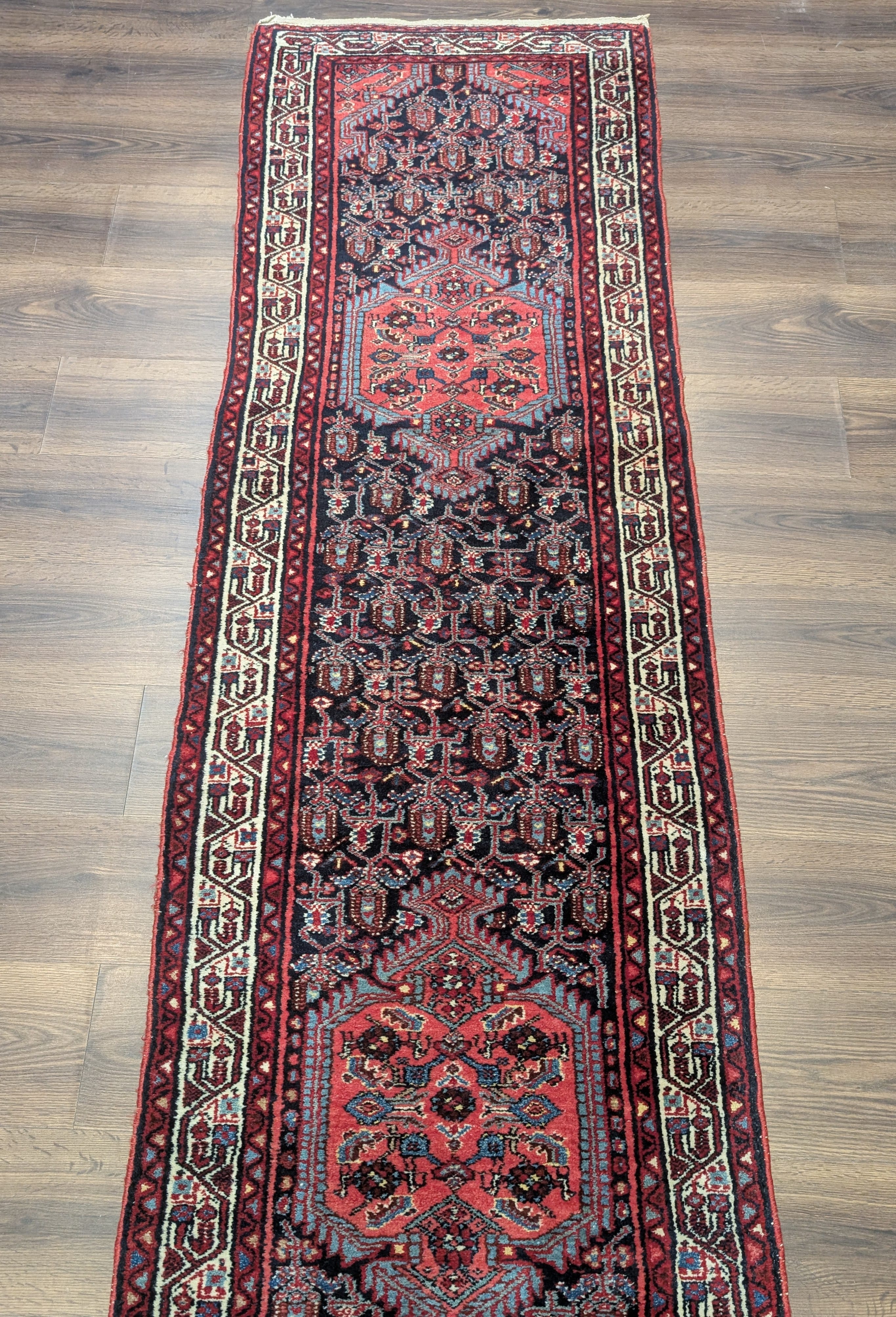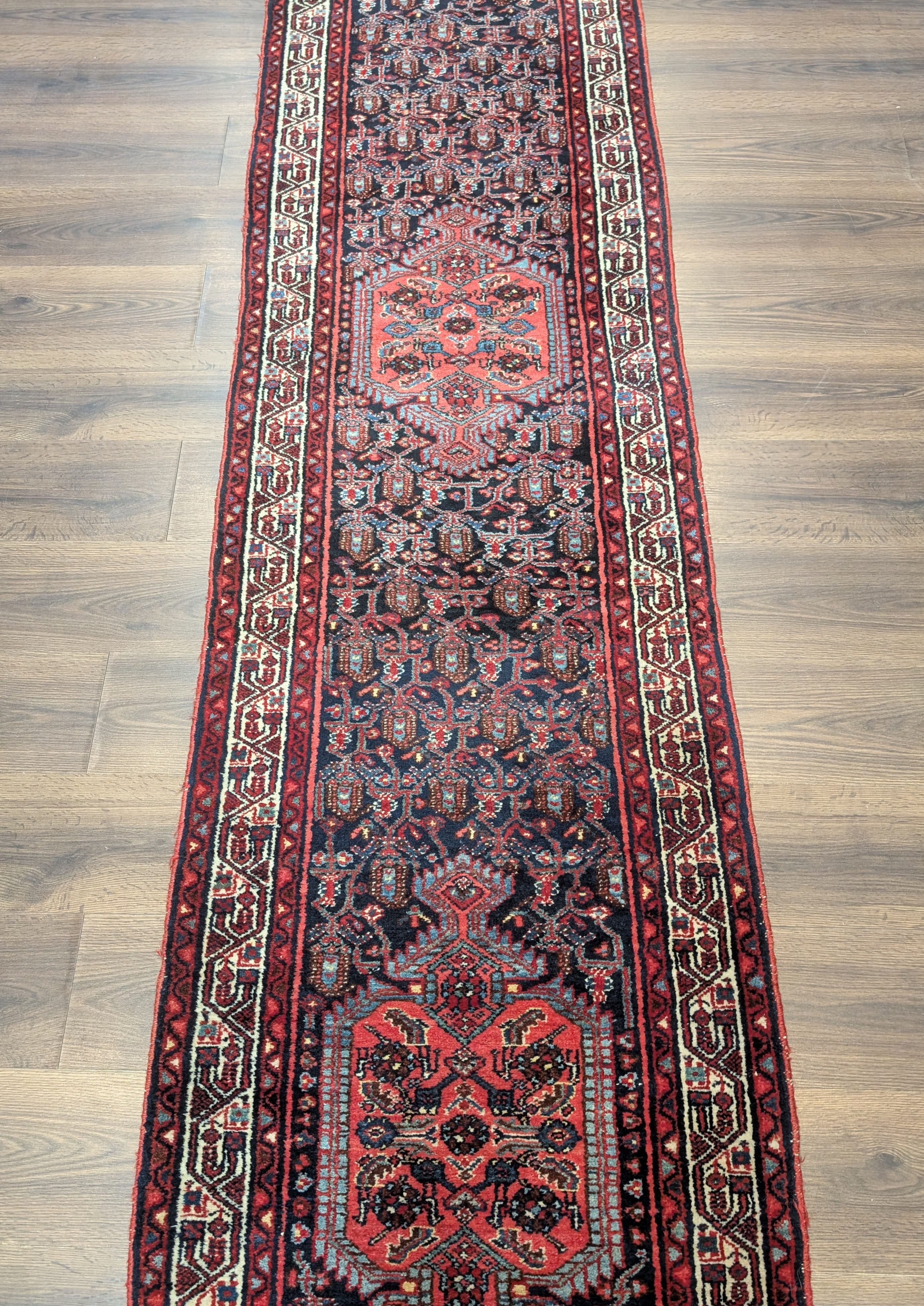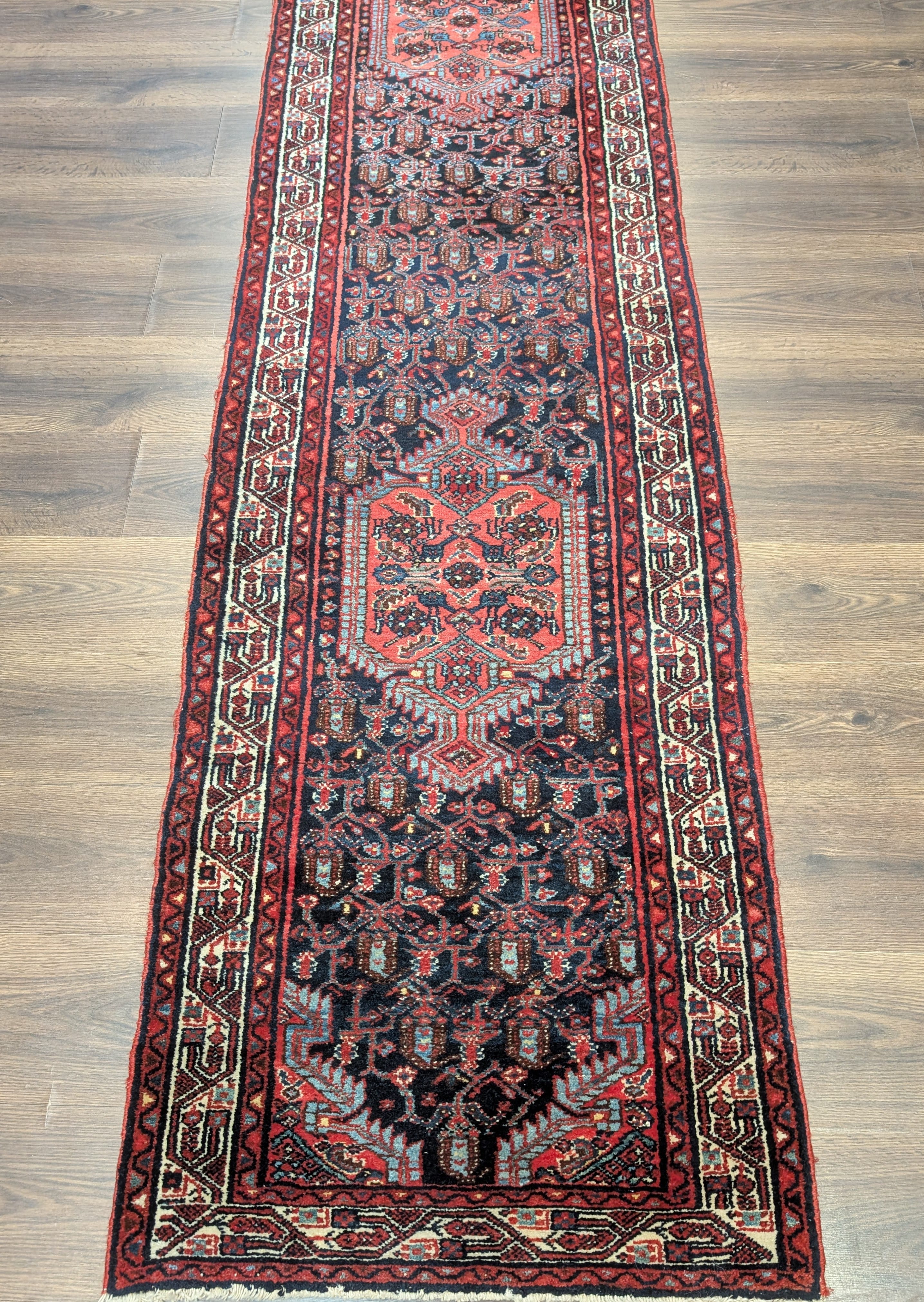 Persian Hamadan Runner Rug 2.7 x 13.5, Boteh Medallions, Wool, Vintage, Navy Blue