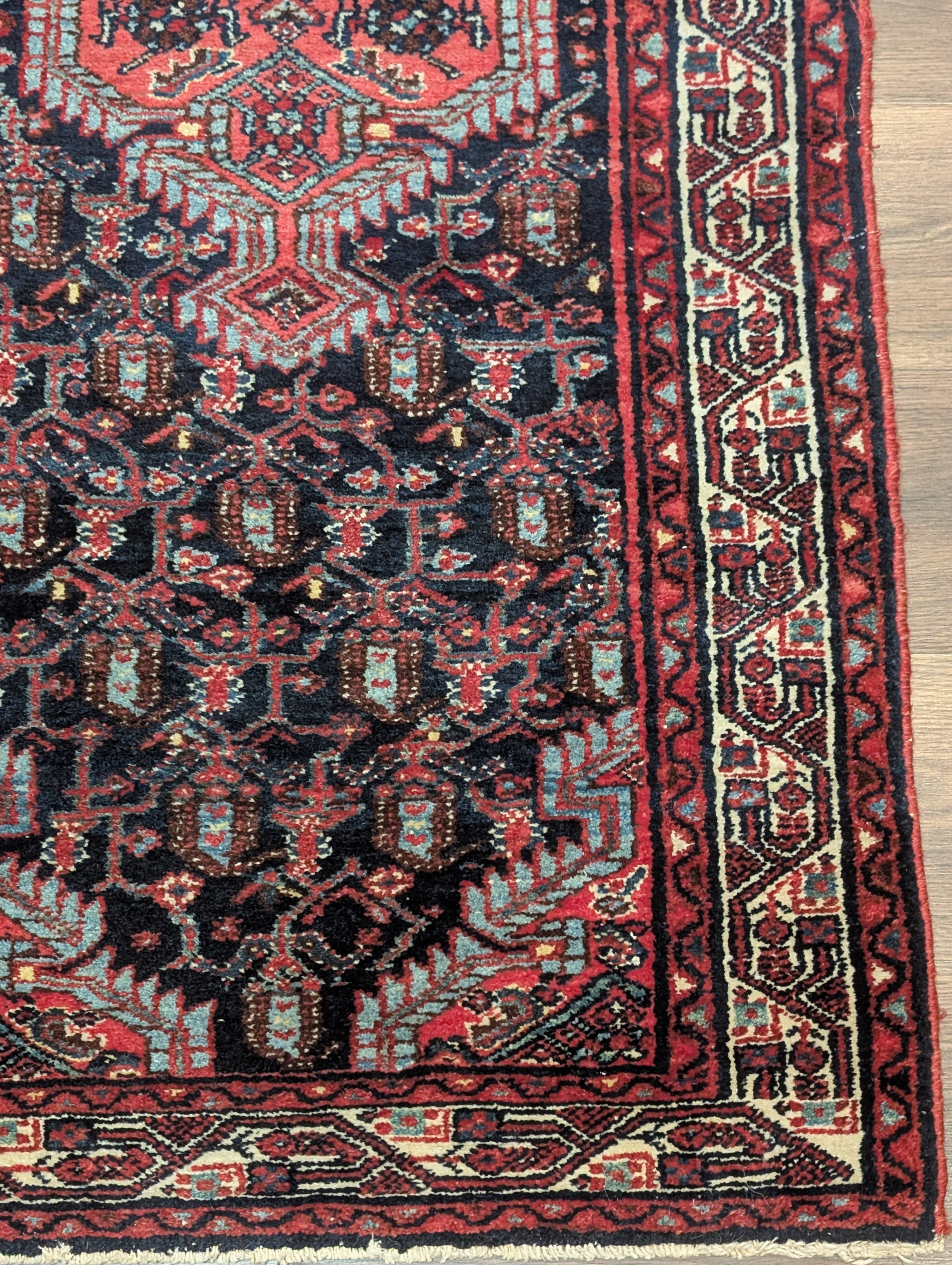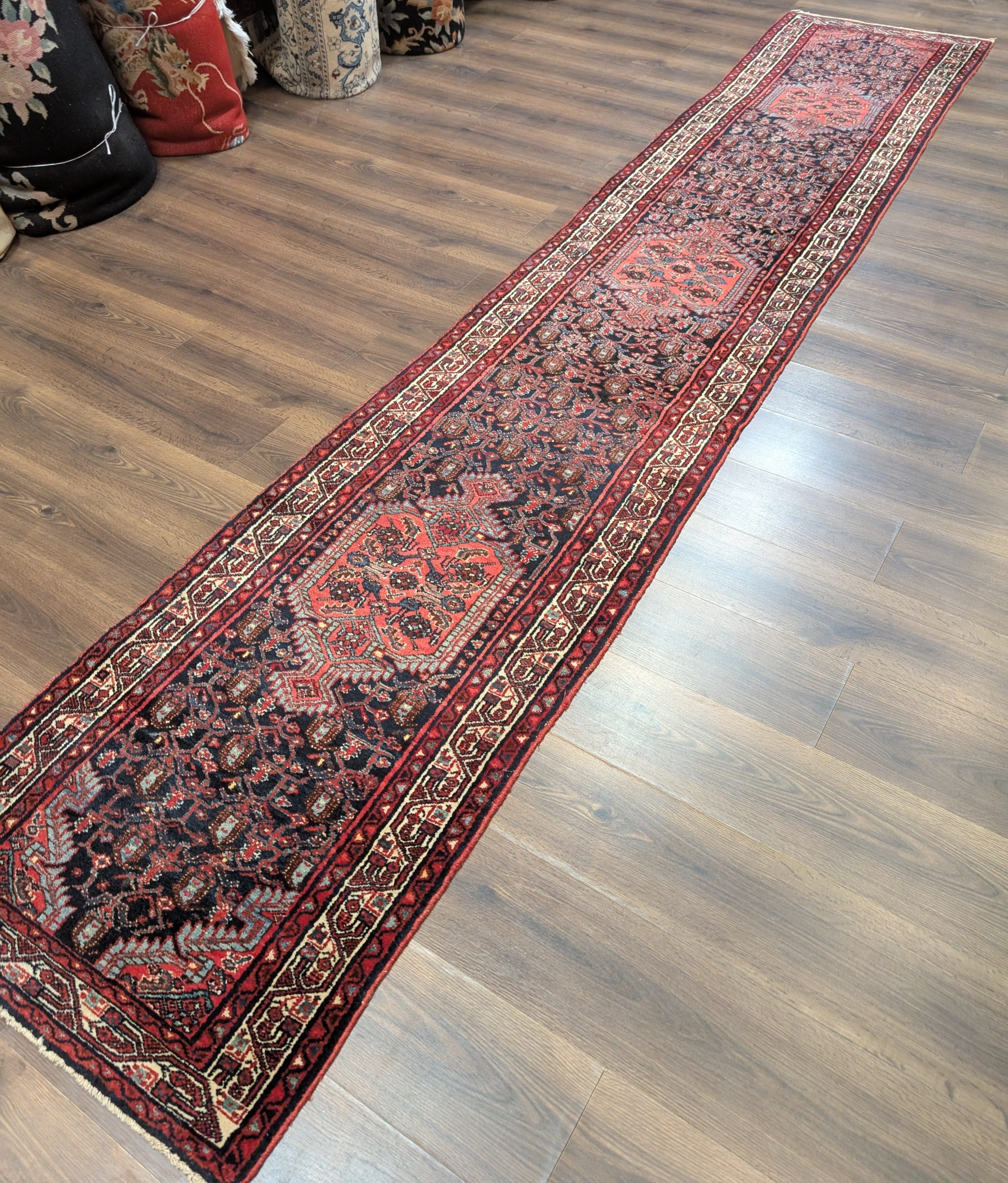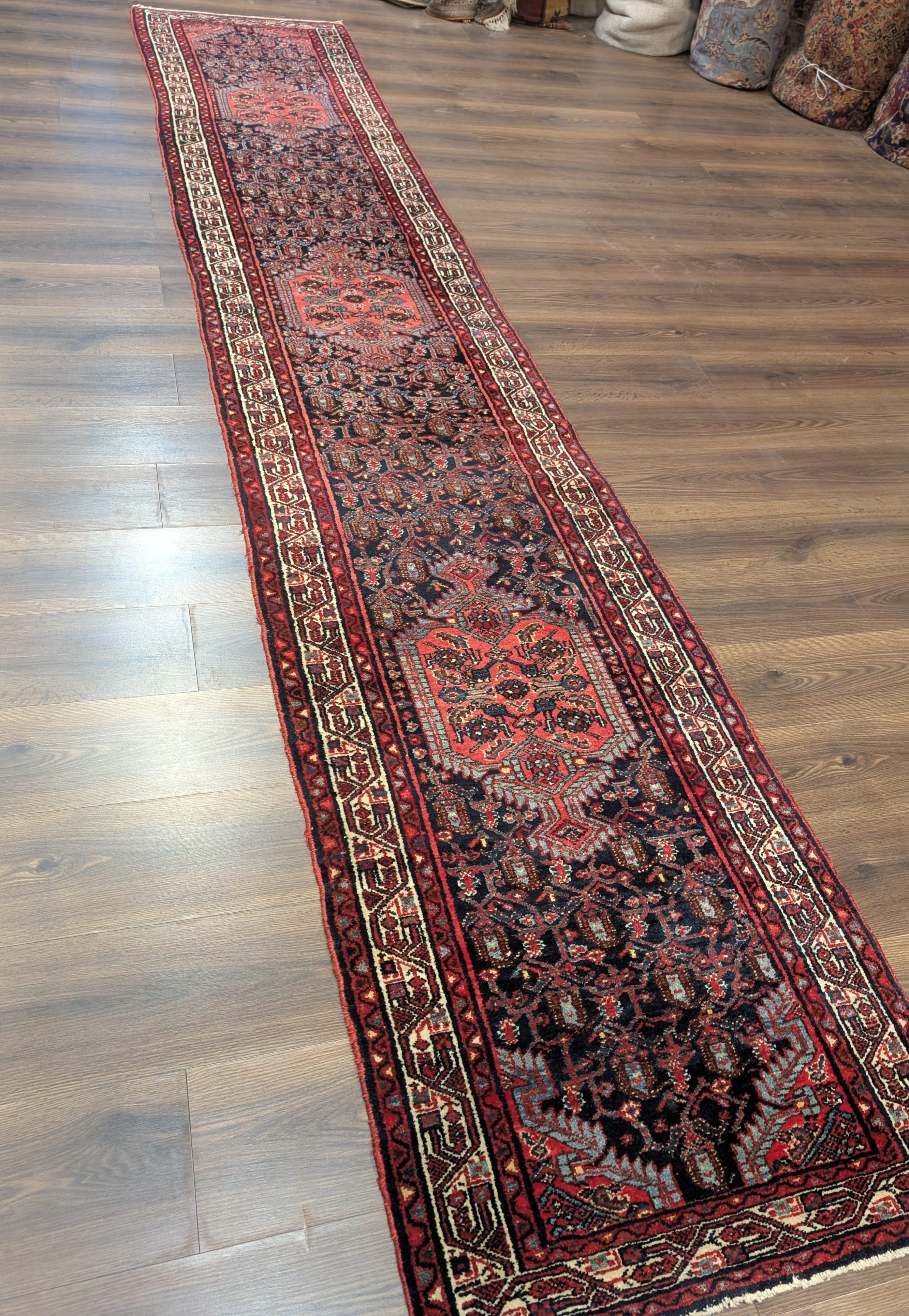 Persian Hamadan Runner Rug 2.7 x 13.5, Boteh Medallions, Wool, Vintage, Navy Blue