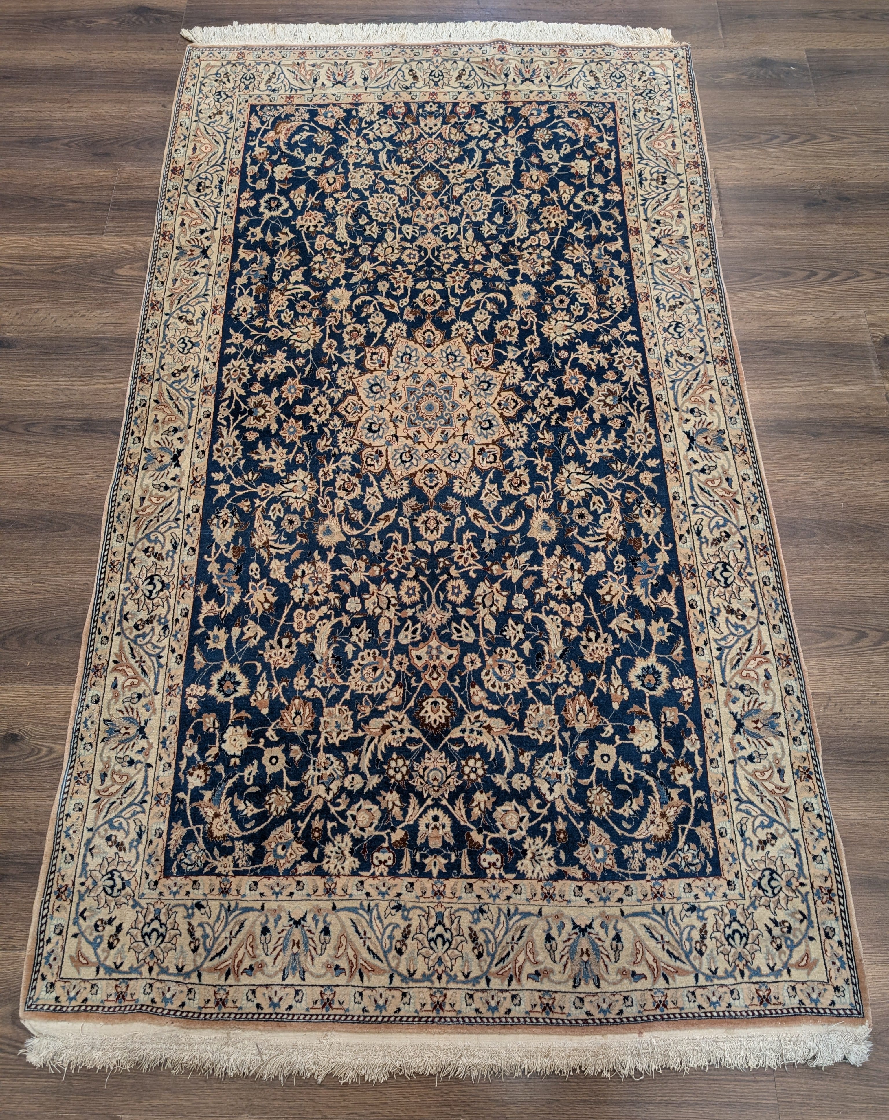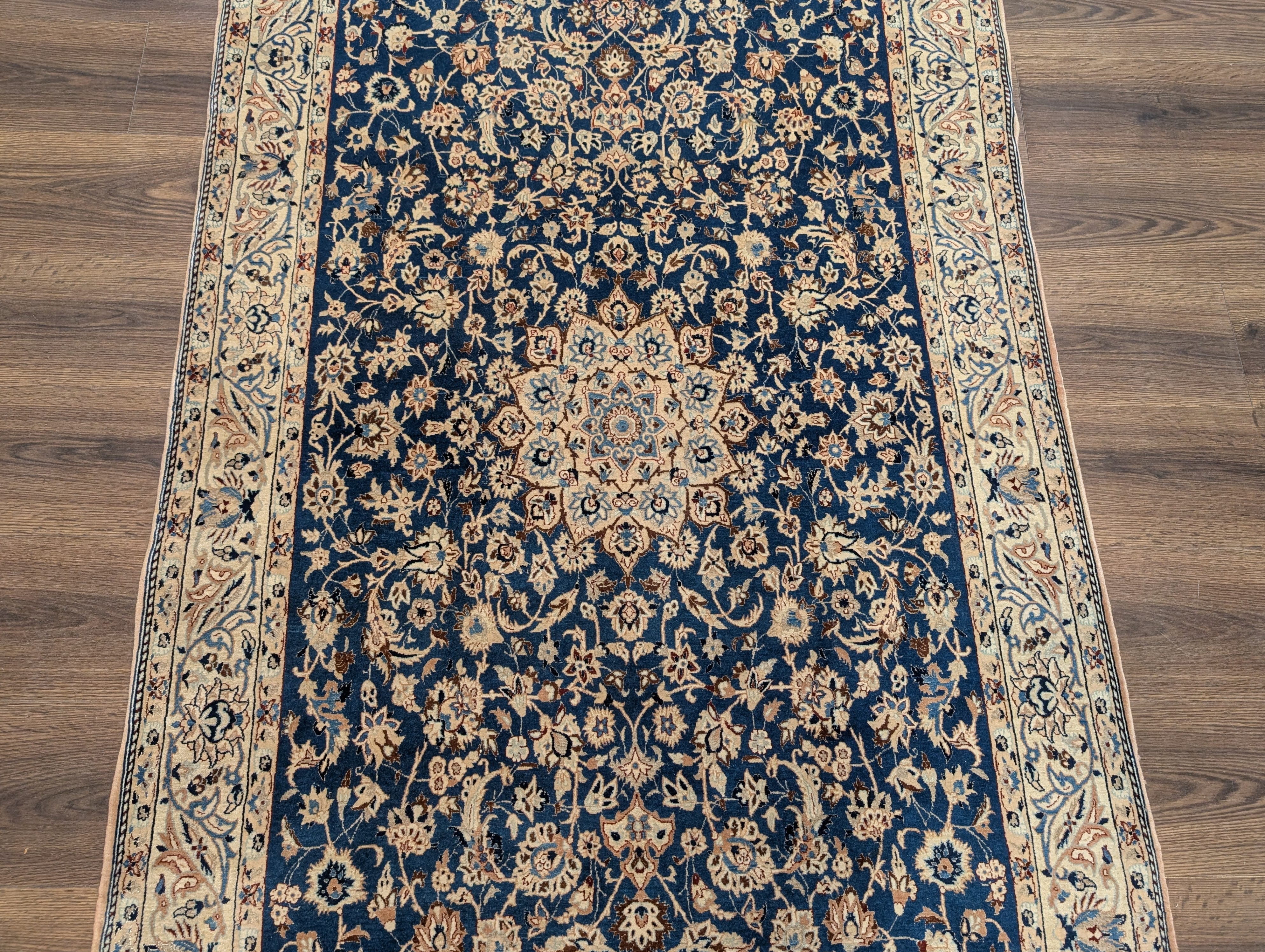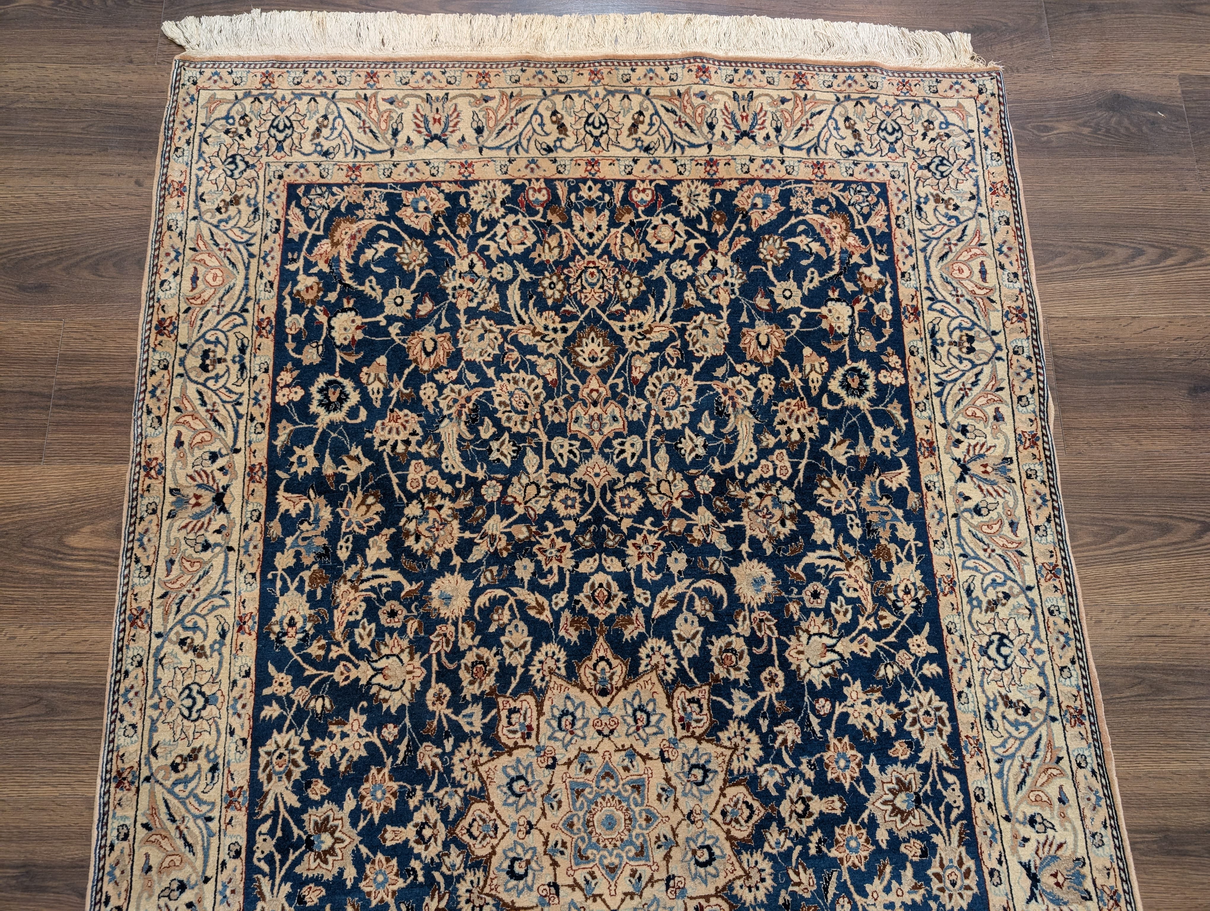 Persian Nain Rug 4x7, Navy Blue and Ivory, Super Fine 550 KPSI, Kork Wool & Silk Highlights, Wonderful