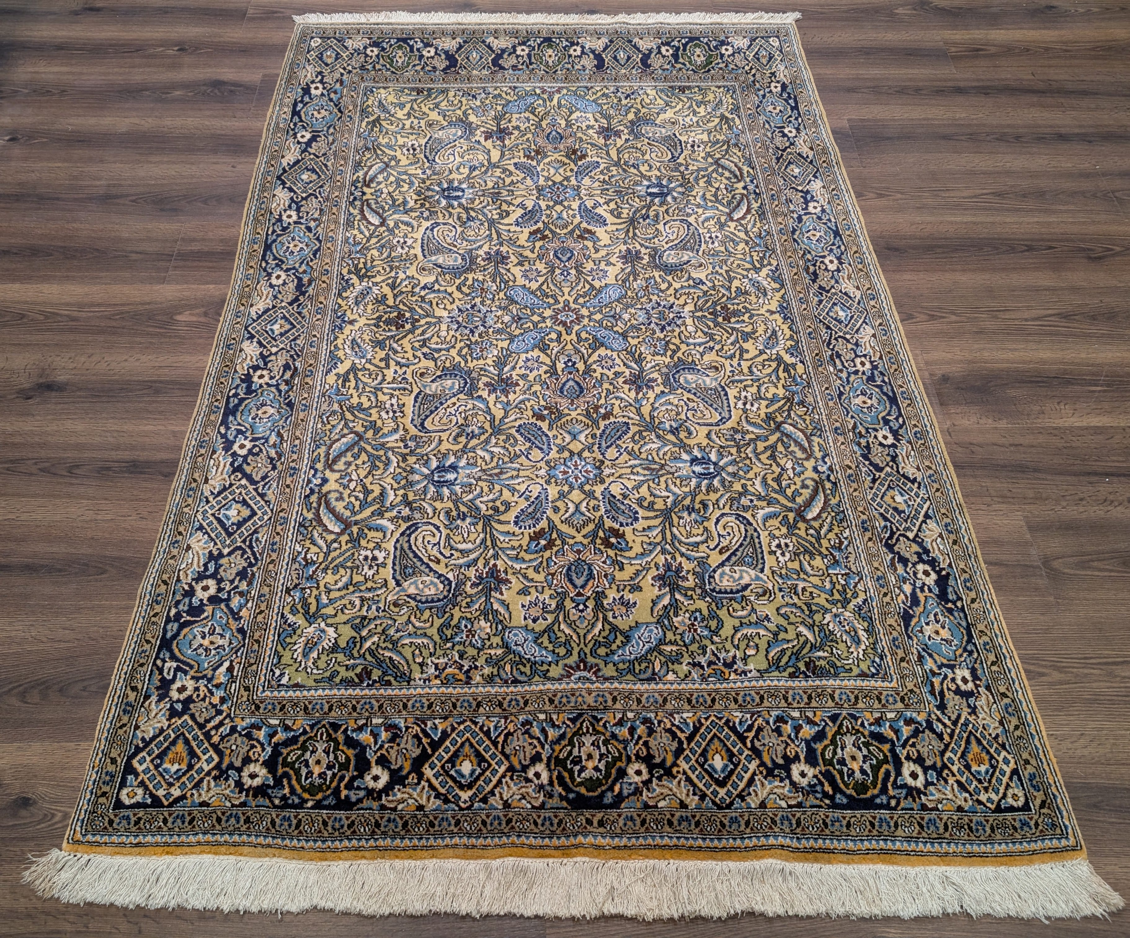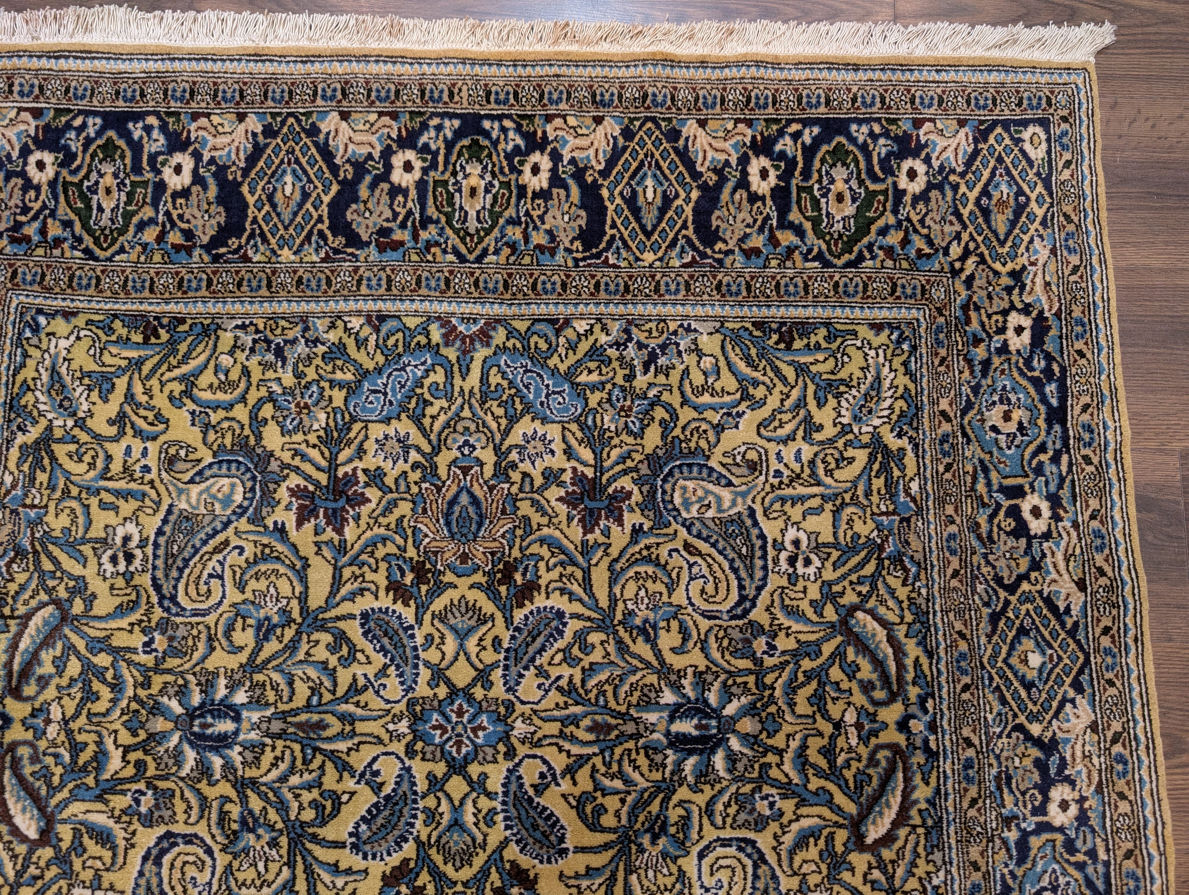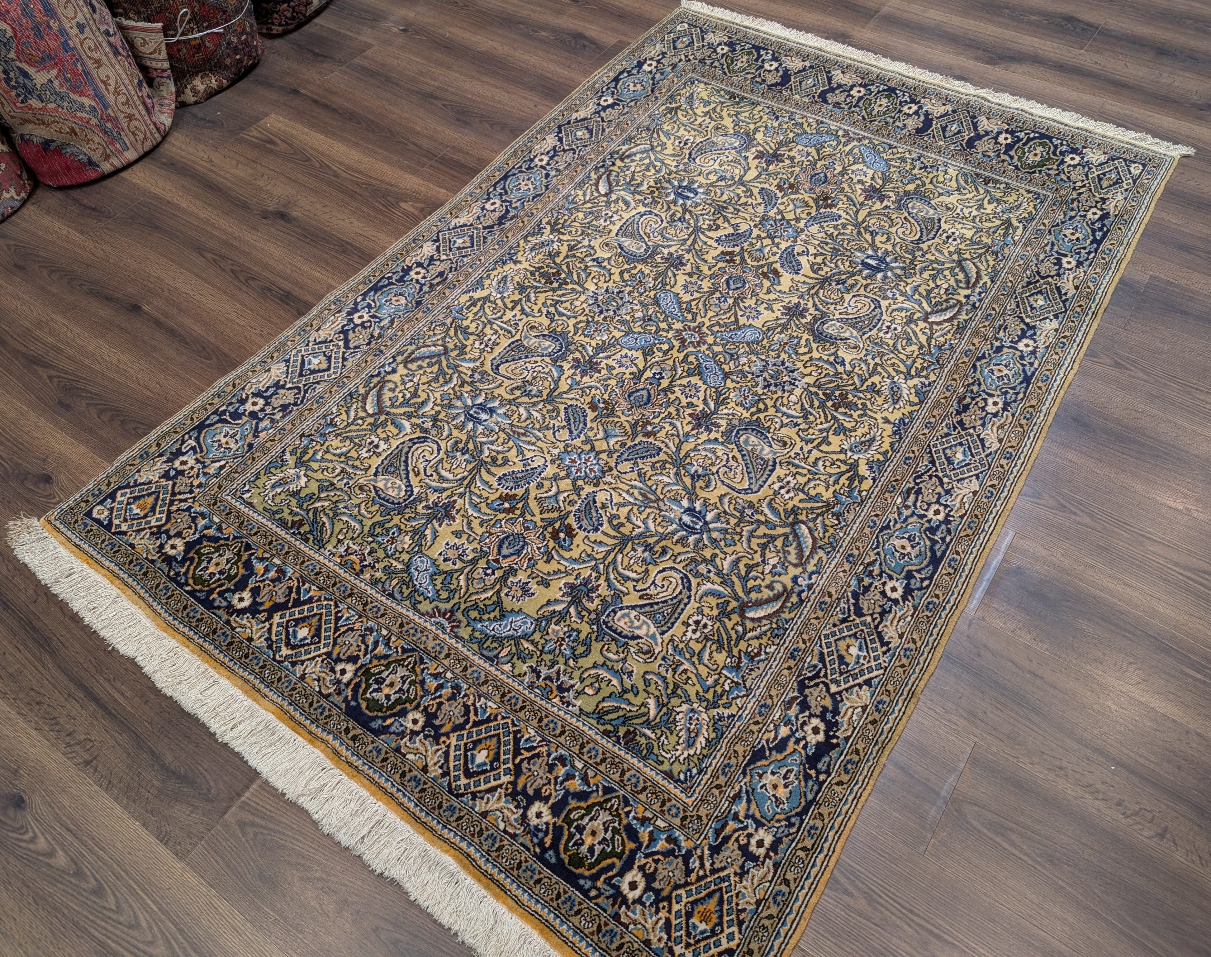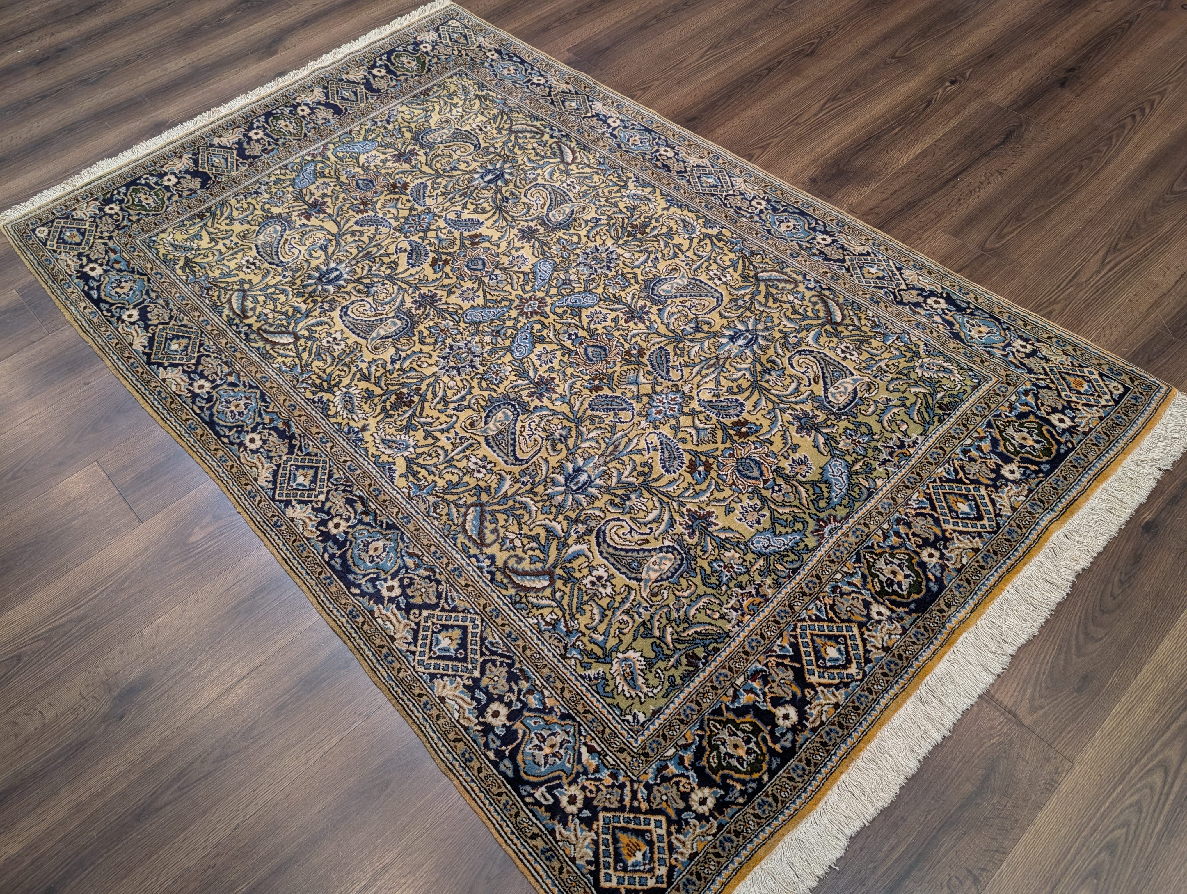Persian Qum Rug 5x7, Gold and Navy Blue, Paisley-Boteh, Allover Floral