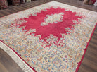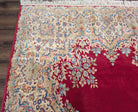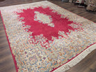 This captivating 9x12 Persian Kerman rug makes a bold statement with its deep red field and ornate floral medallion. The semi-open design creates a beautiful balance between space and detail, allowing the lush central motif and delicate corner spandrels to shine. Its elegant ivory and beige border showcases intricate floral work in soft pastels like light blue and blush—offering both contrast and harmony. With a soft wool pile and refined palette, this rug is ideal for adding warmth, history, and drama to a formal living room or dining space.