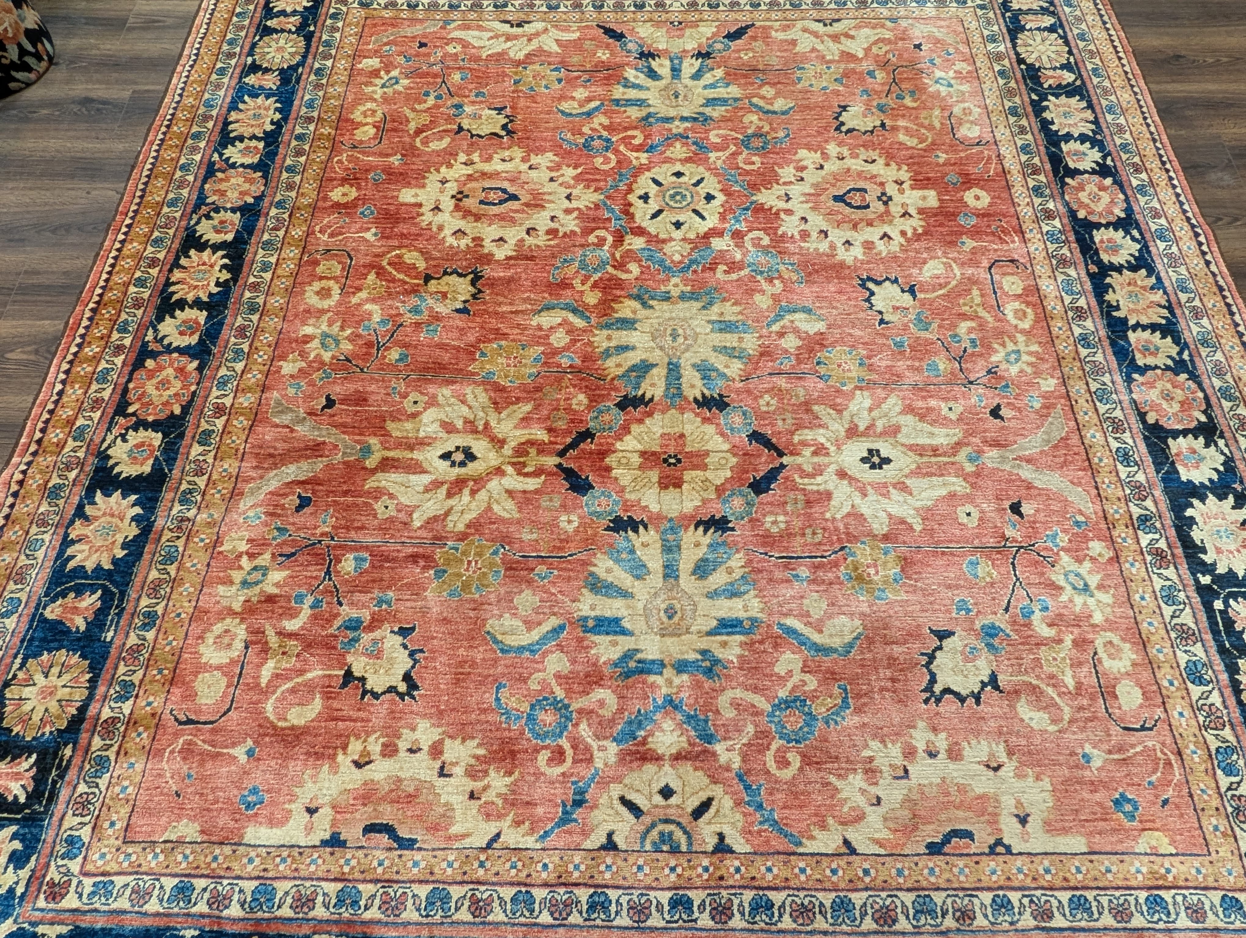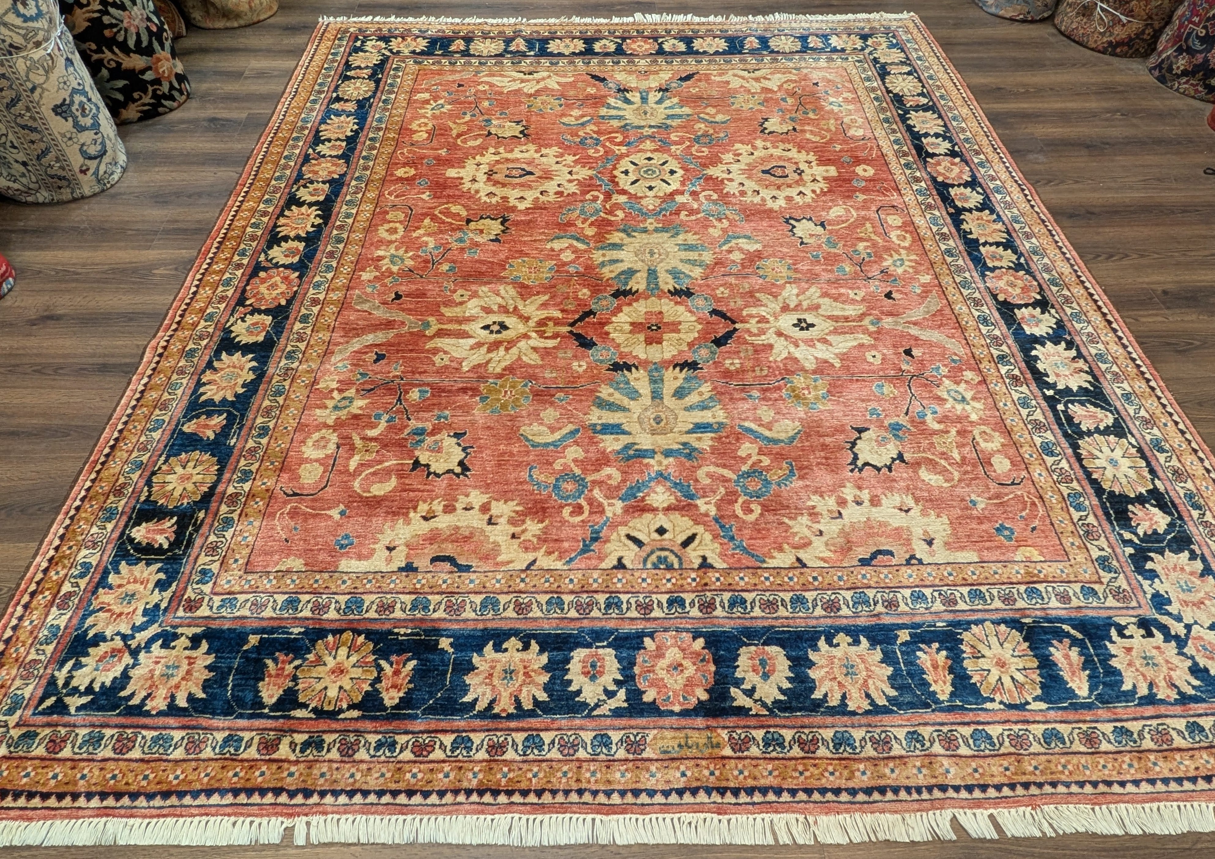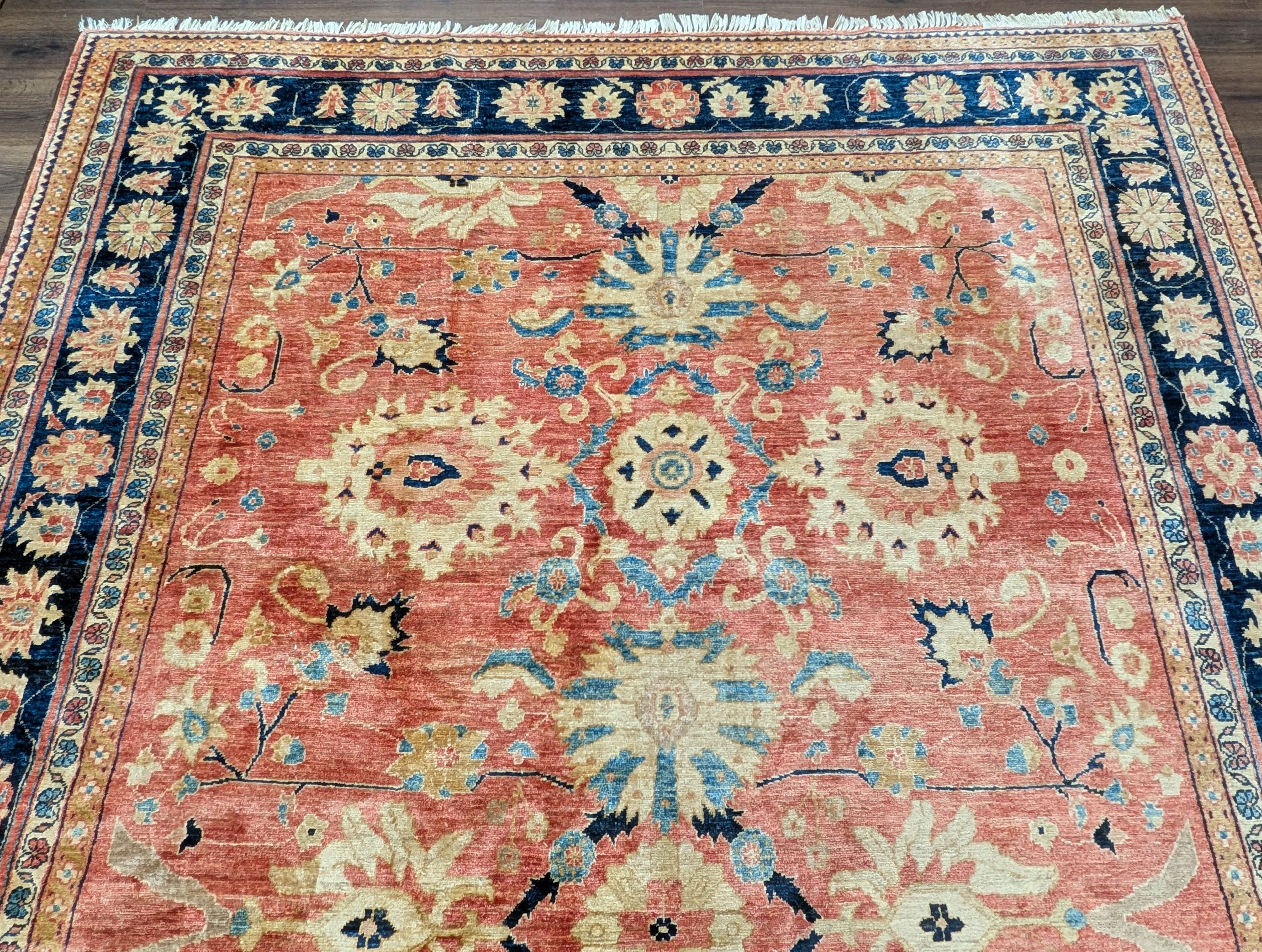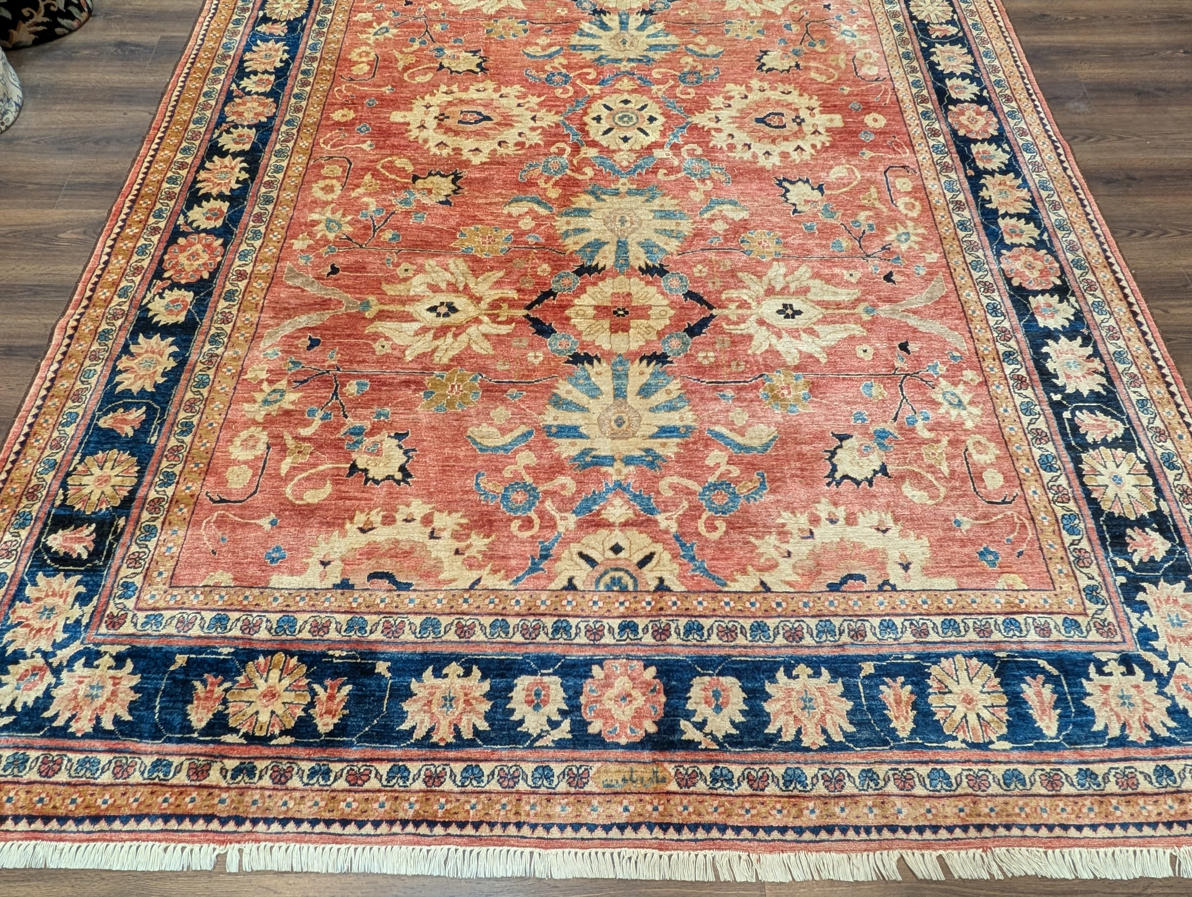 Persian Sultanabad Rug 8x10, Coral and Blue, Allover Pattern, Mahal Carpet, Wool