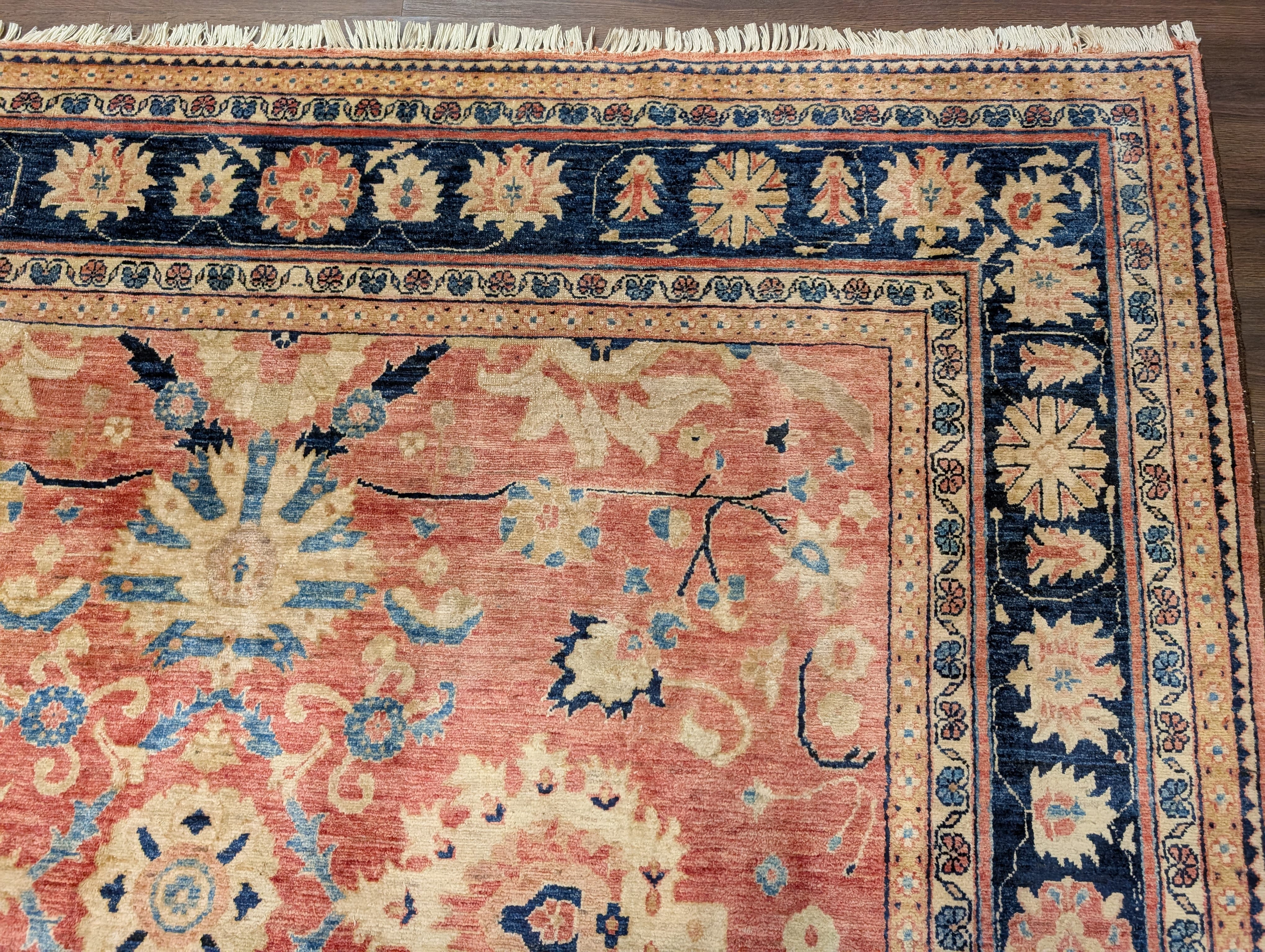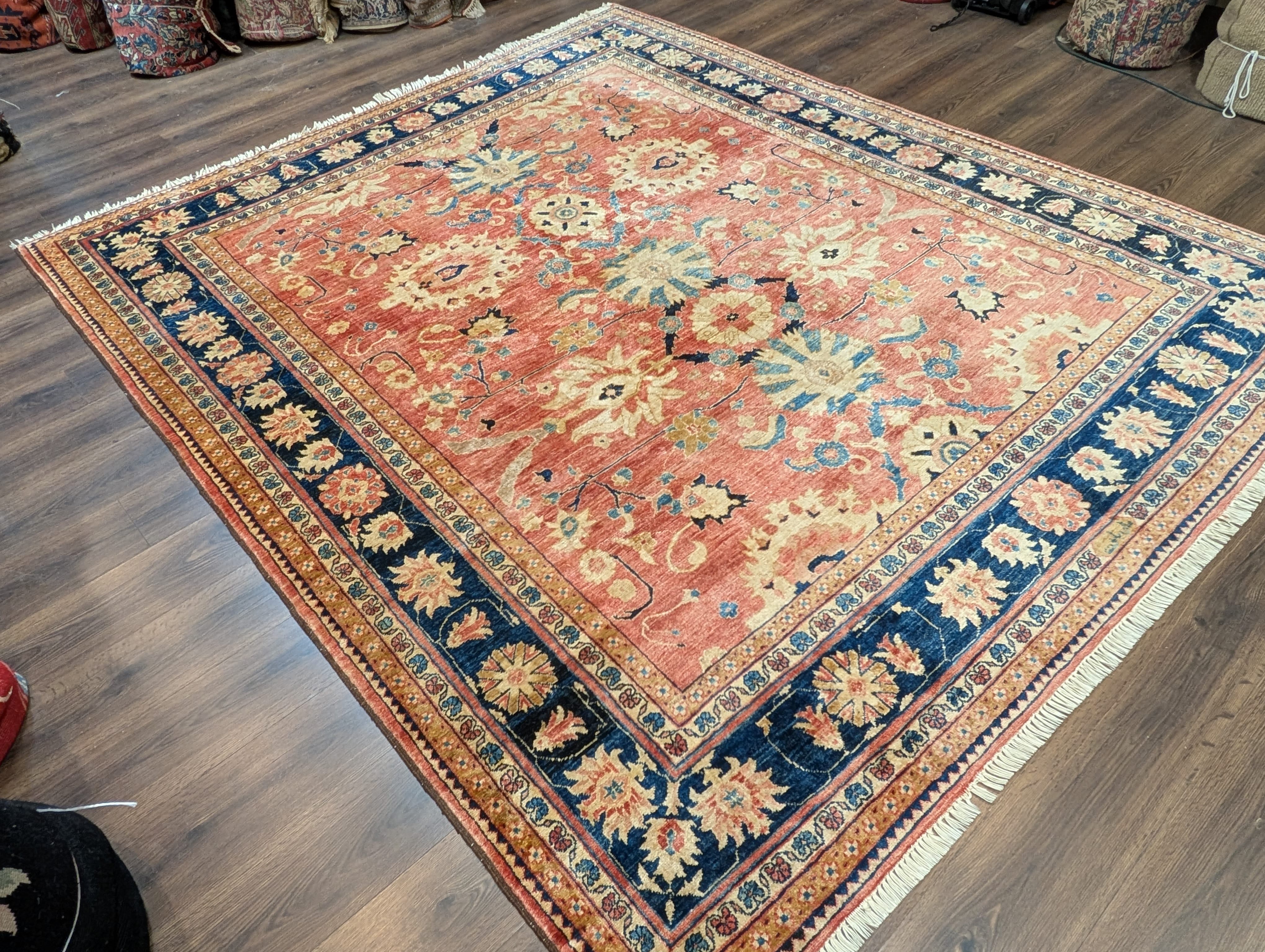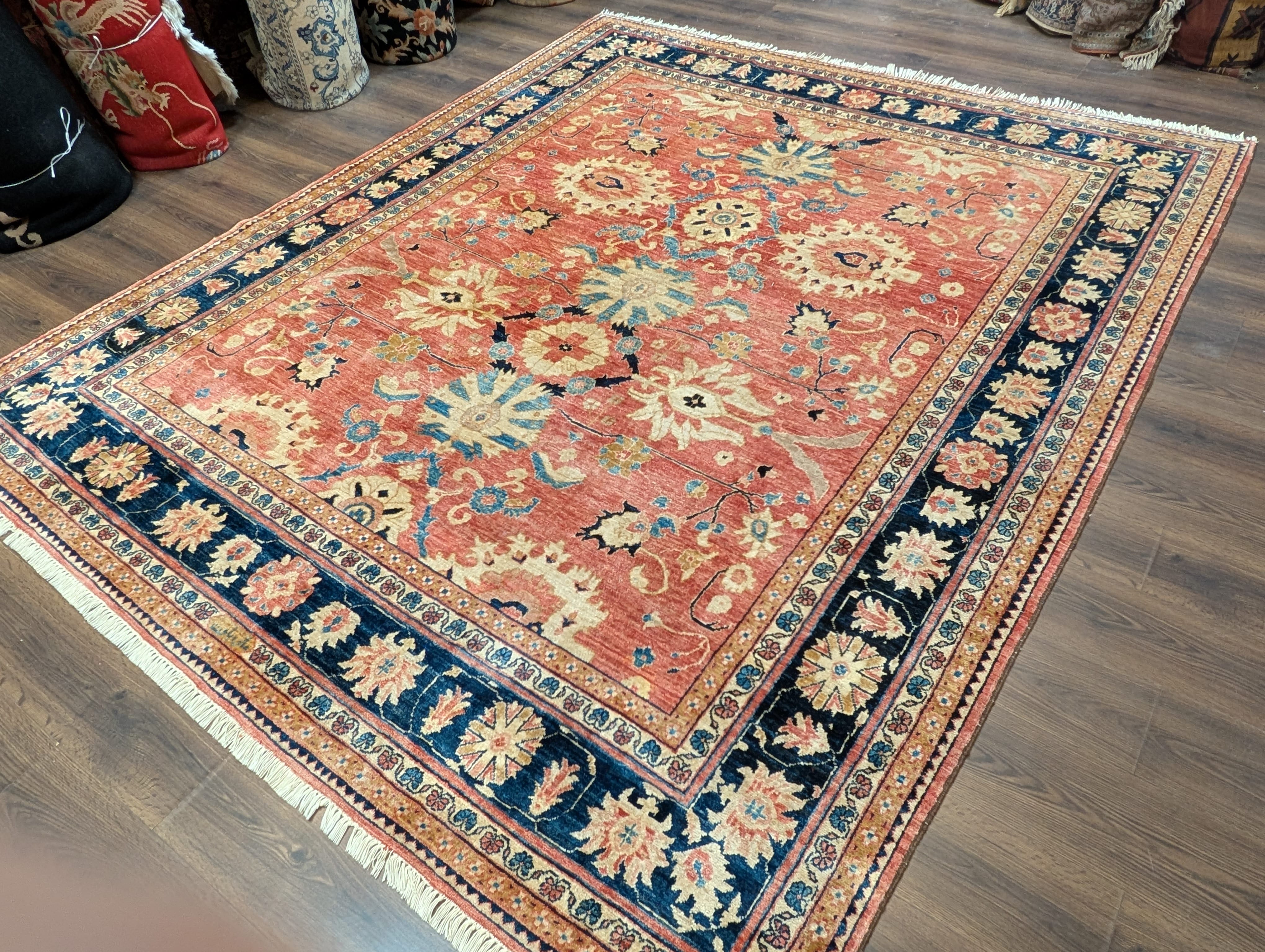 Persian Sultanabad Rug 8x10, Coral and Blue, Allover Pattern, Mahal Carpet, Wool