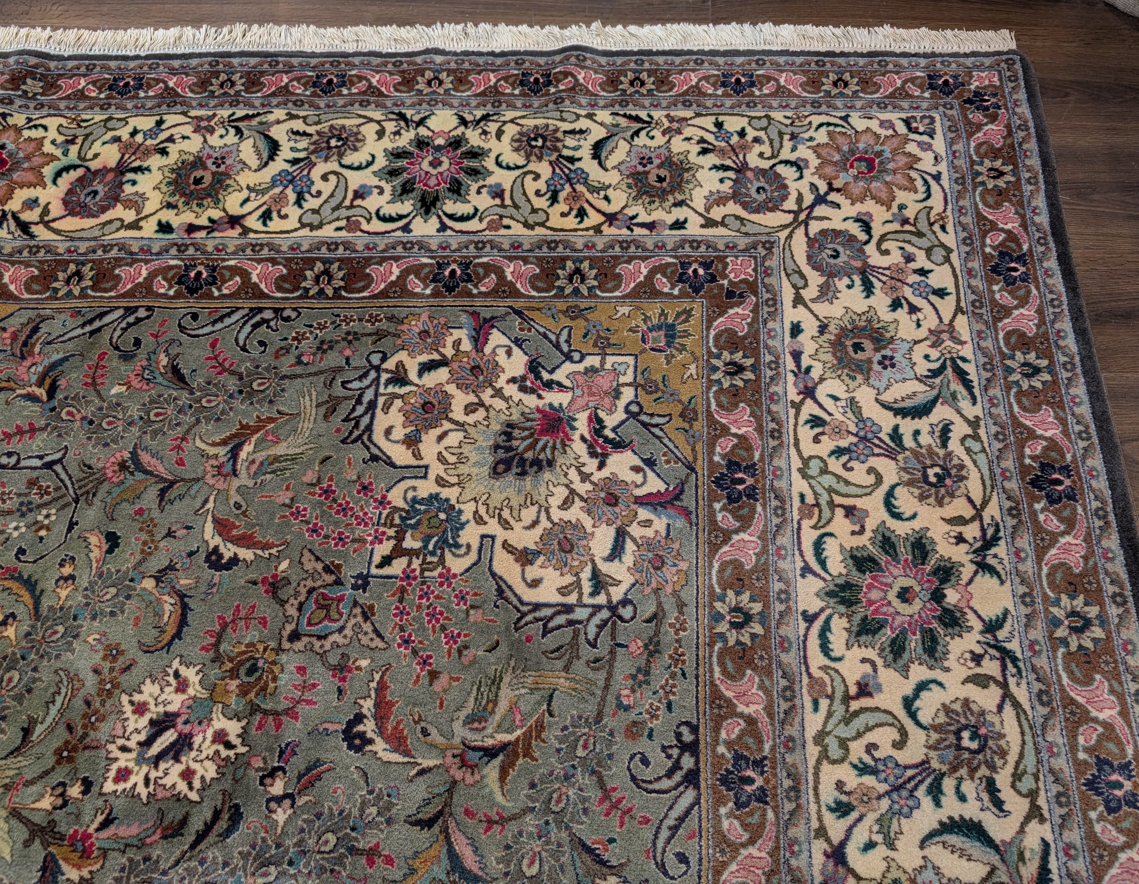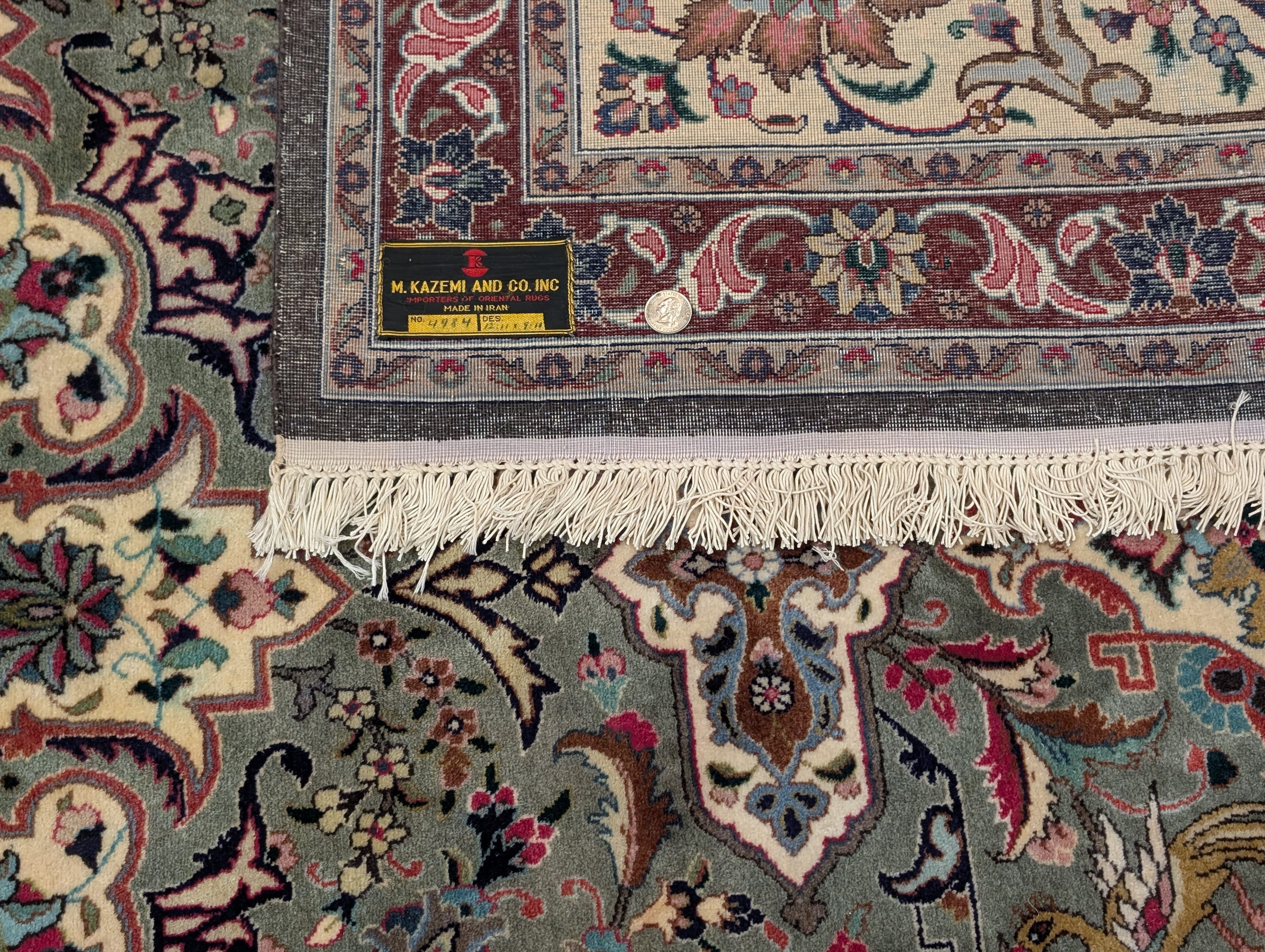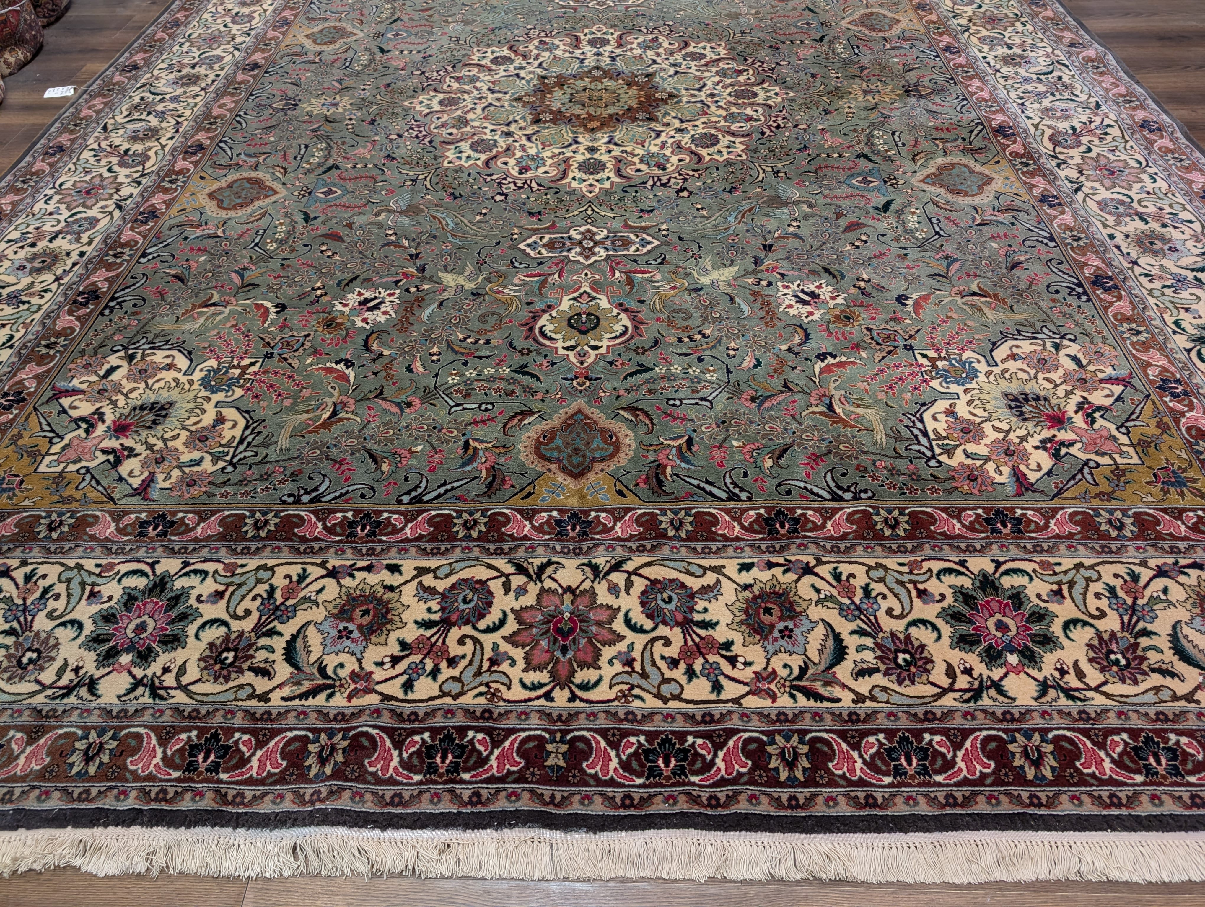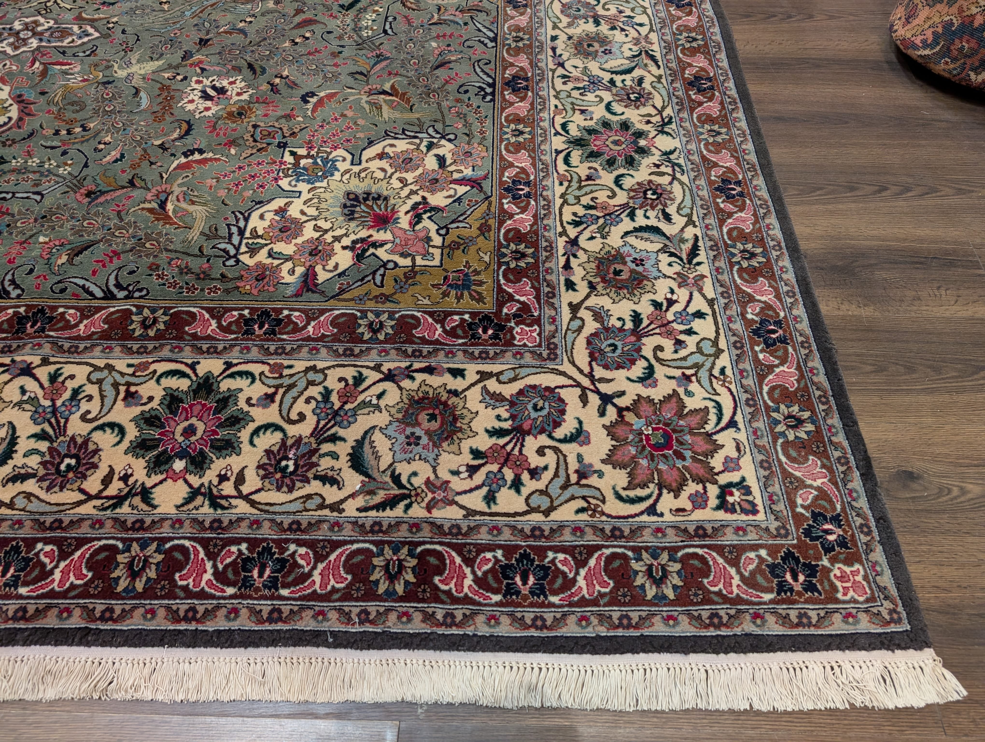 Persian Tabriz Rug 10x13, Bird Pictorials, Green and Ivory, Excellent