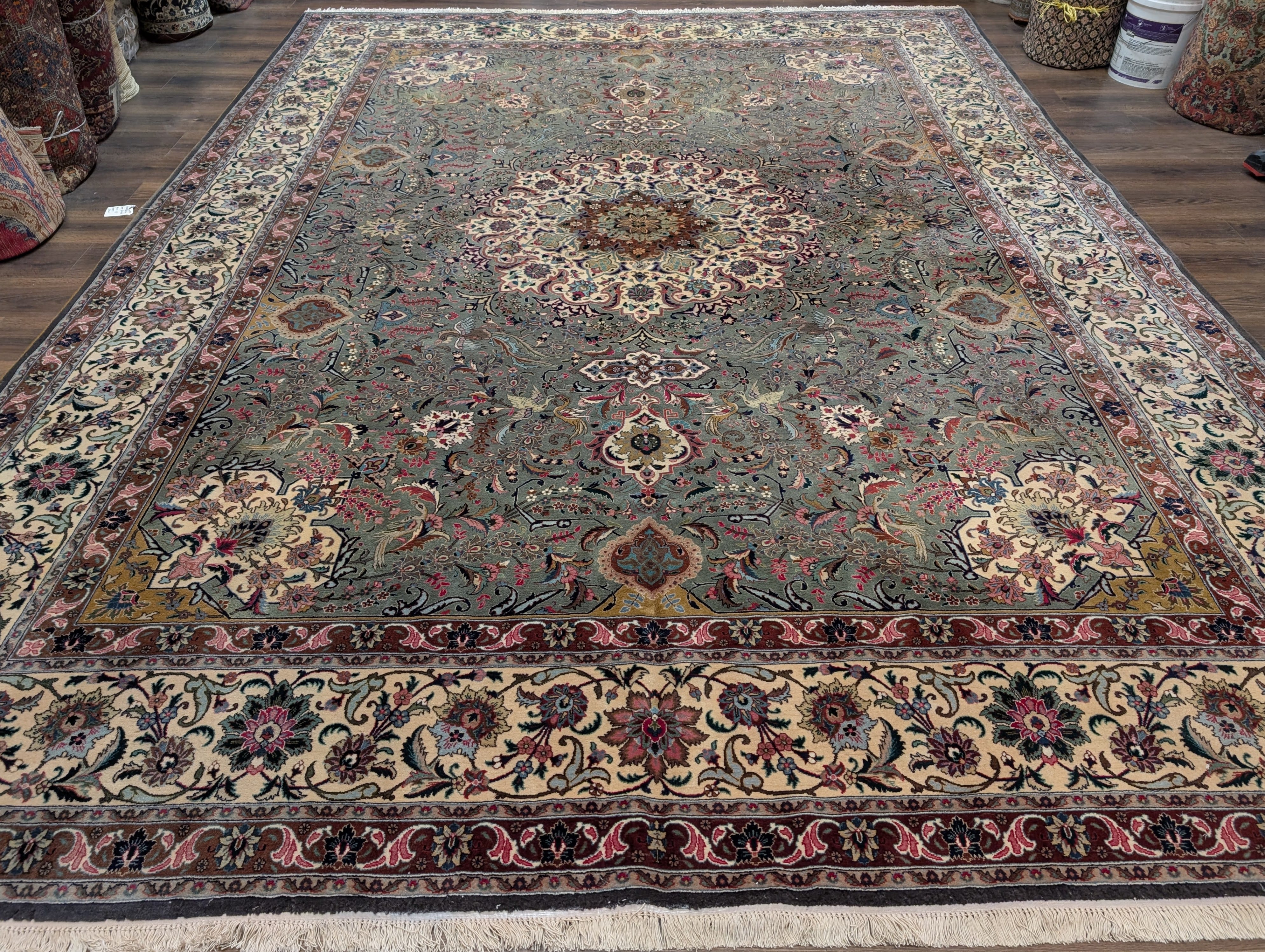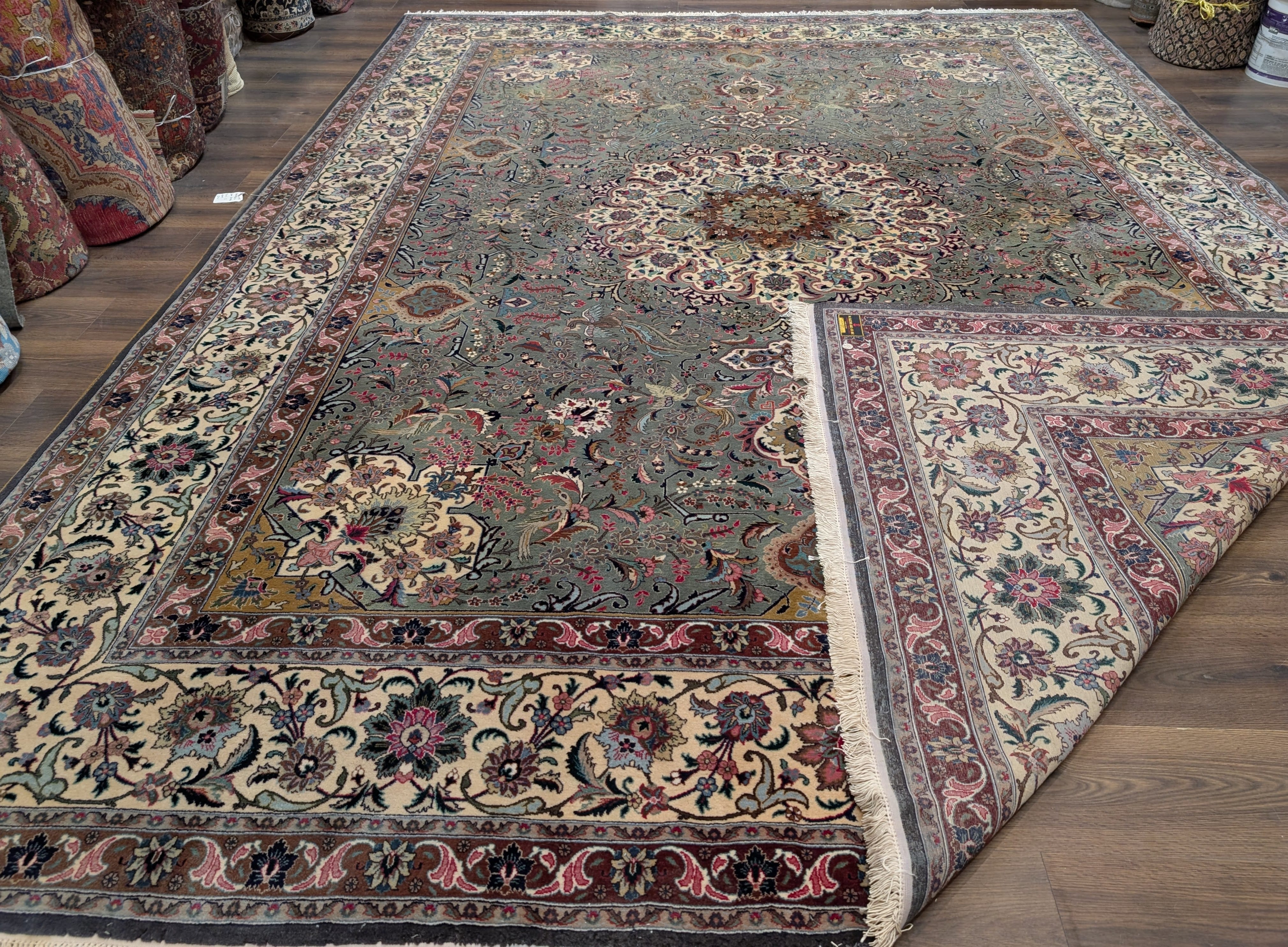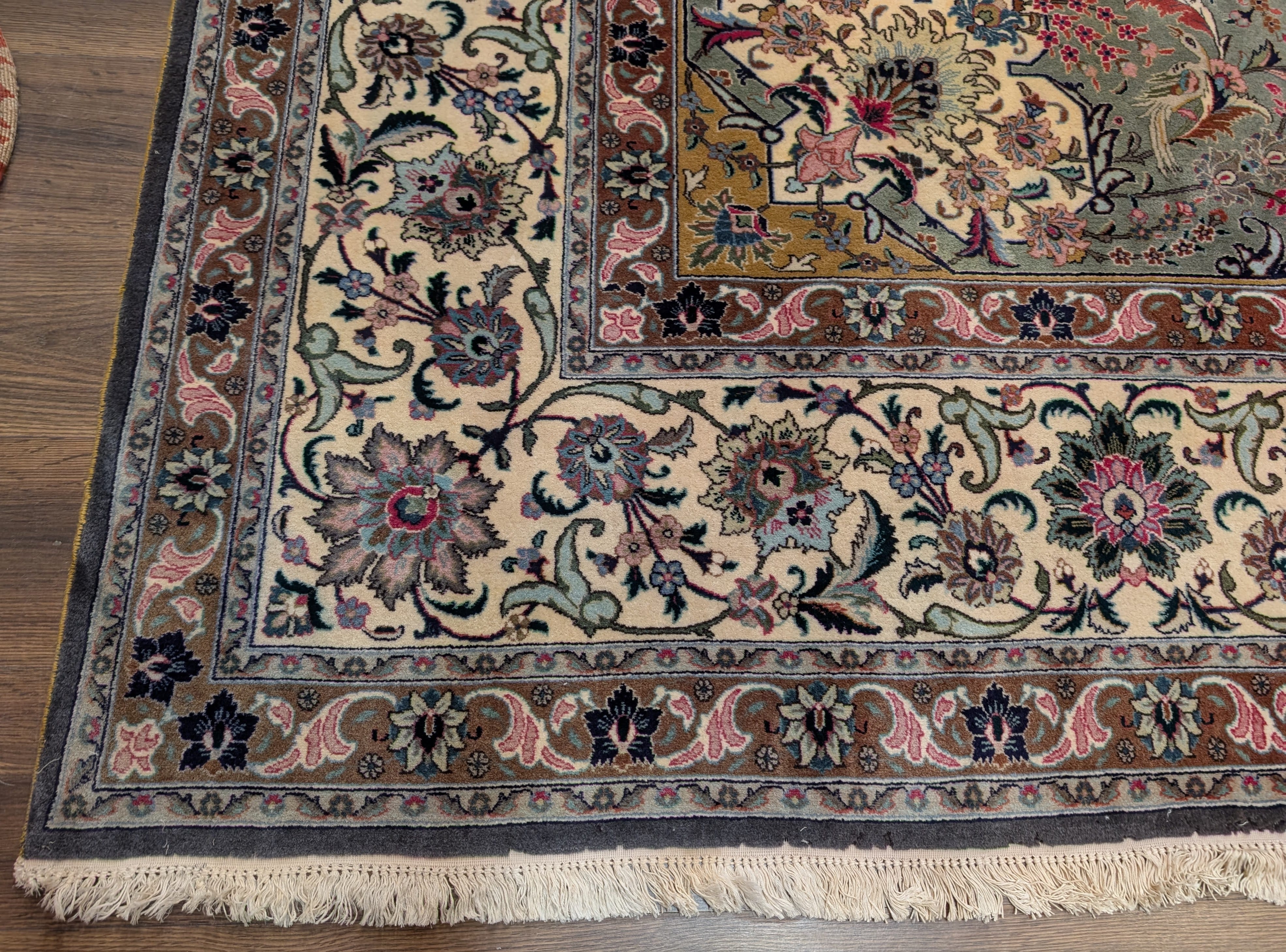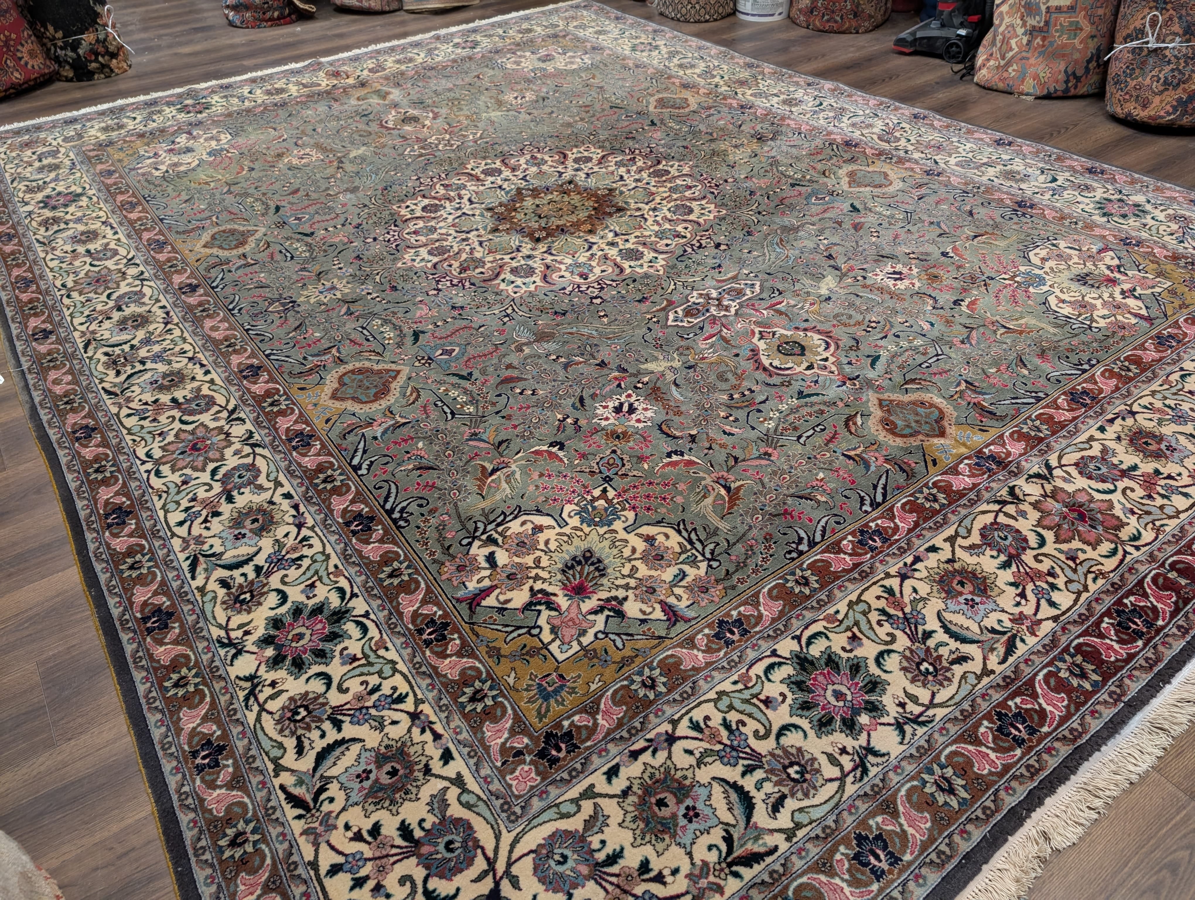 Persian Tabriz Rug 10x13, Bird Pictorials, Green and Ivory, Excellent