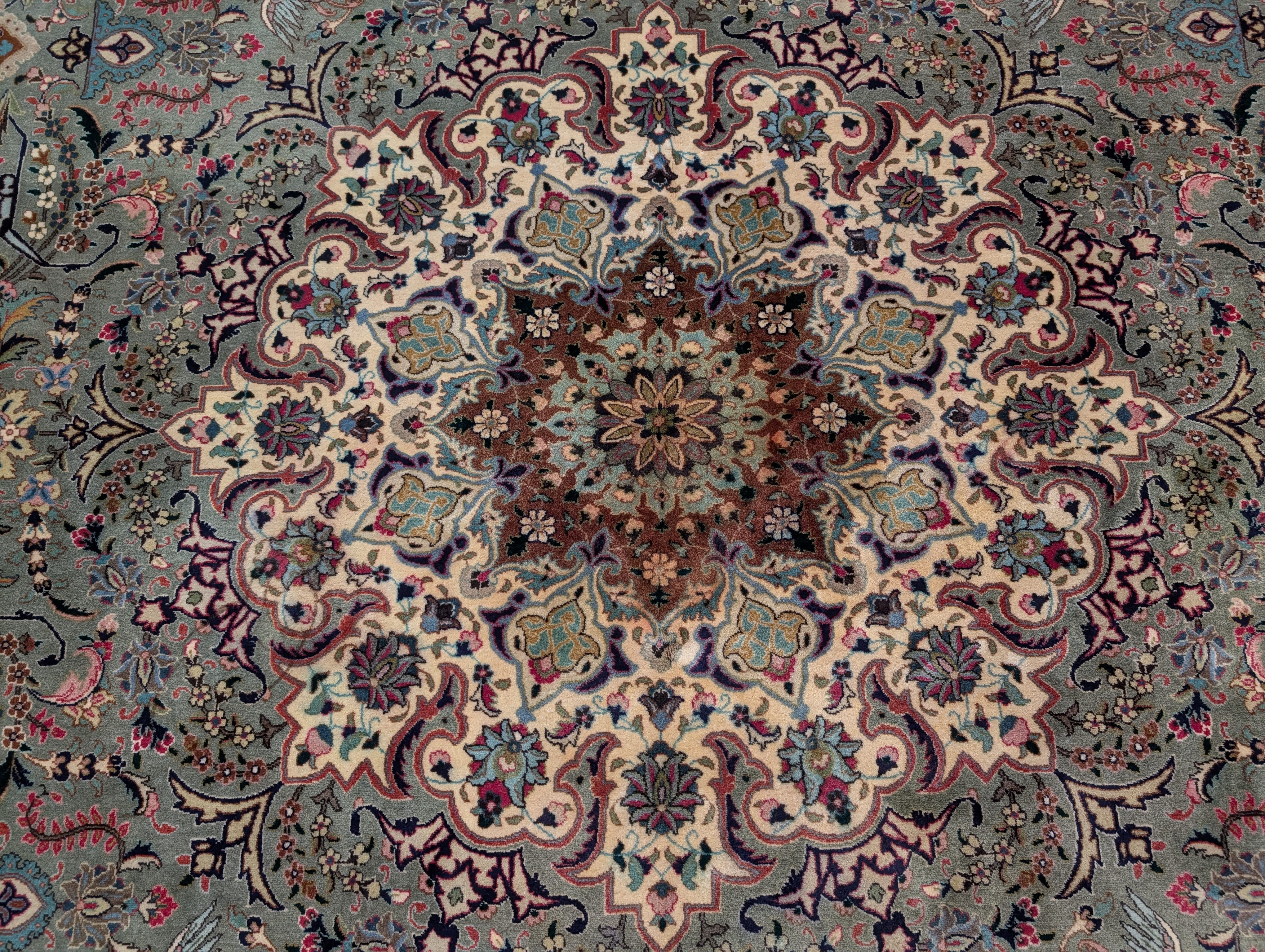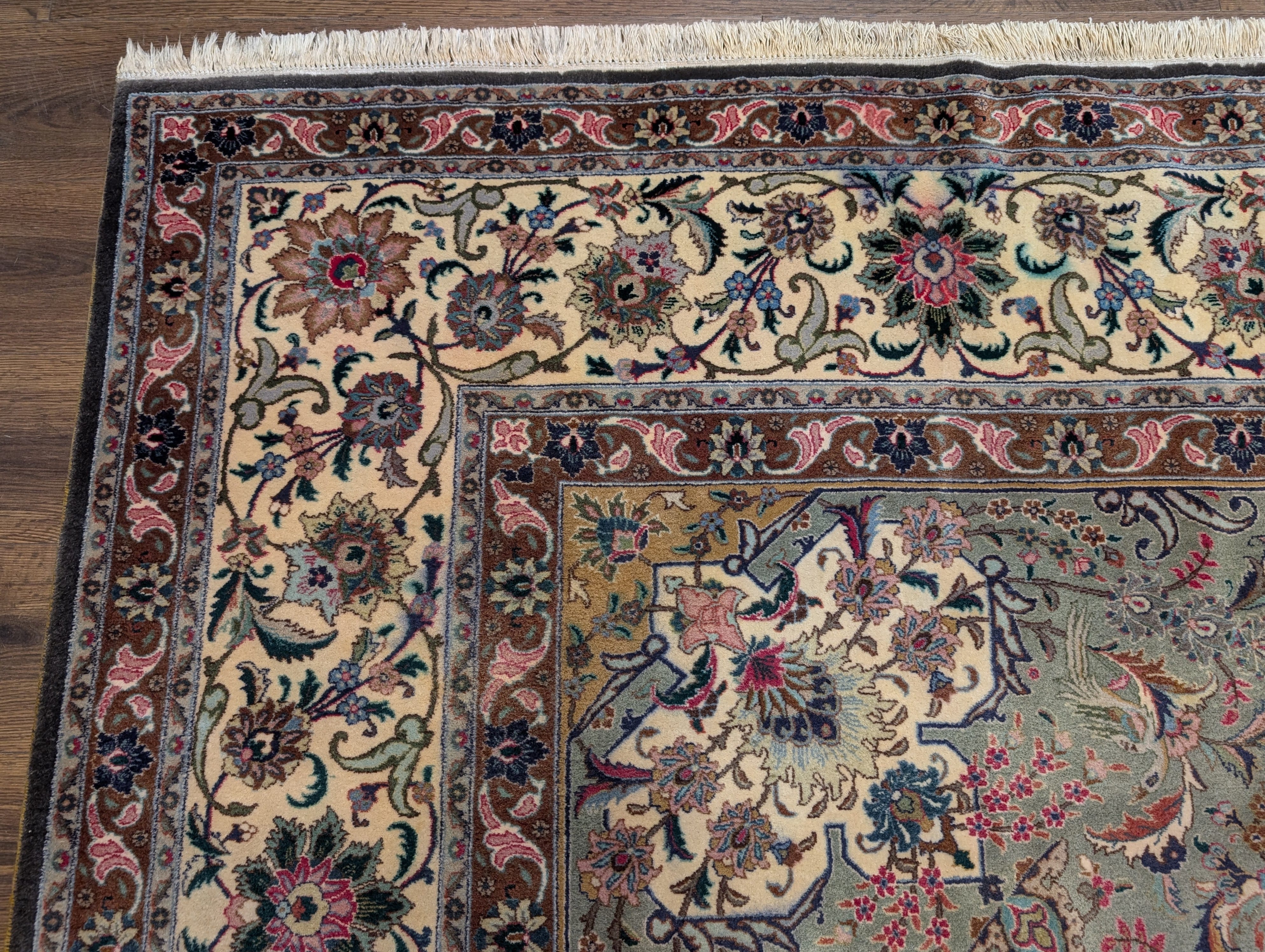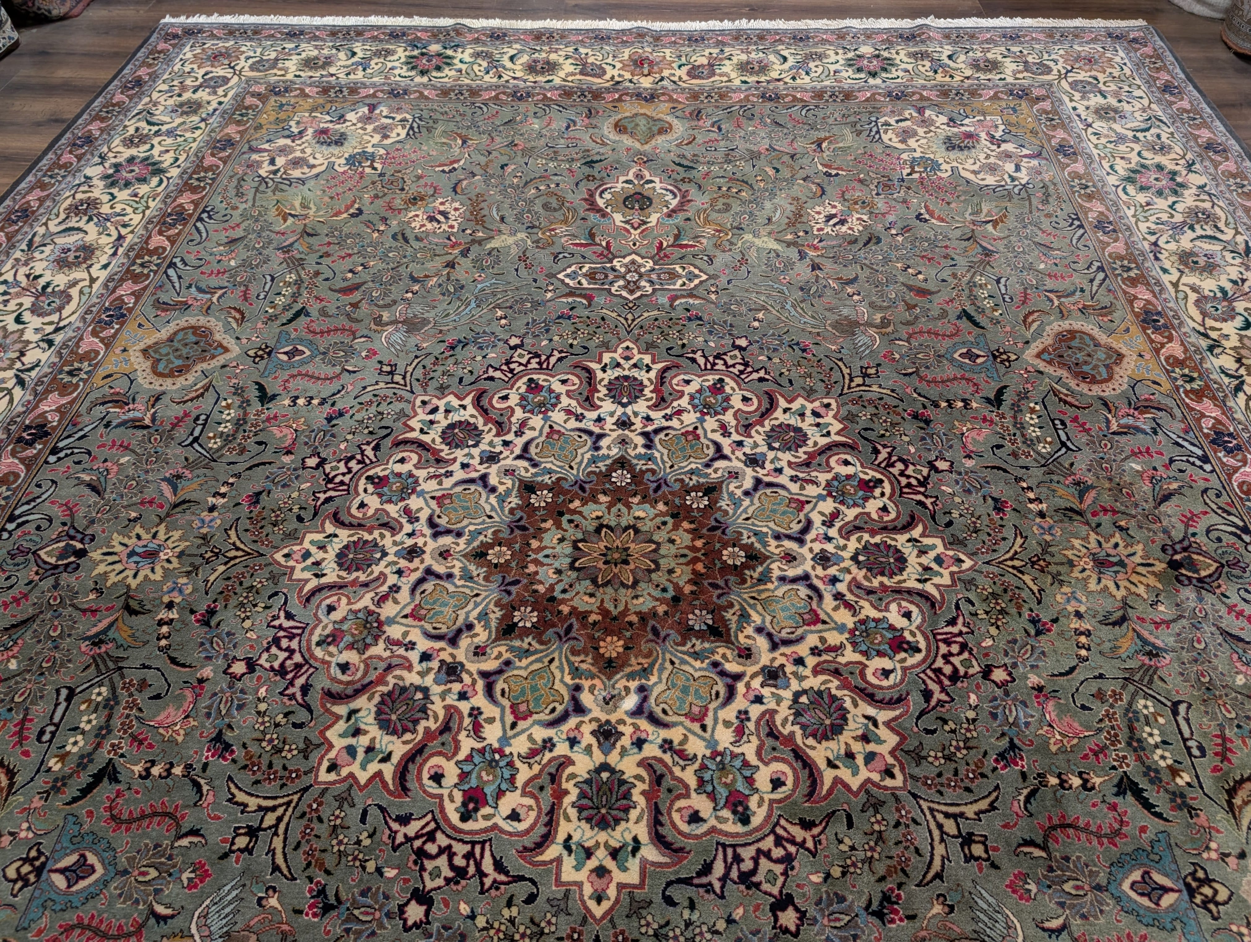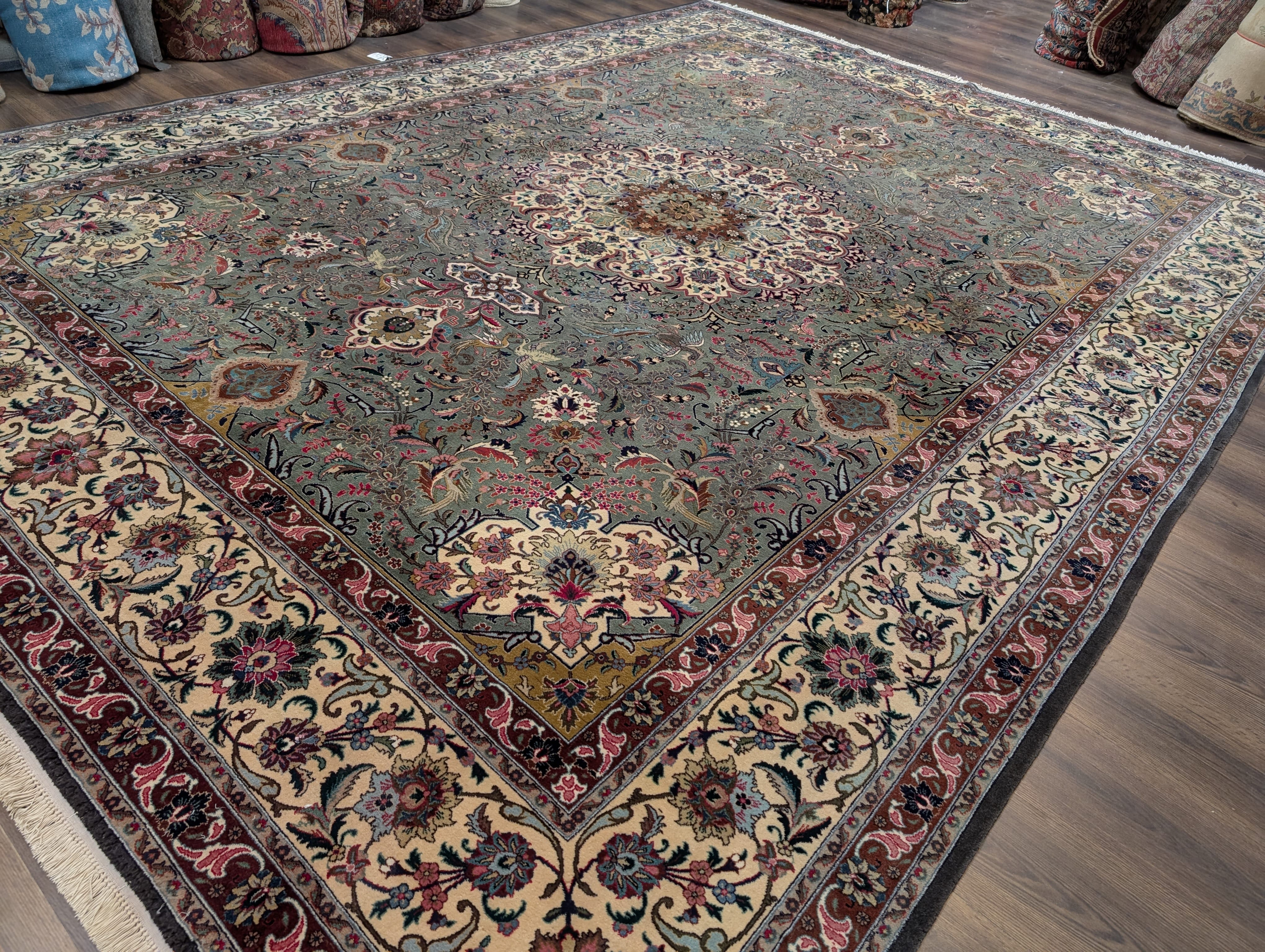 Persian Tabriz Rug 10x13, Bird Pictorials, Green and Ivory, Excellent