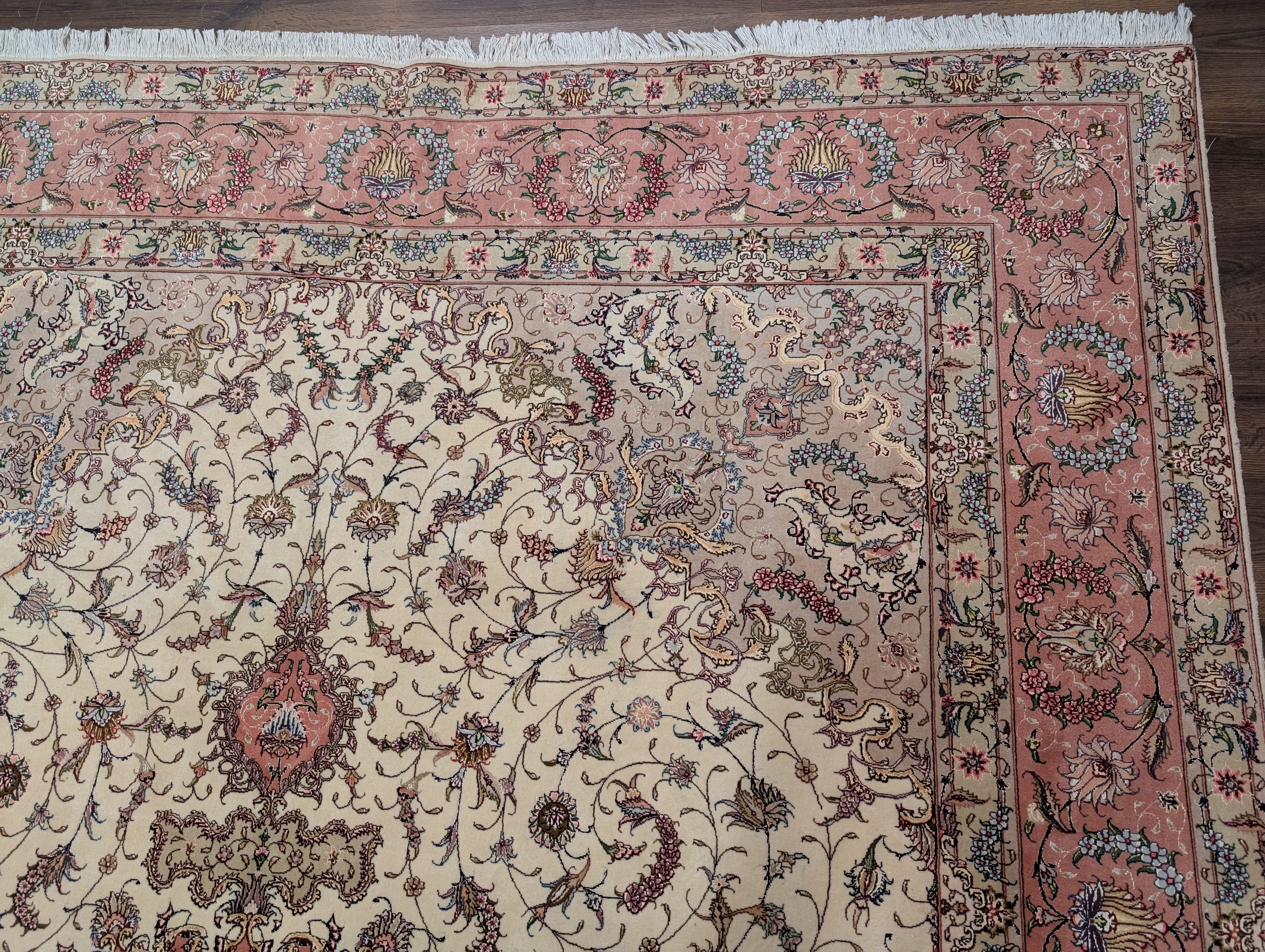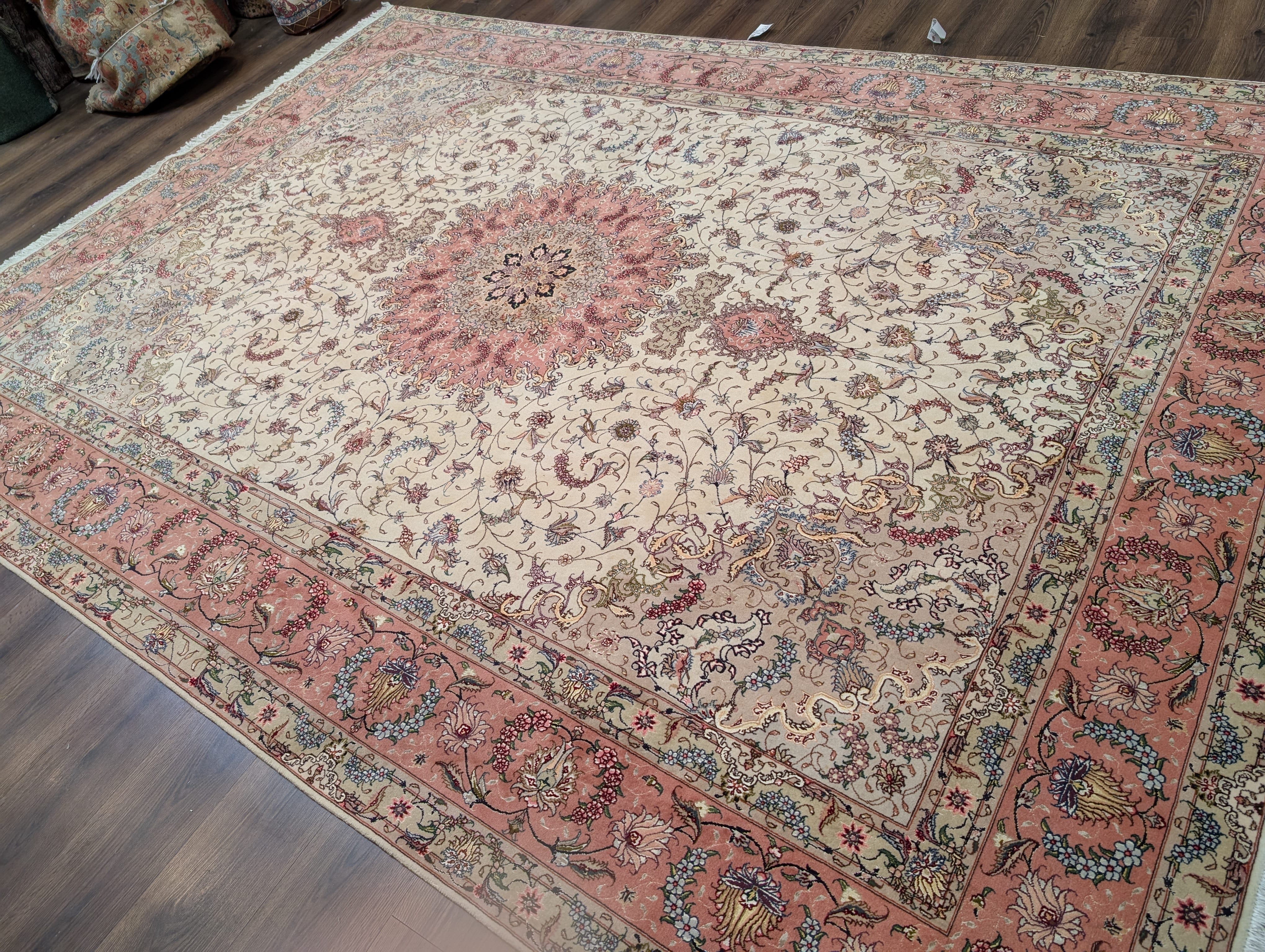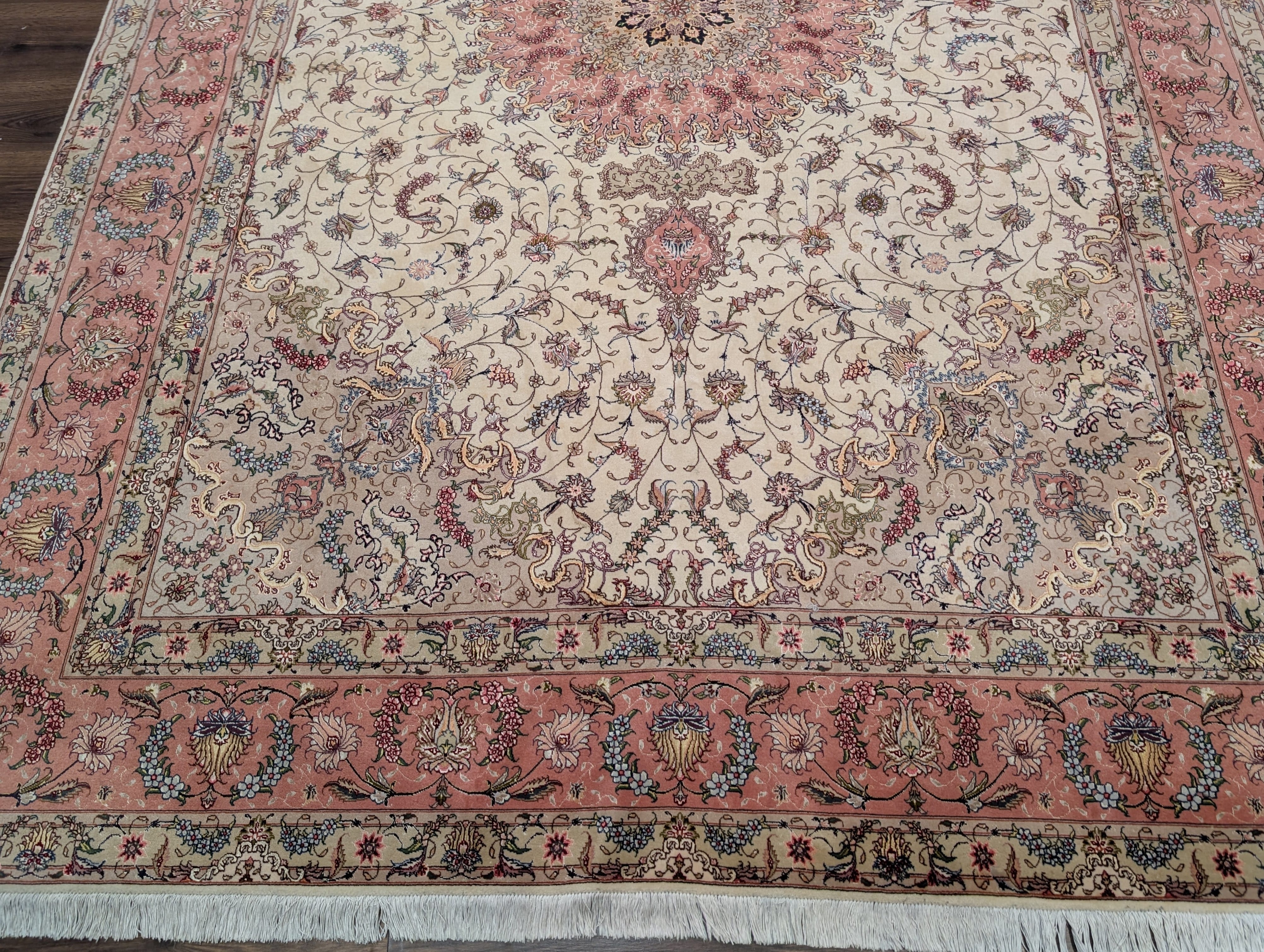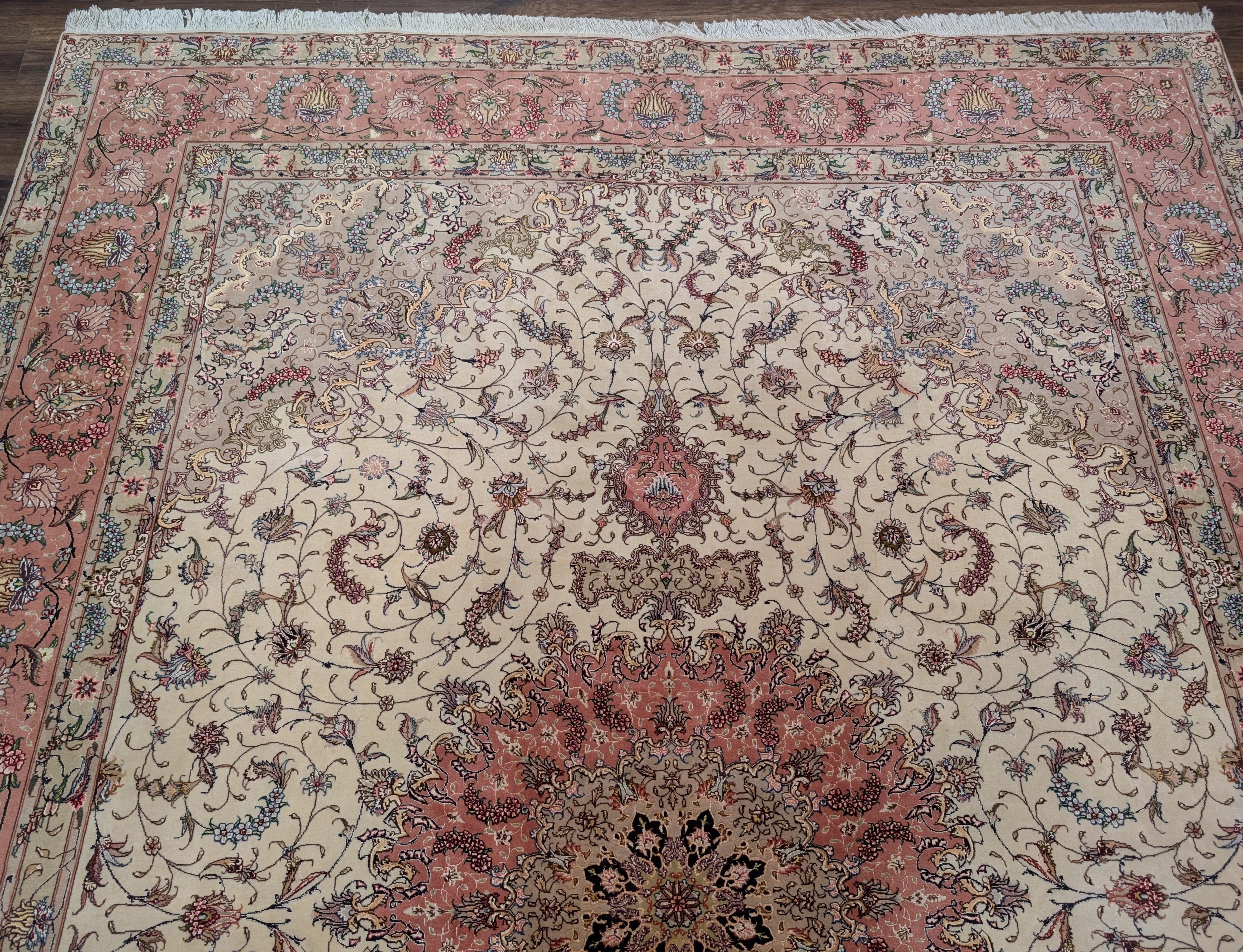 Persian Tabriz Rug 8x11, Floral Medallion, Fine 330 KPSI, Ivory Pink, Wool & Silk