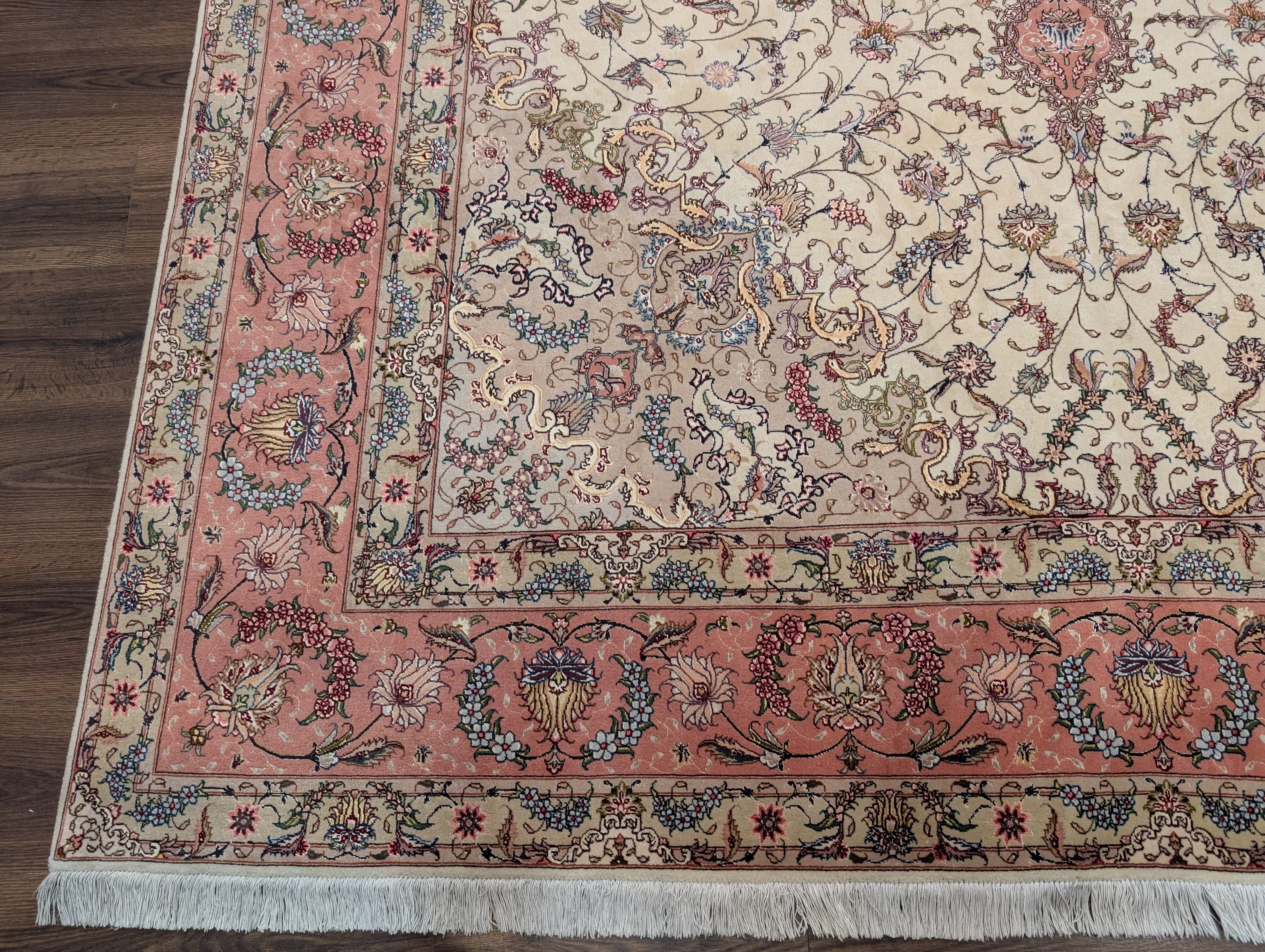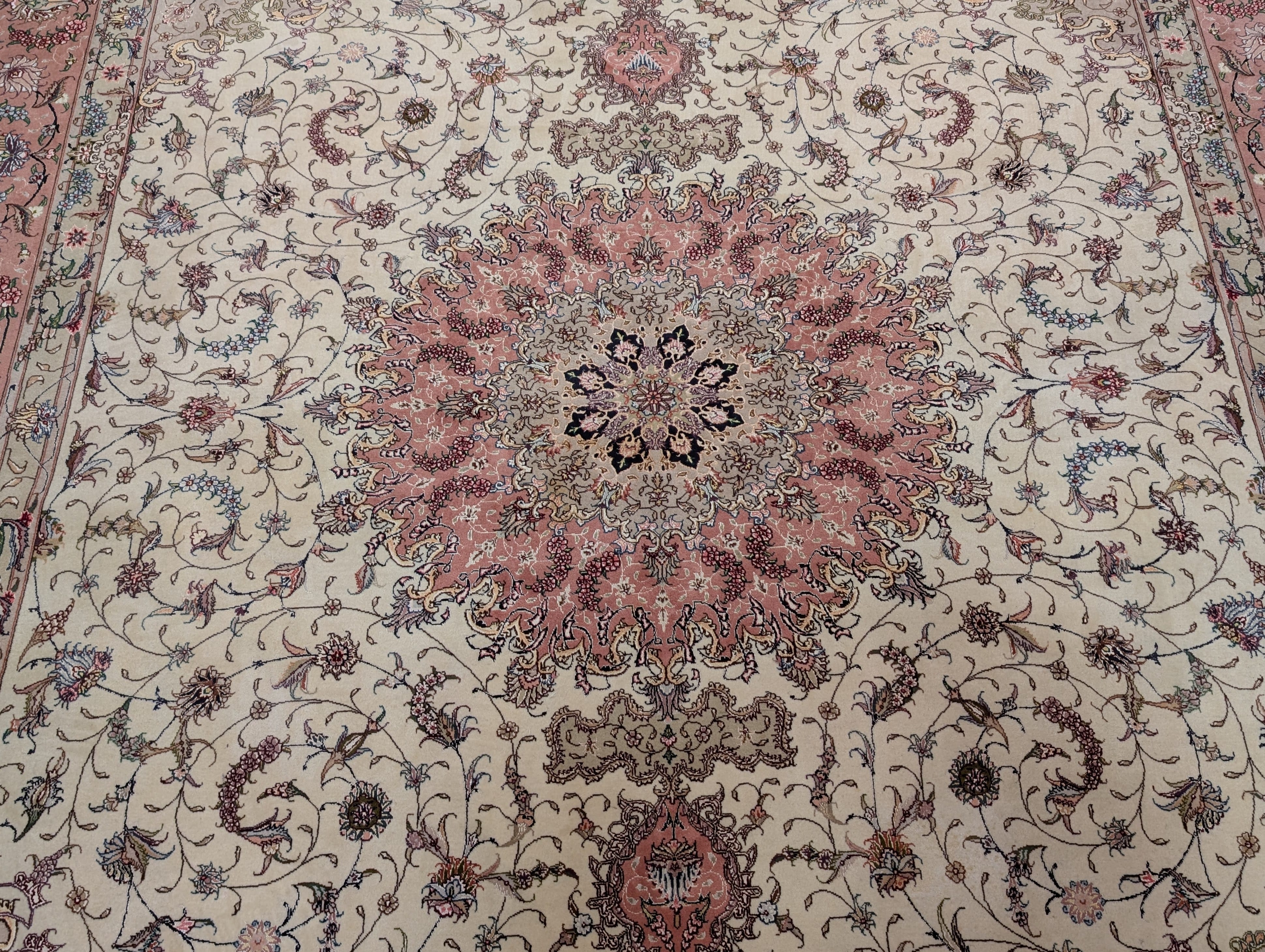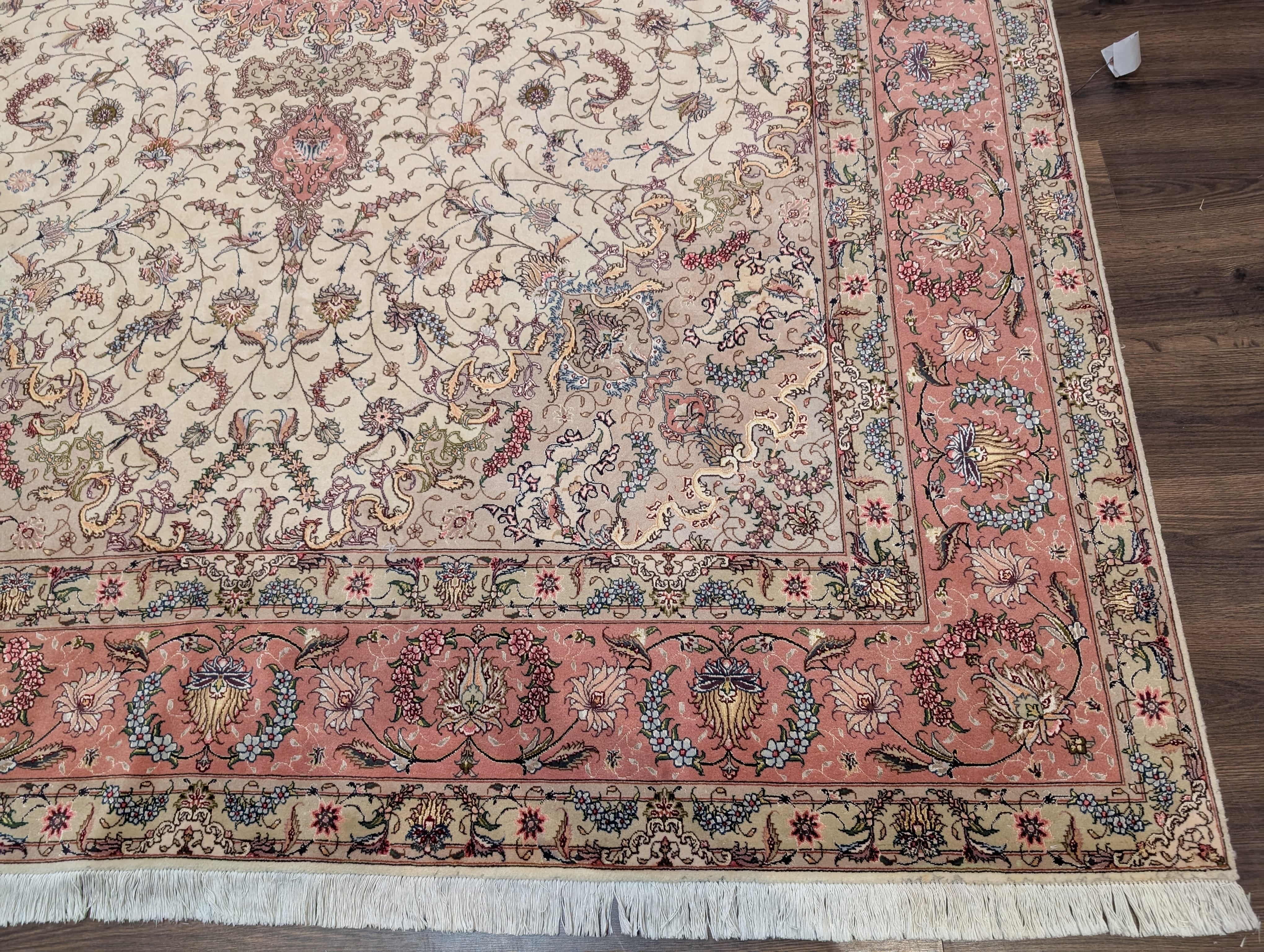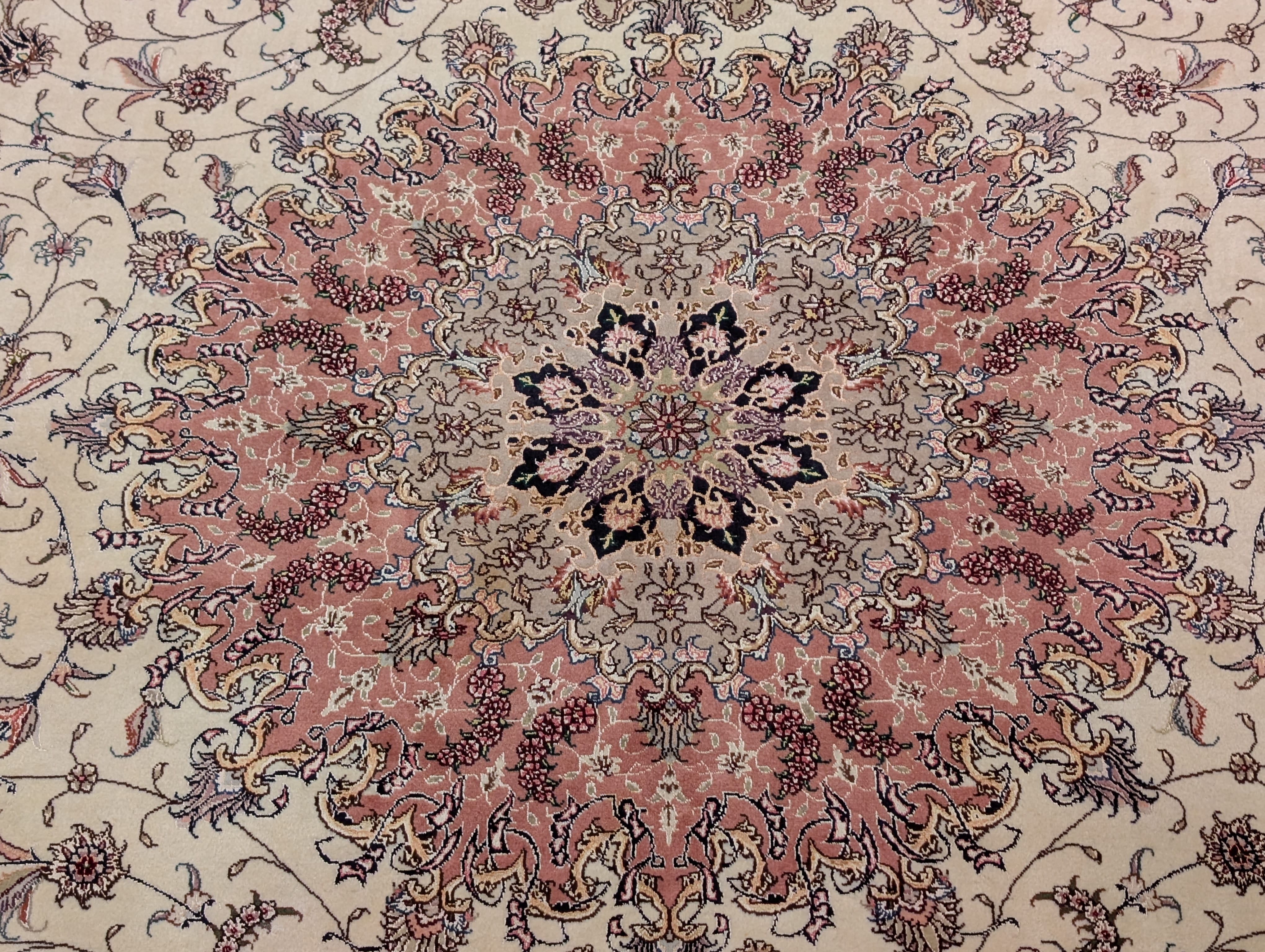 Persian Tabriz Rug 8x11, Floral Medallion, Fine 330 KPSI, Ivory Pink, Wool & Silk