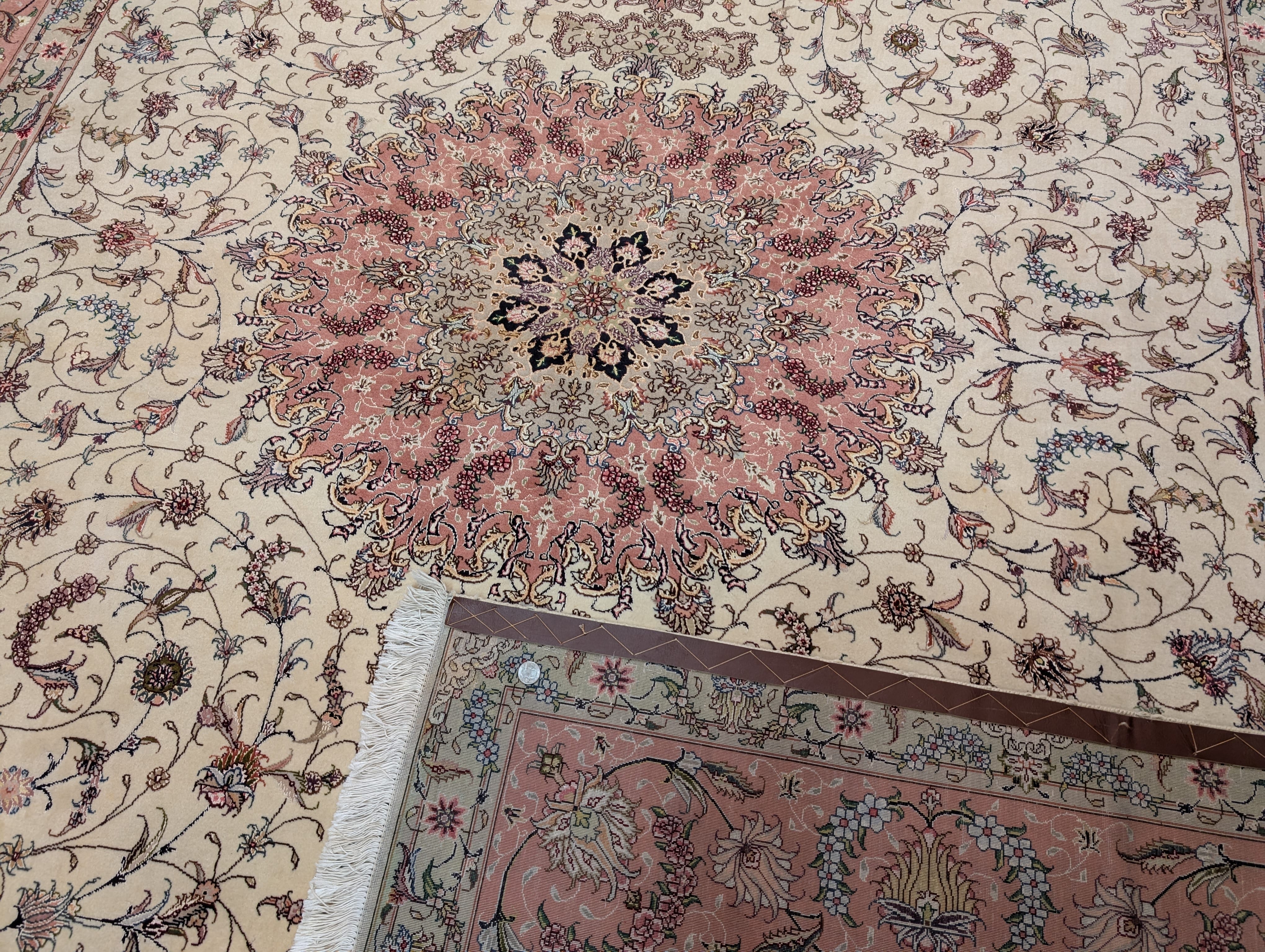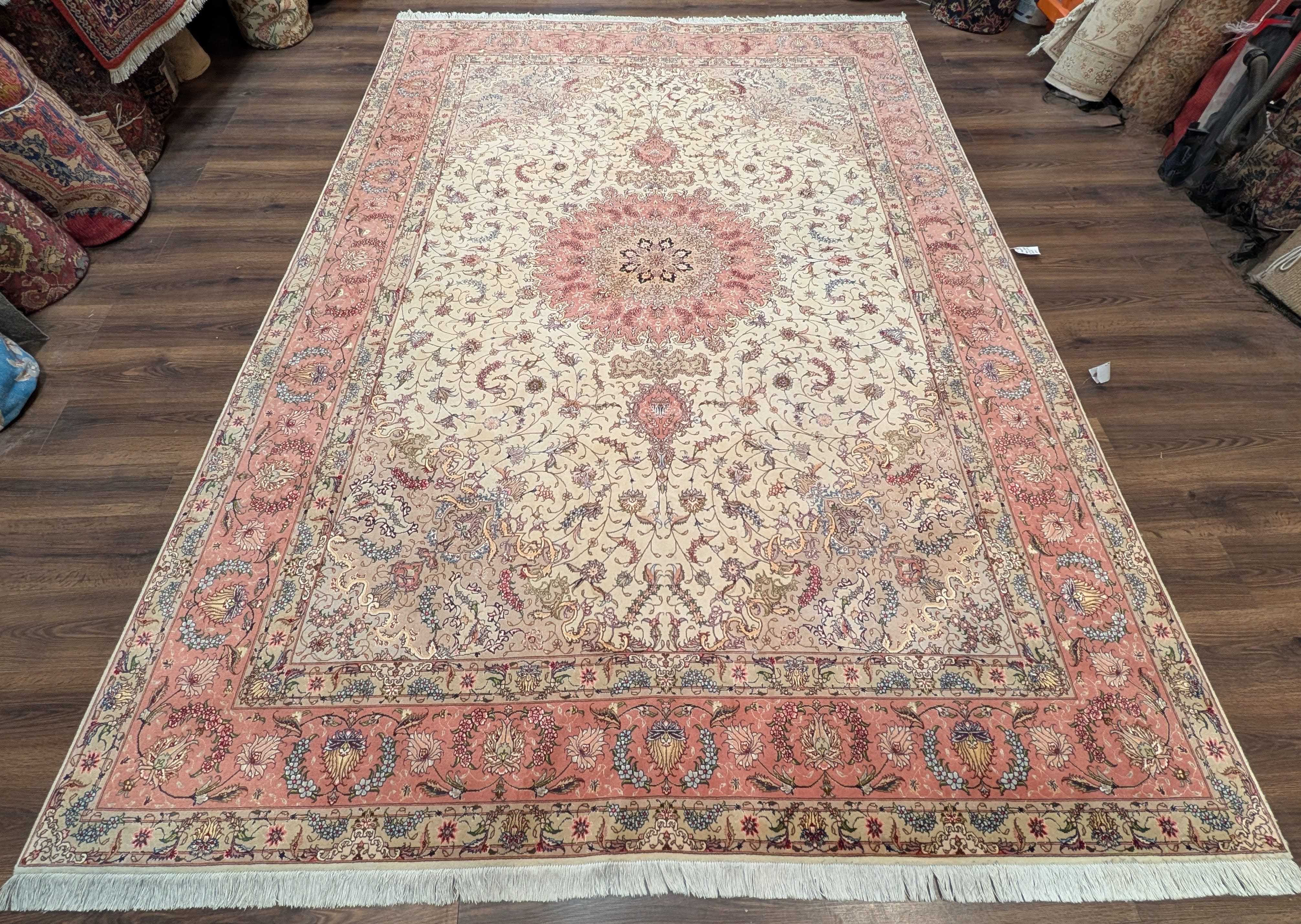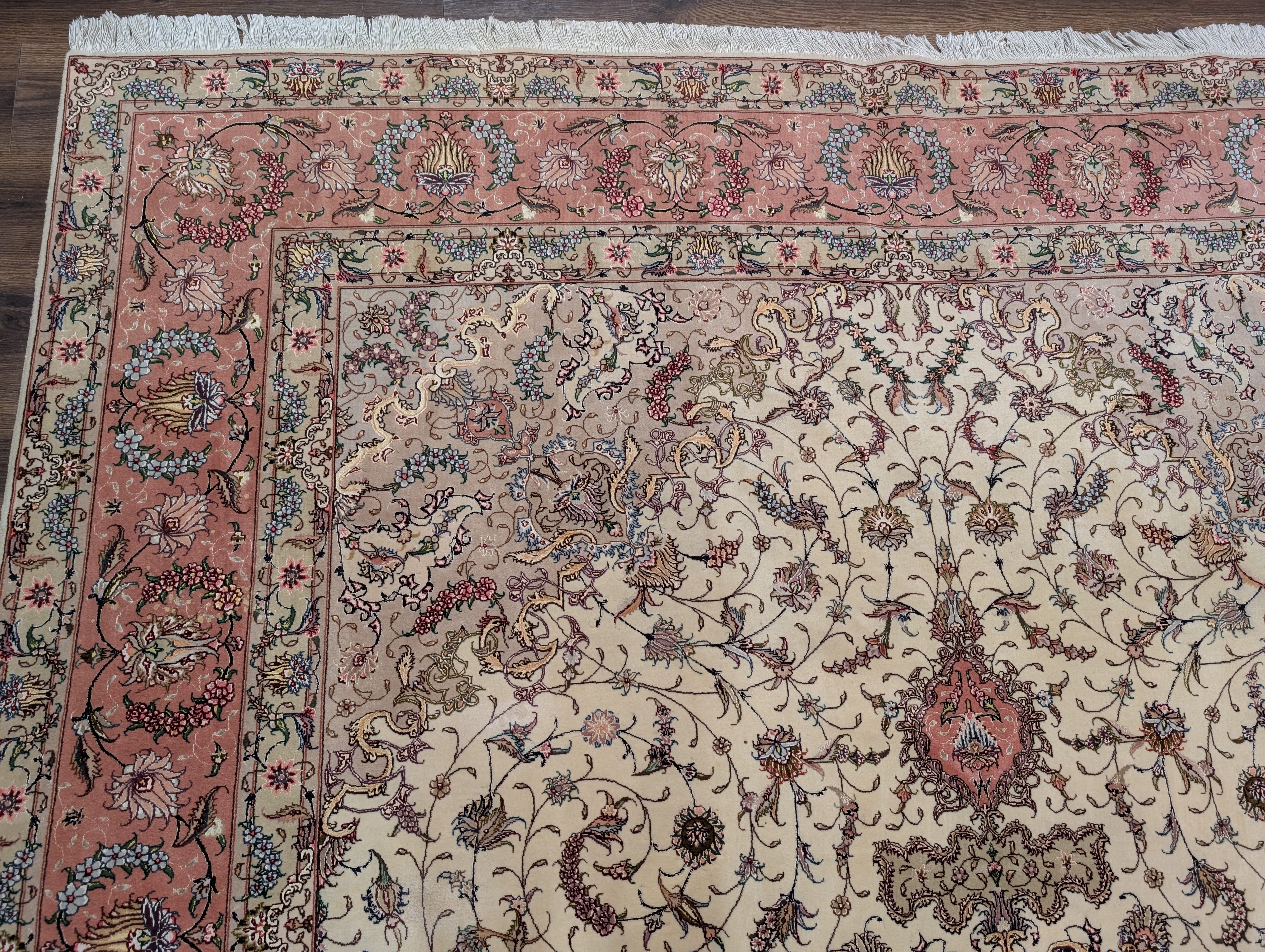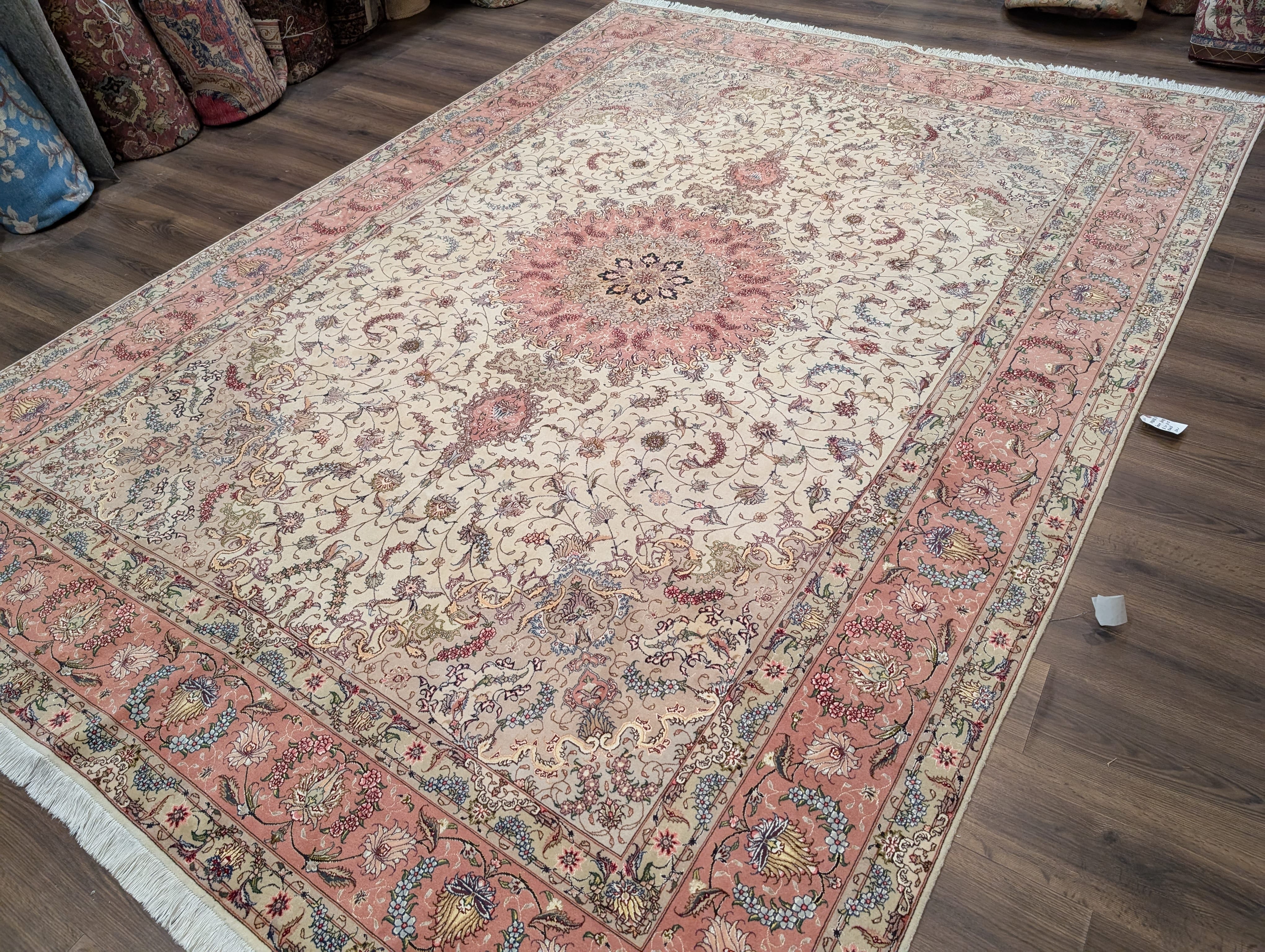 Persian Tabriz Rug 8x11, Floral Medallion, Fine 330 KPSI, Ivory Pink, Wool & Silk