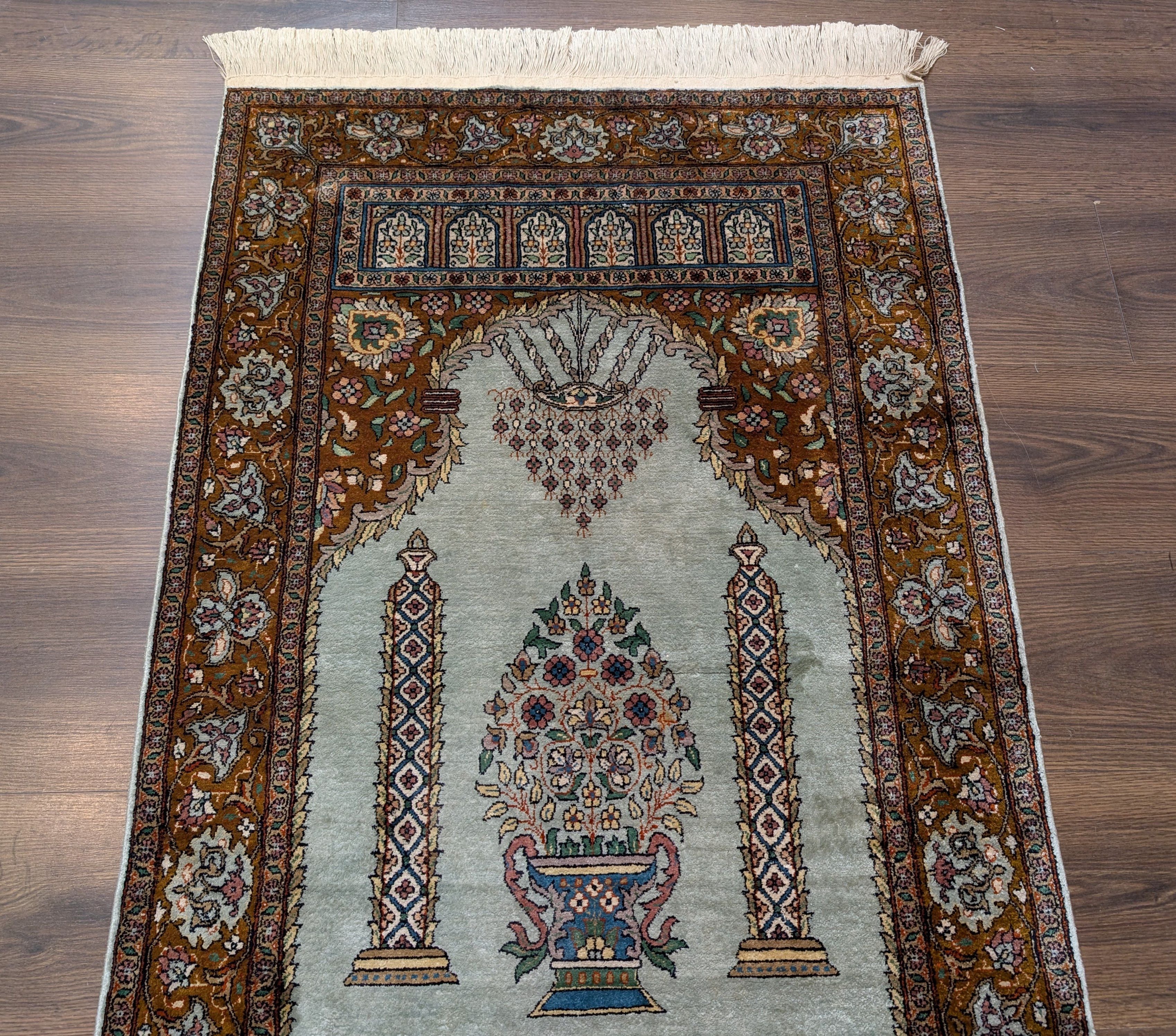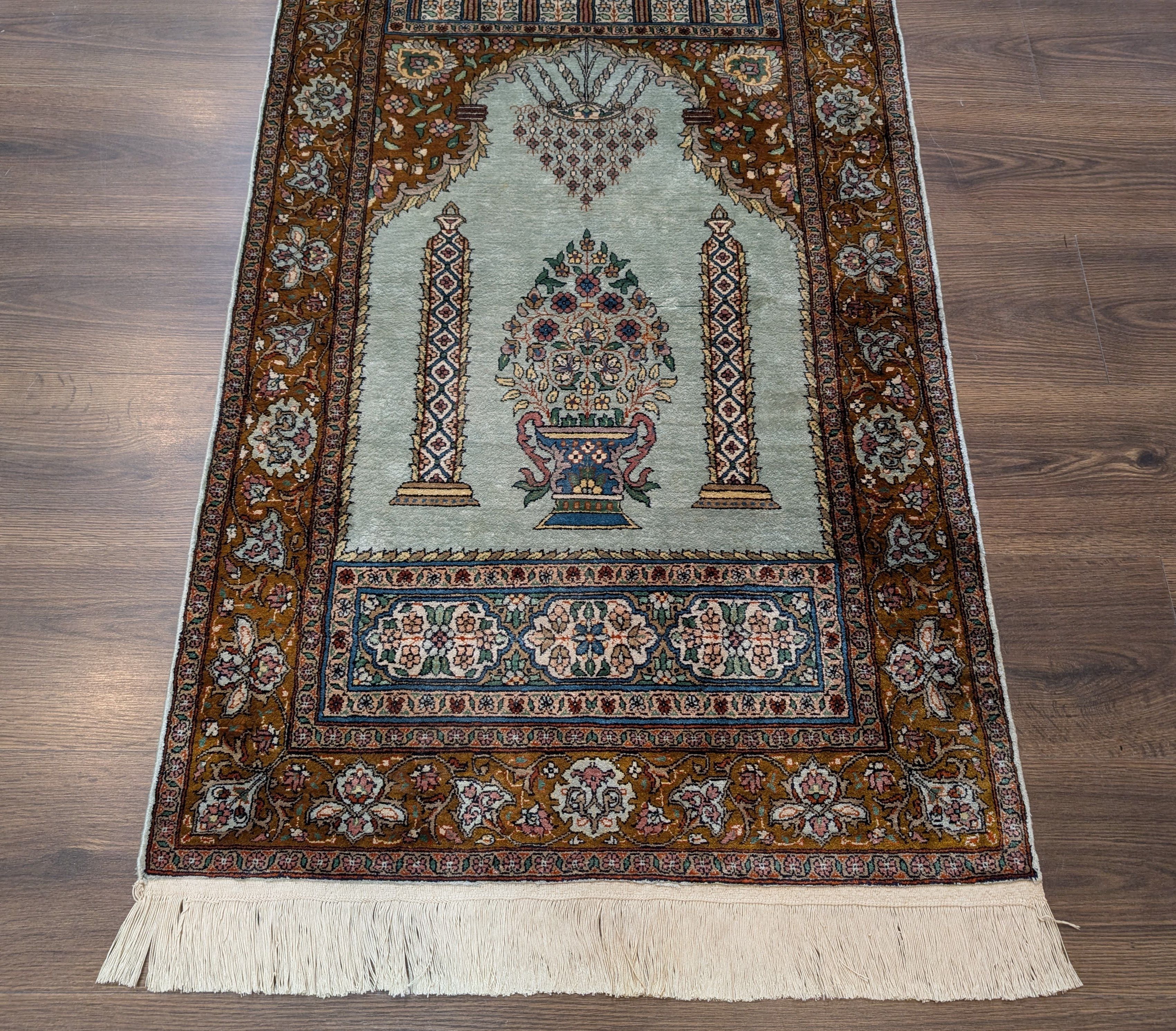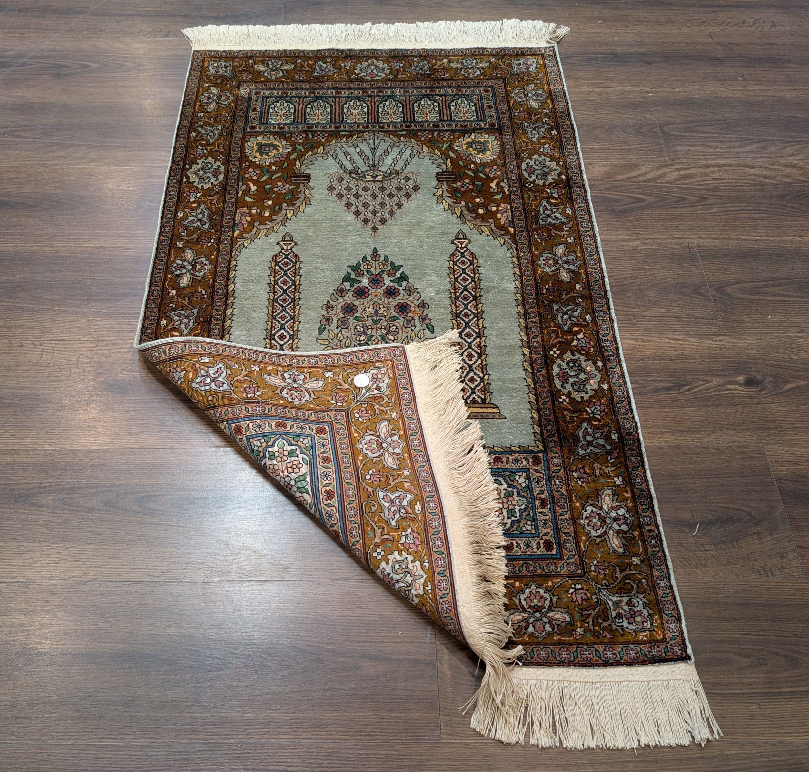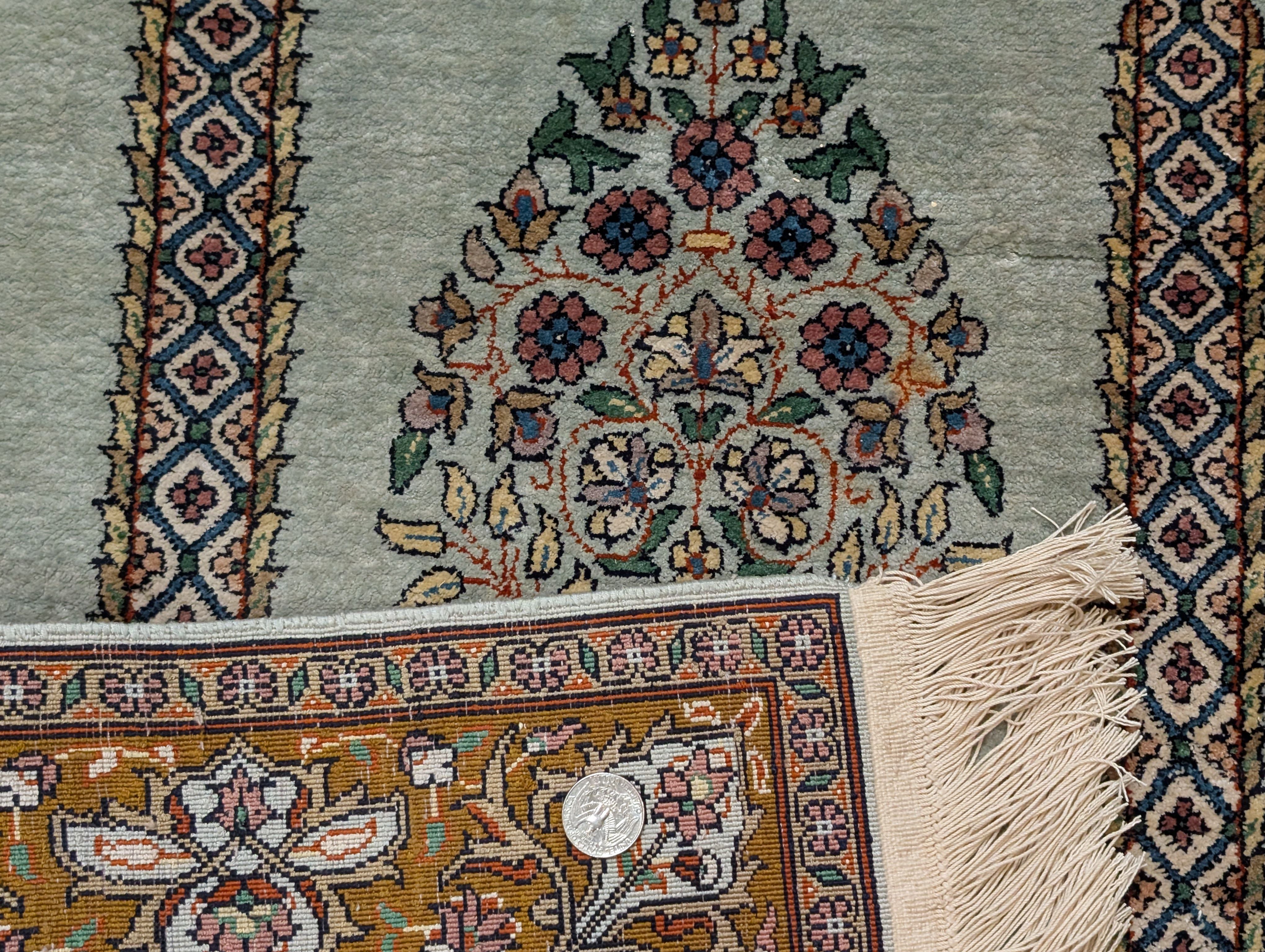 Silk Turkish Kayseri Prayer Rug, Light Mint Green, Fine 360 KPSI, Handmade