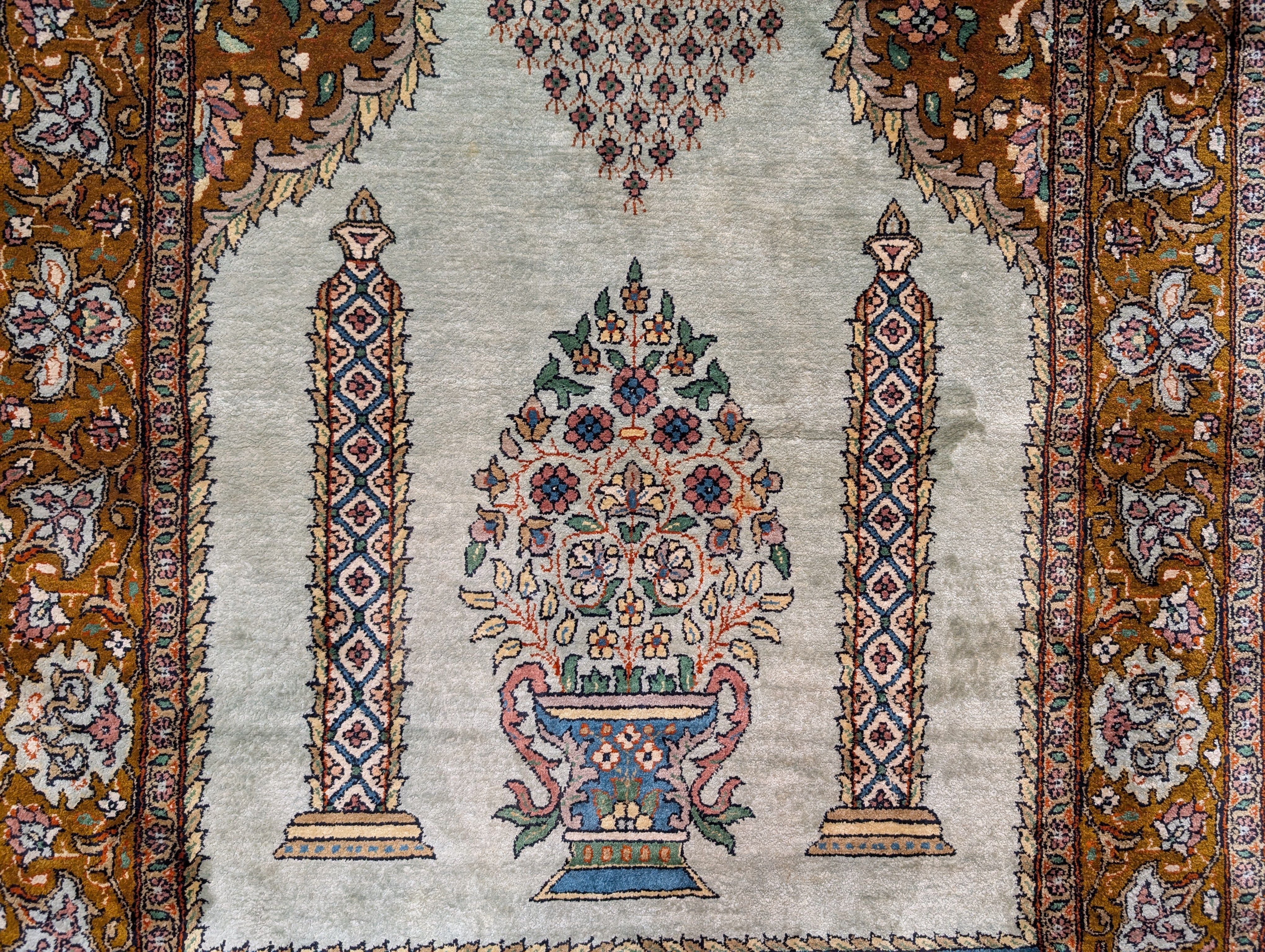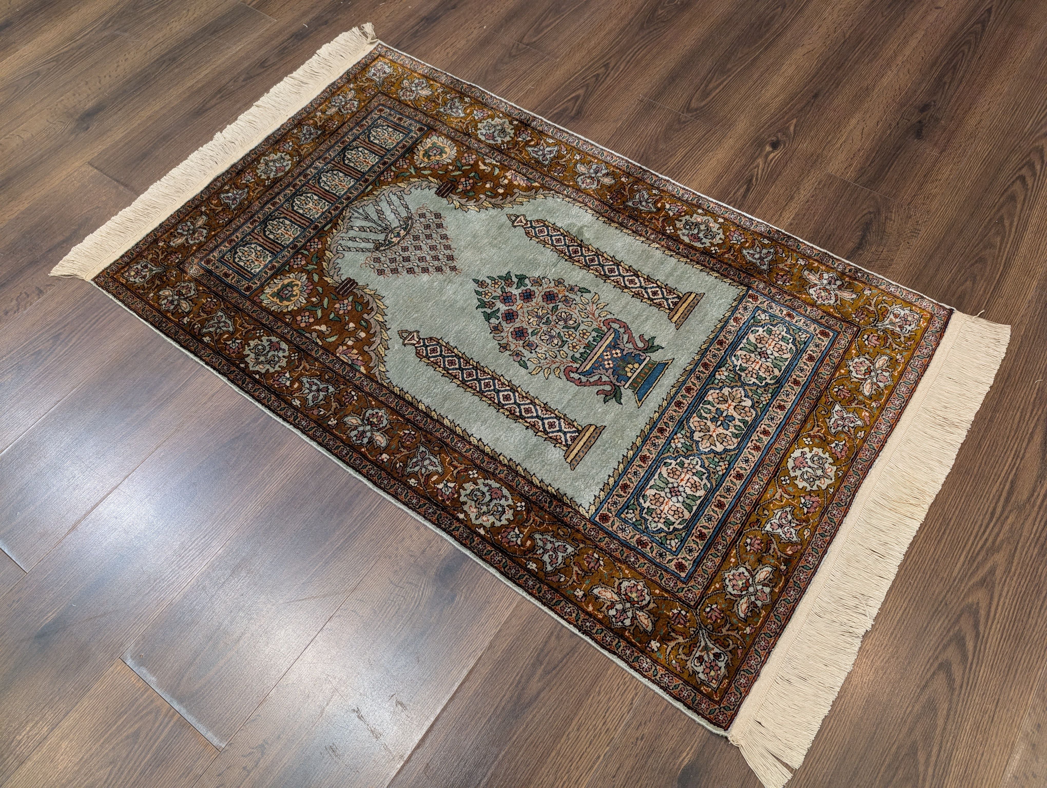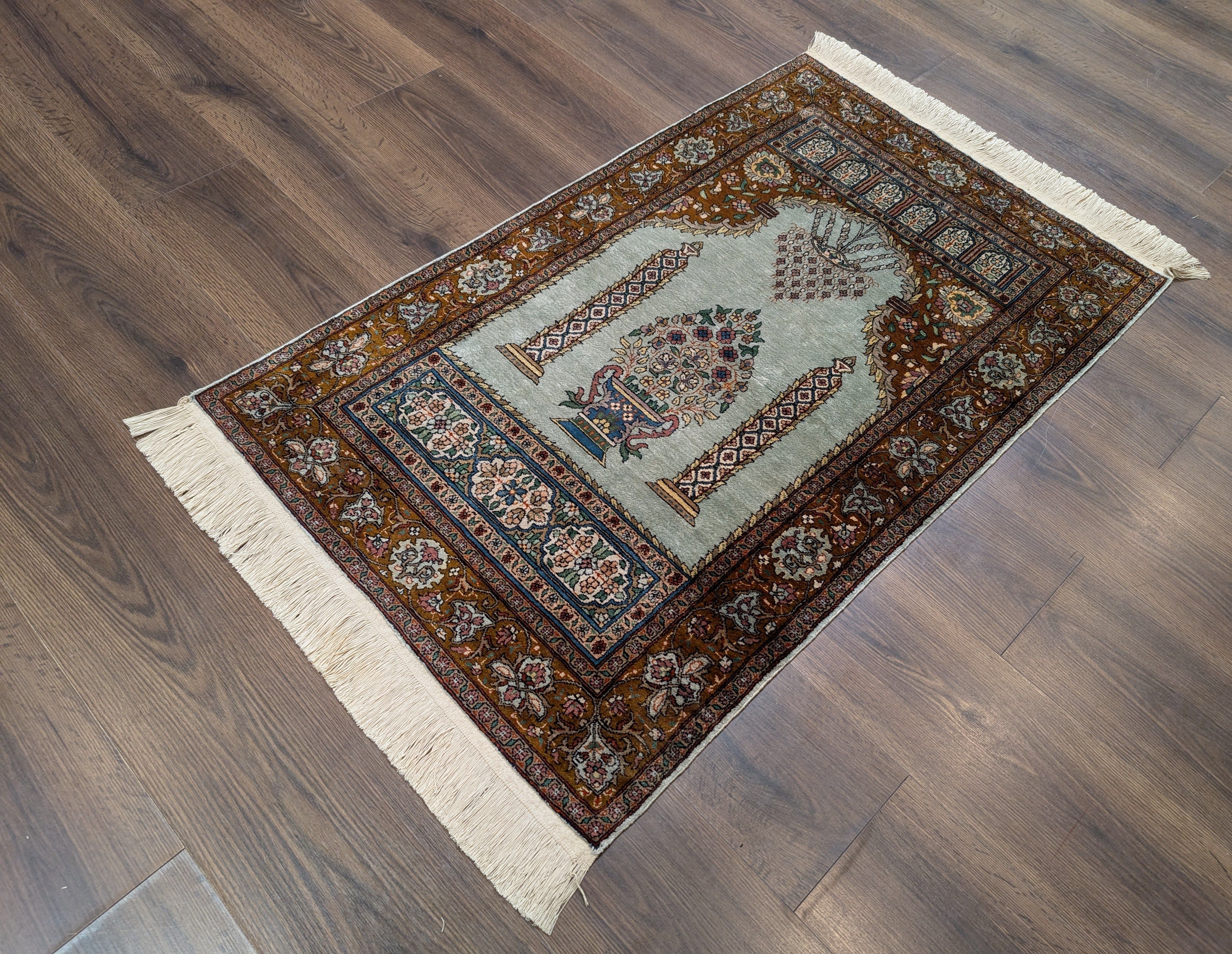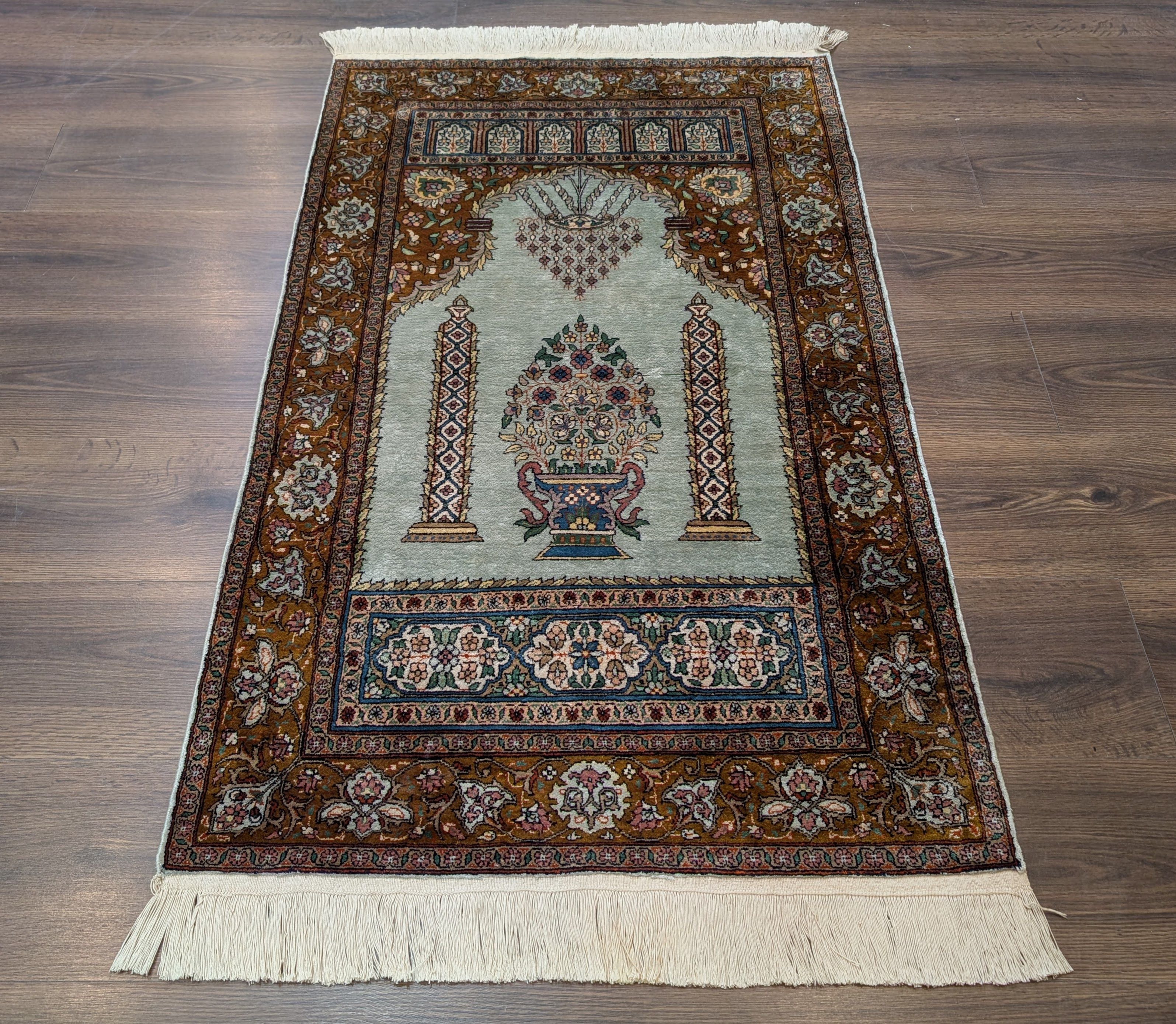 Silk Turkish Kayseri Prayer Rug, Light Mint Green, Fine 360 KPSI, Handmade