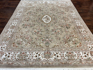 Sino Persian Rug 8x10, Soft Wool, Silk Highlights, Hand Knotted Vintage Carpet, Taupe & Ivory, Floral, Traditional Rug 8 x 10