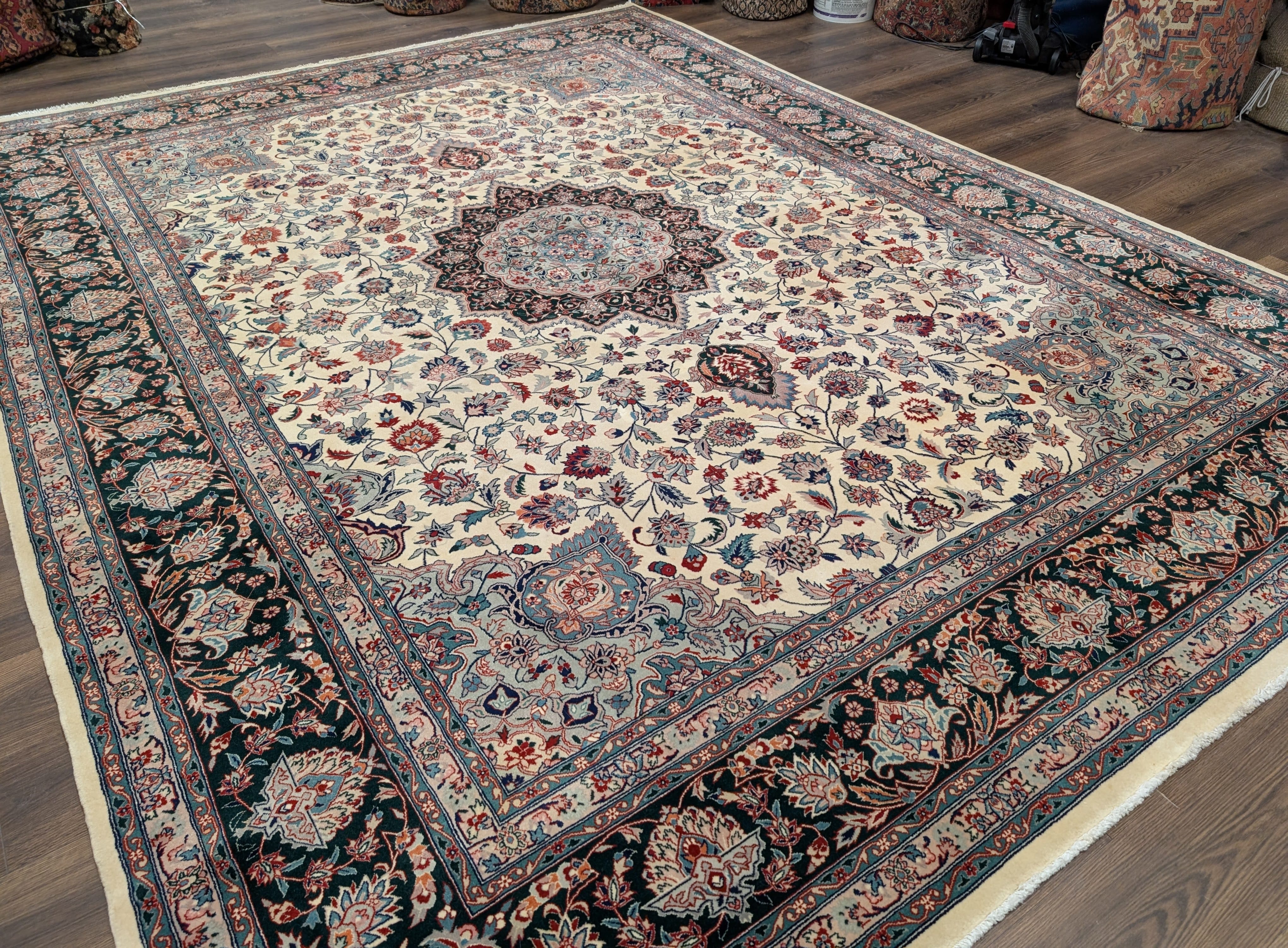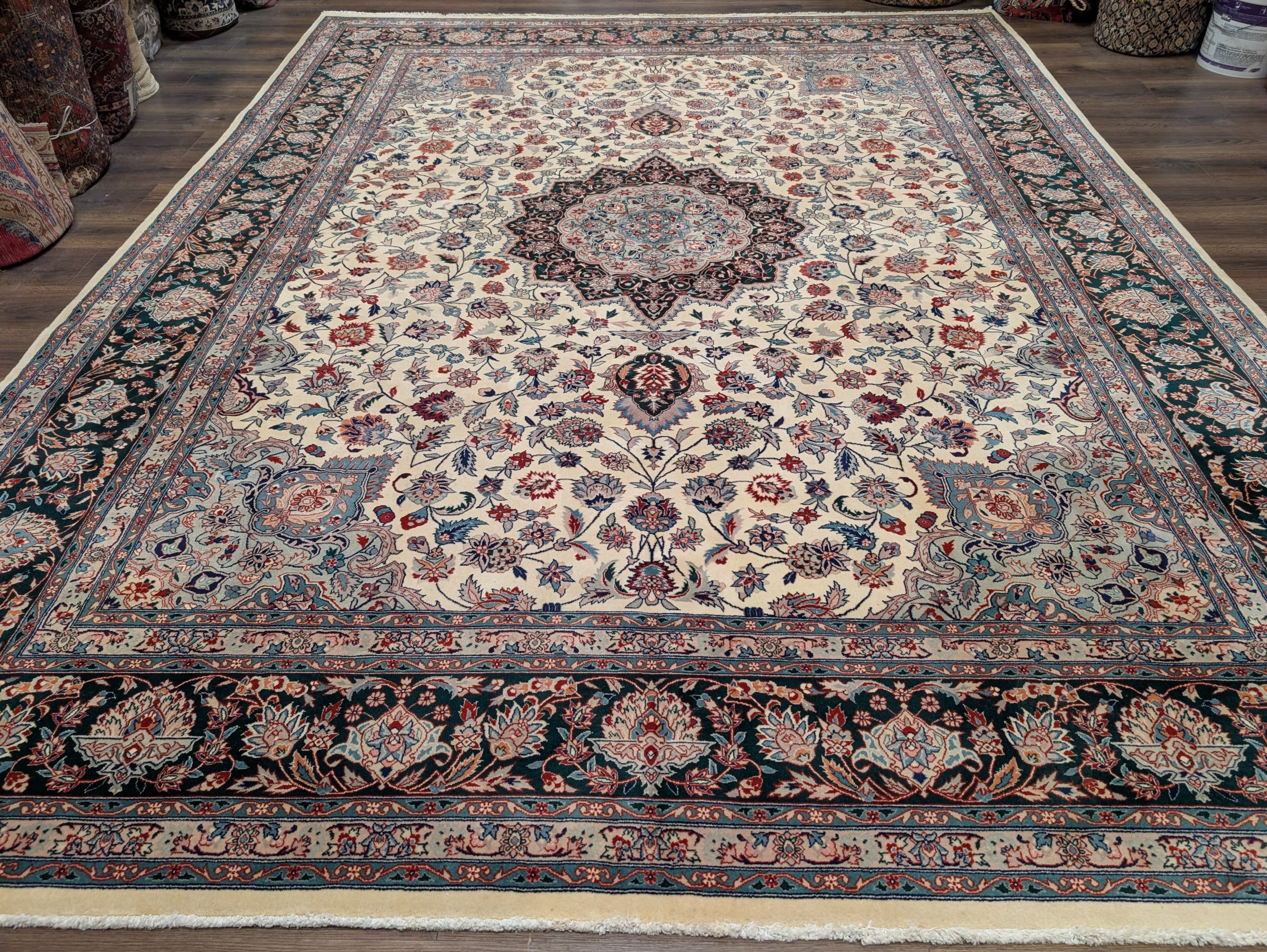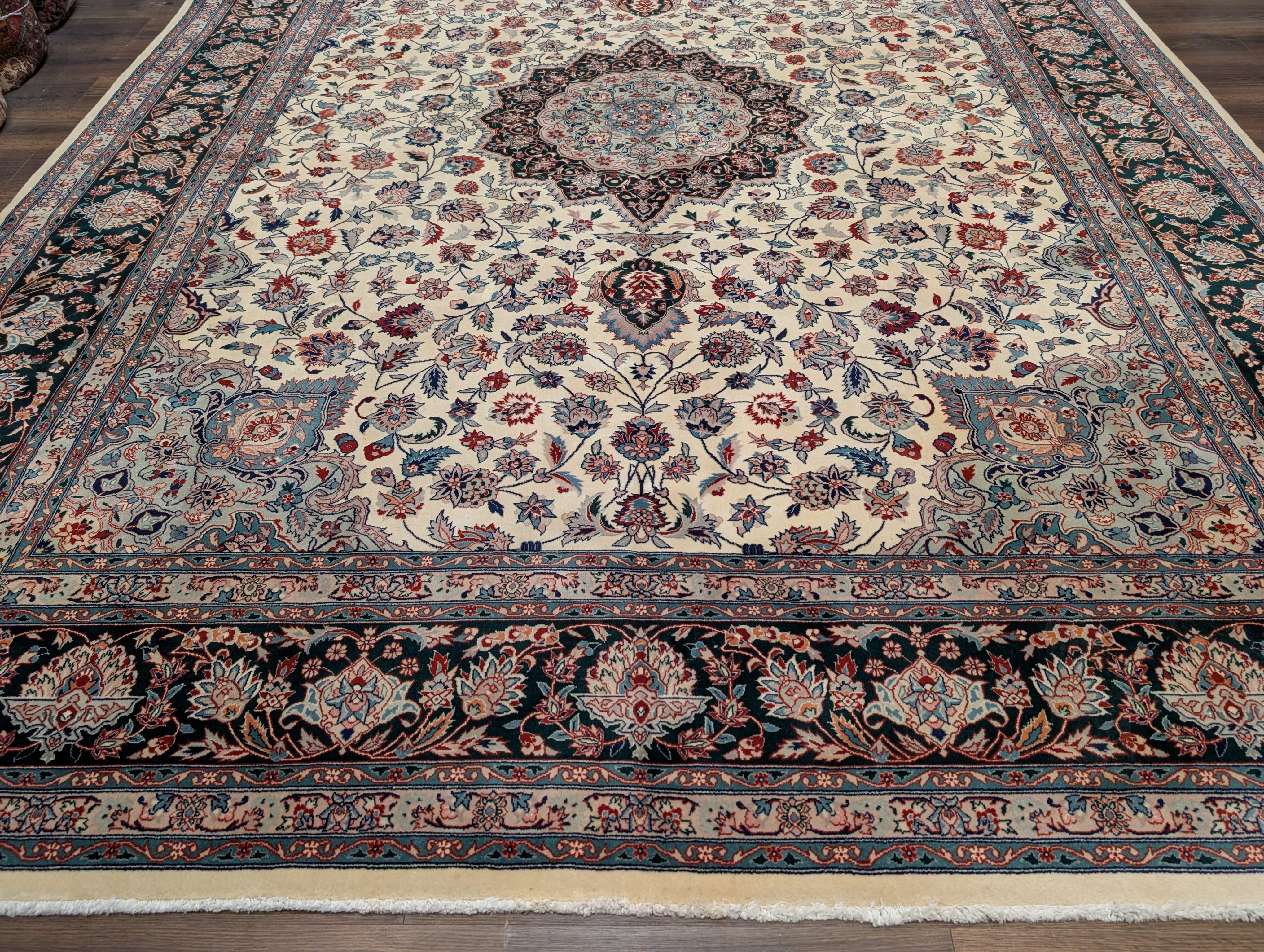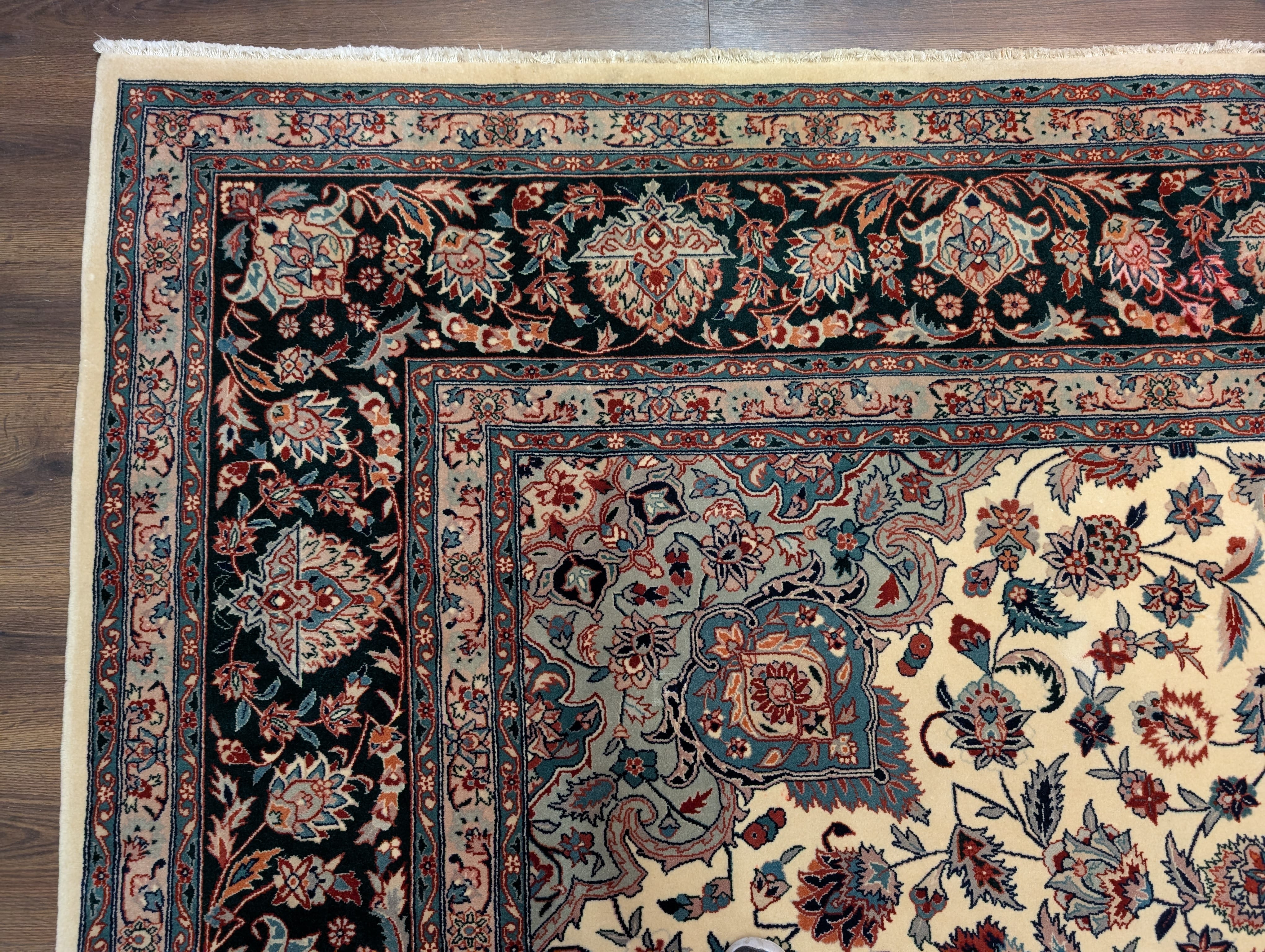 Sino Persian Rug 9x12, Ivory-Cream-Beige and Navy Blue, Floral Medallion
