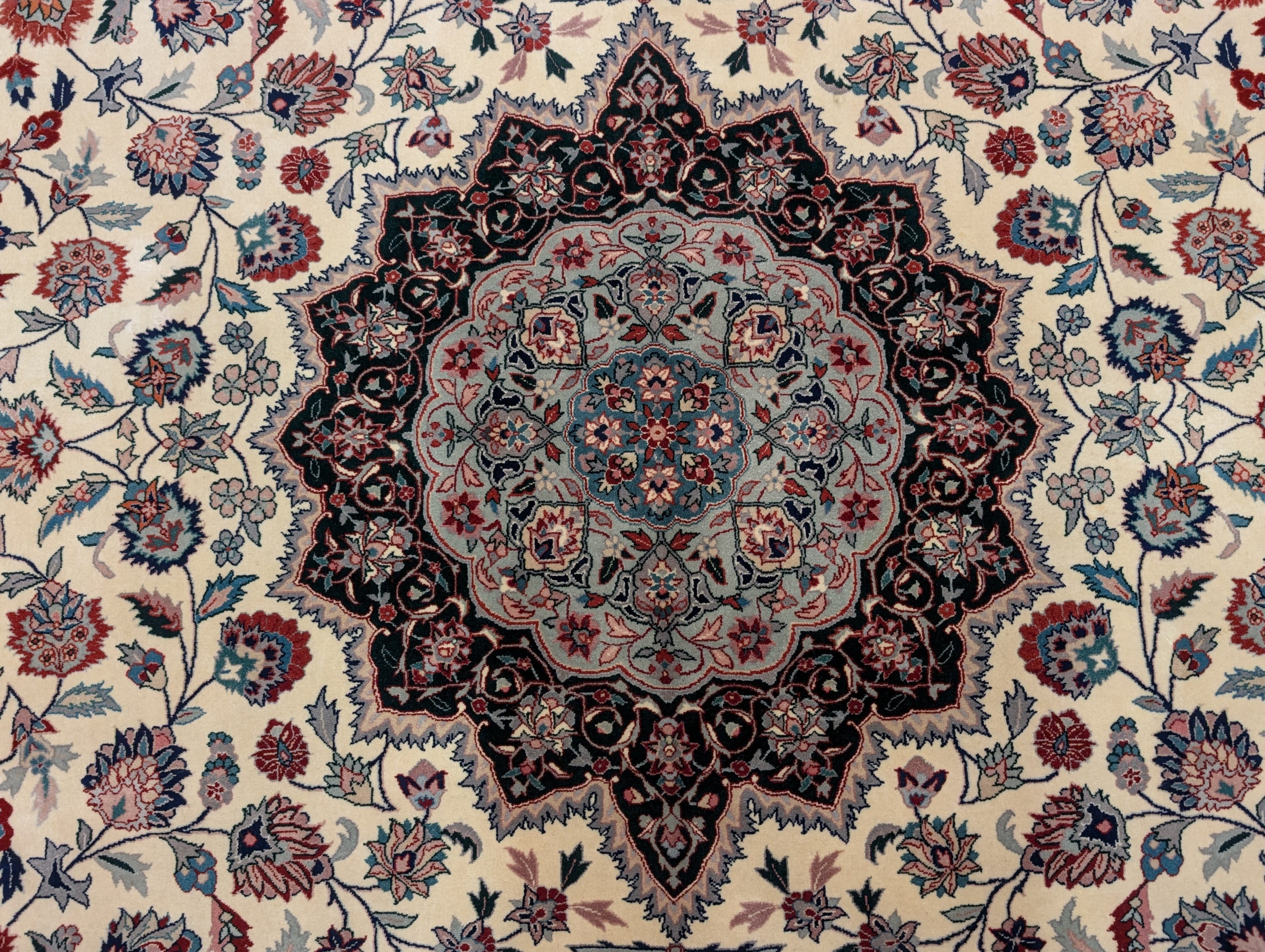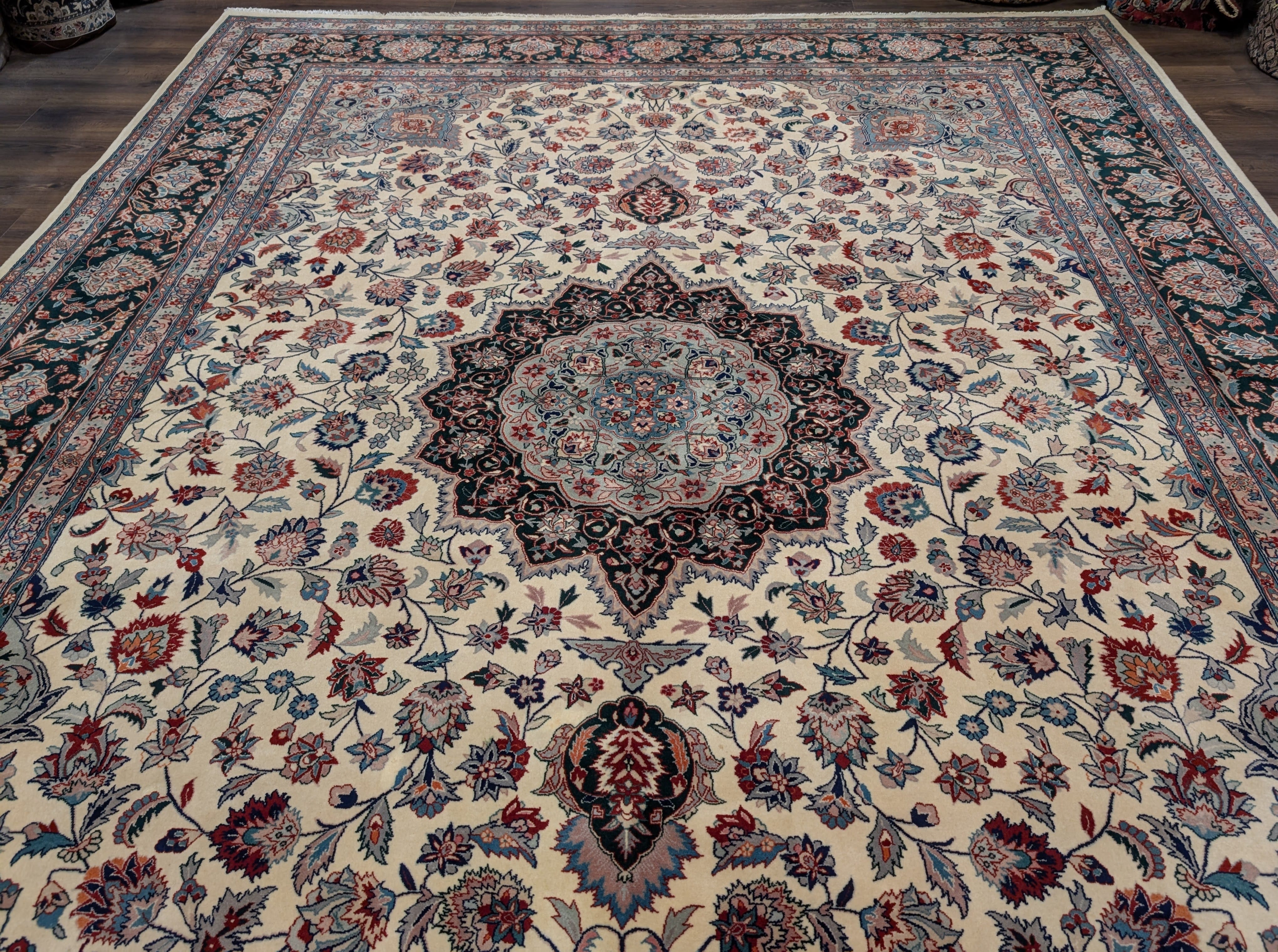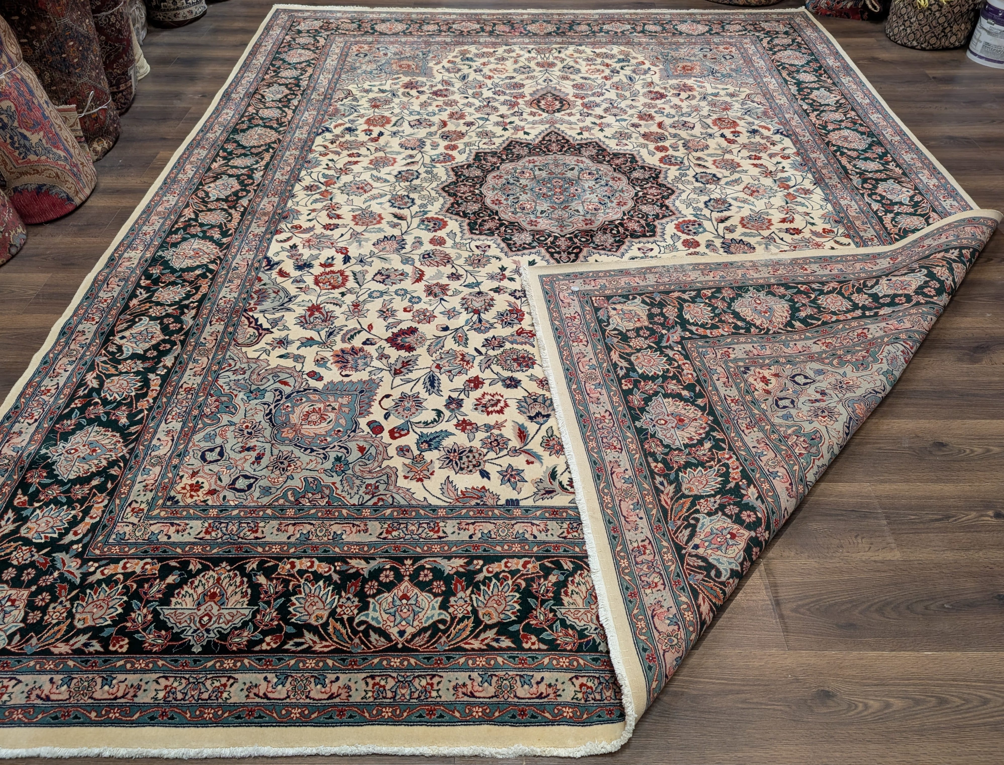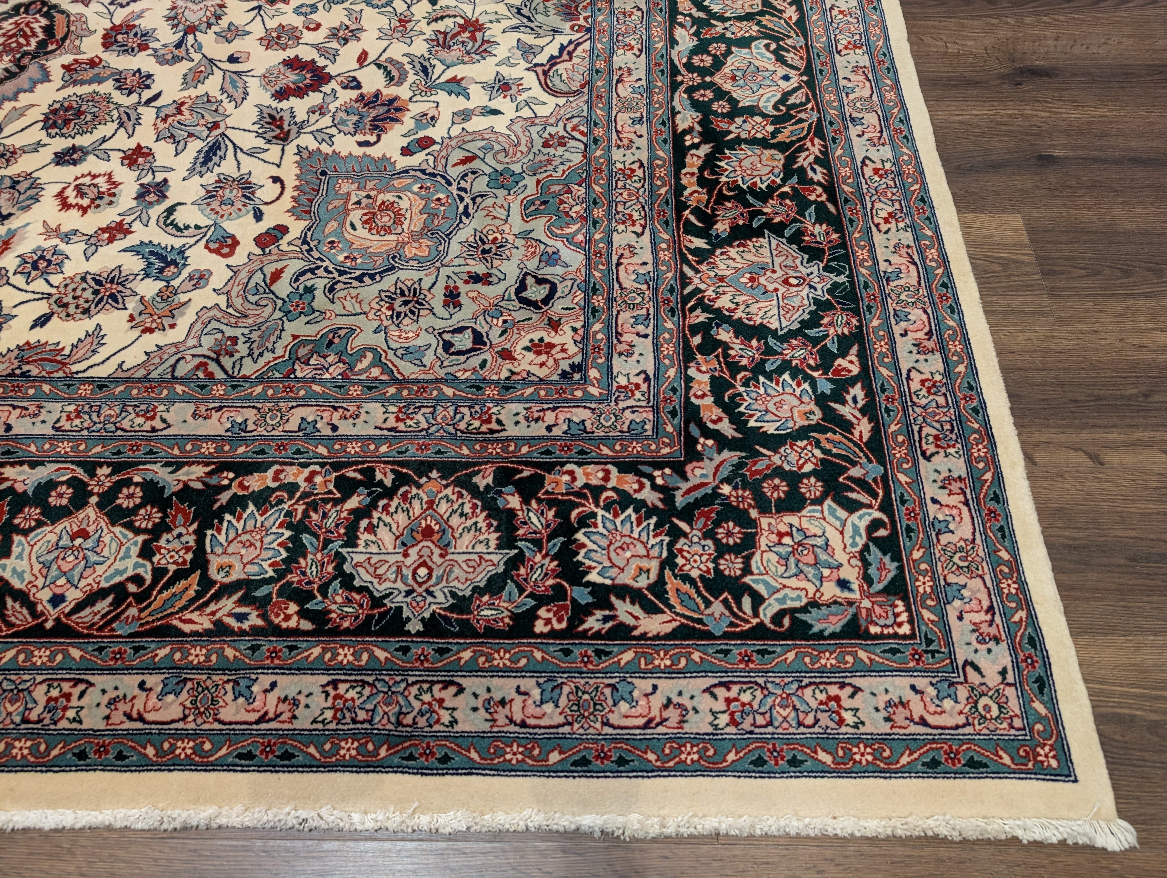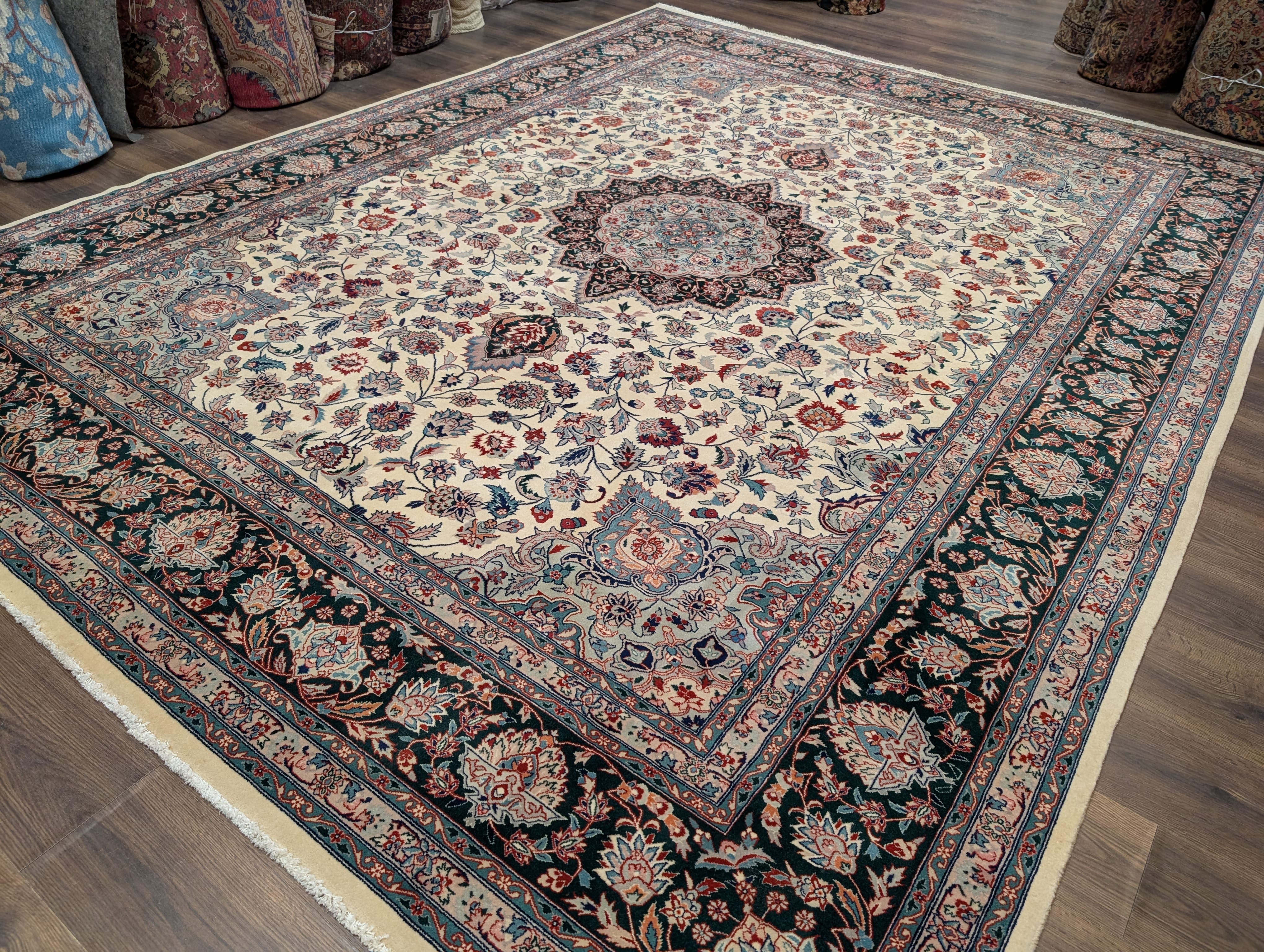 Sino Persian Rug 9x12, Ivory-Cream-Beige and Navy Blue, Floral Medallion