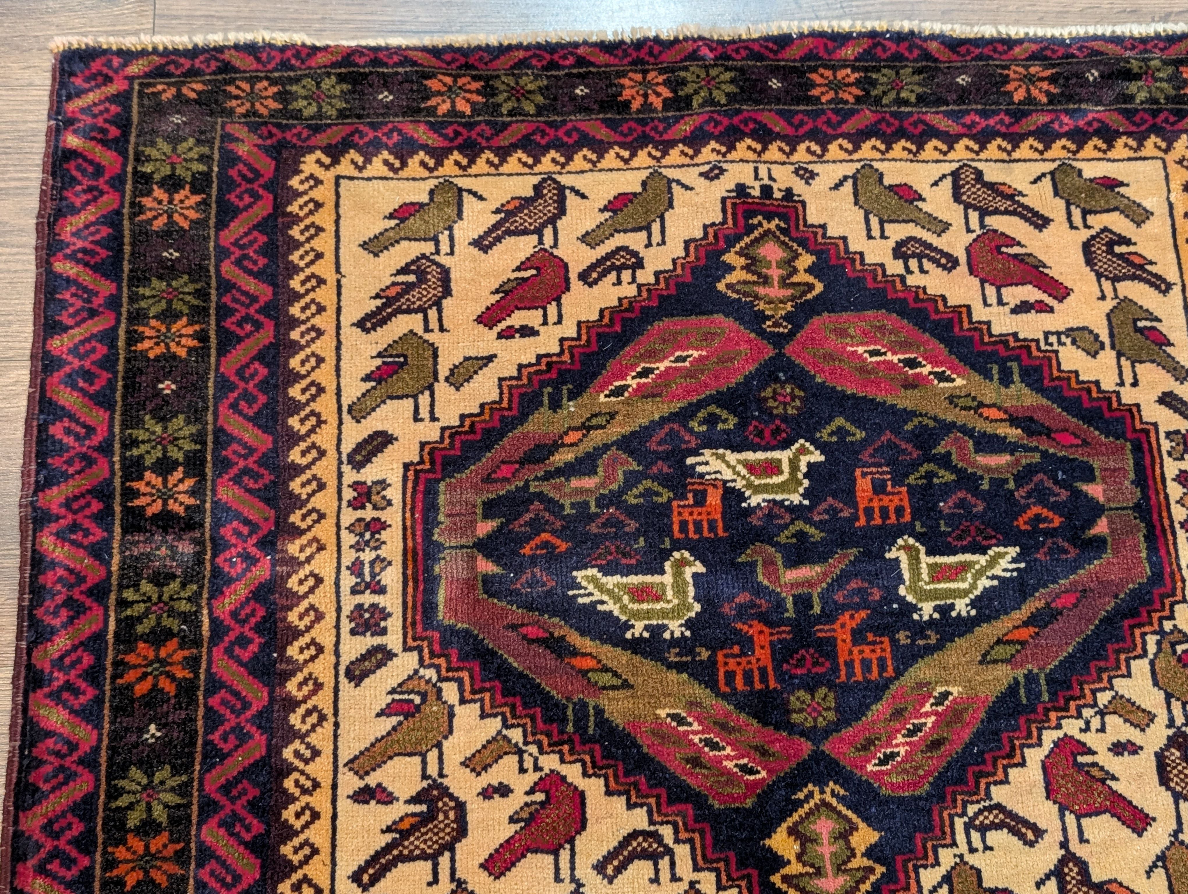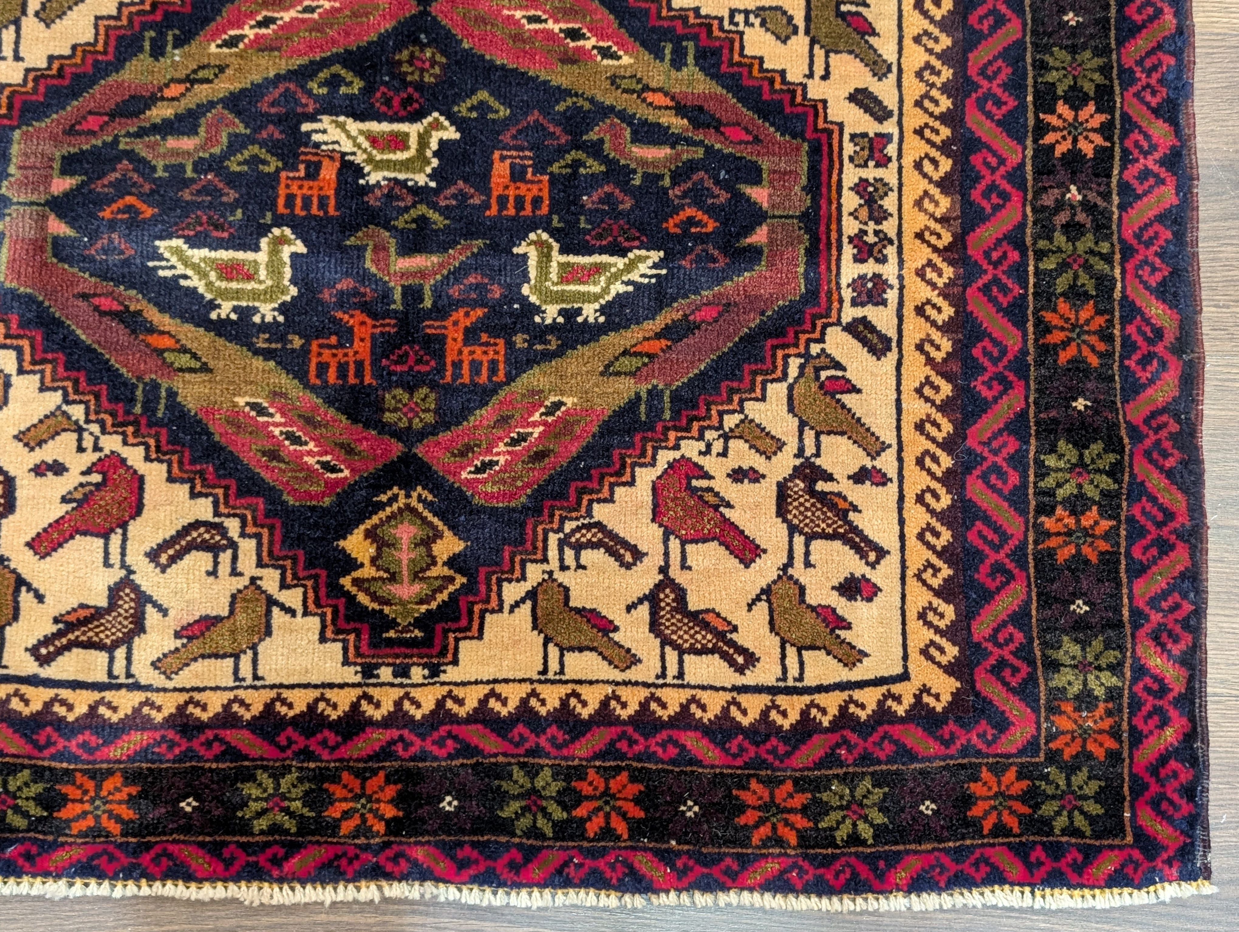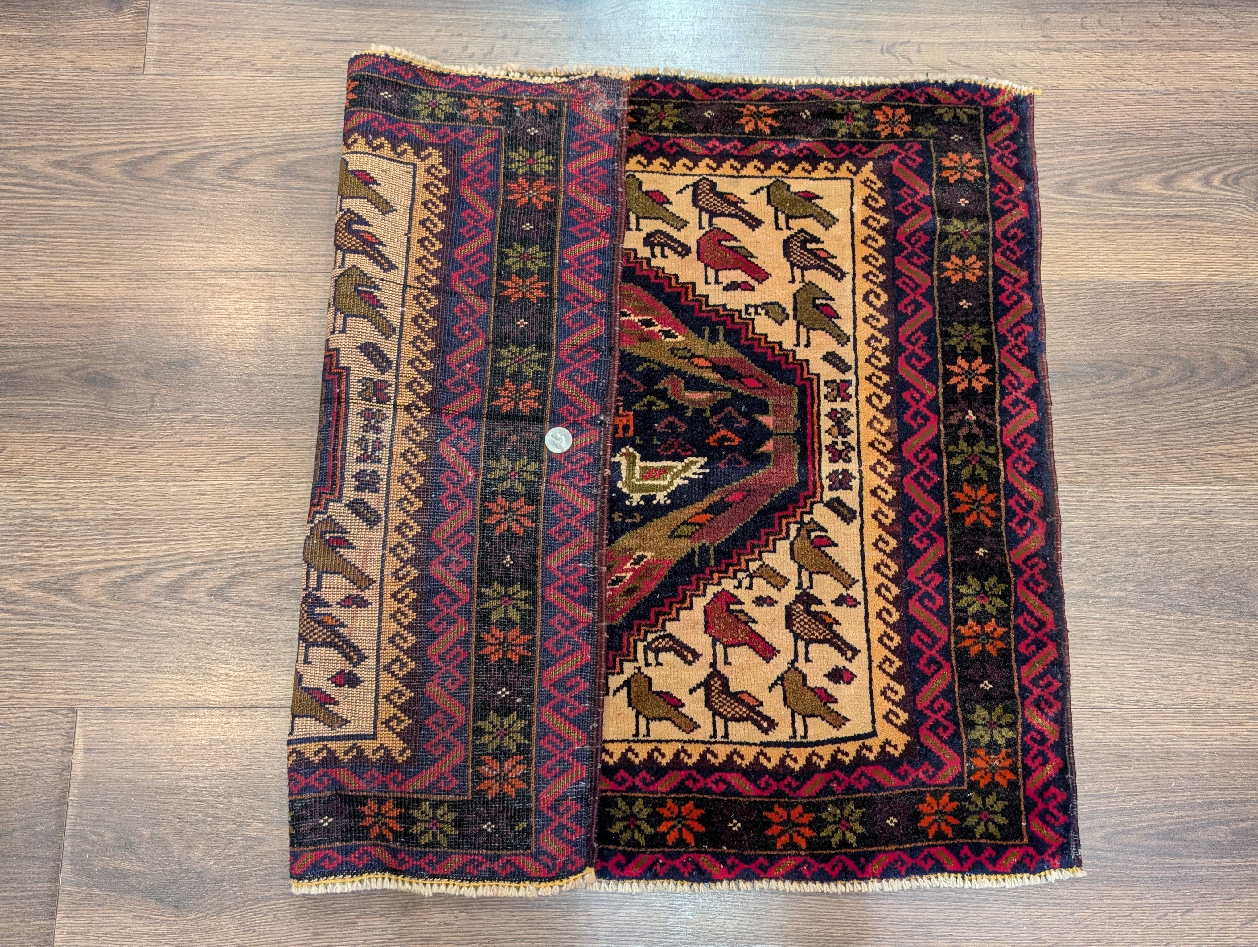 Small Persian Baluch Rug, Tribal Rug, Wool, Bird Pictorials, Unique