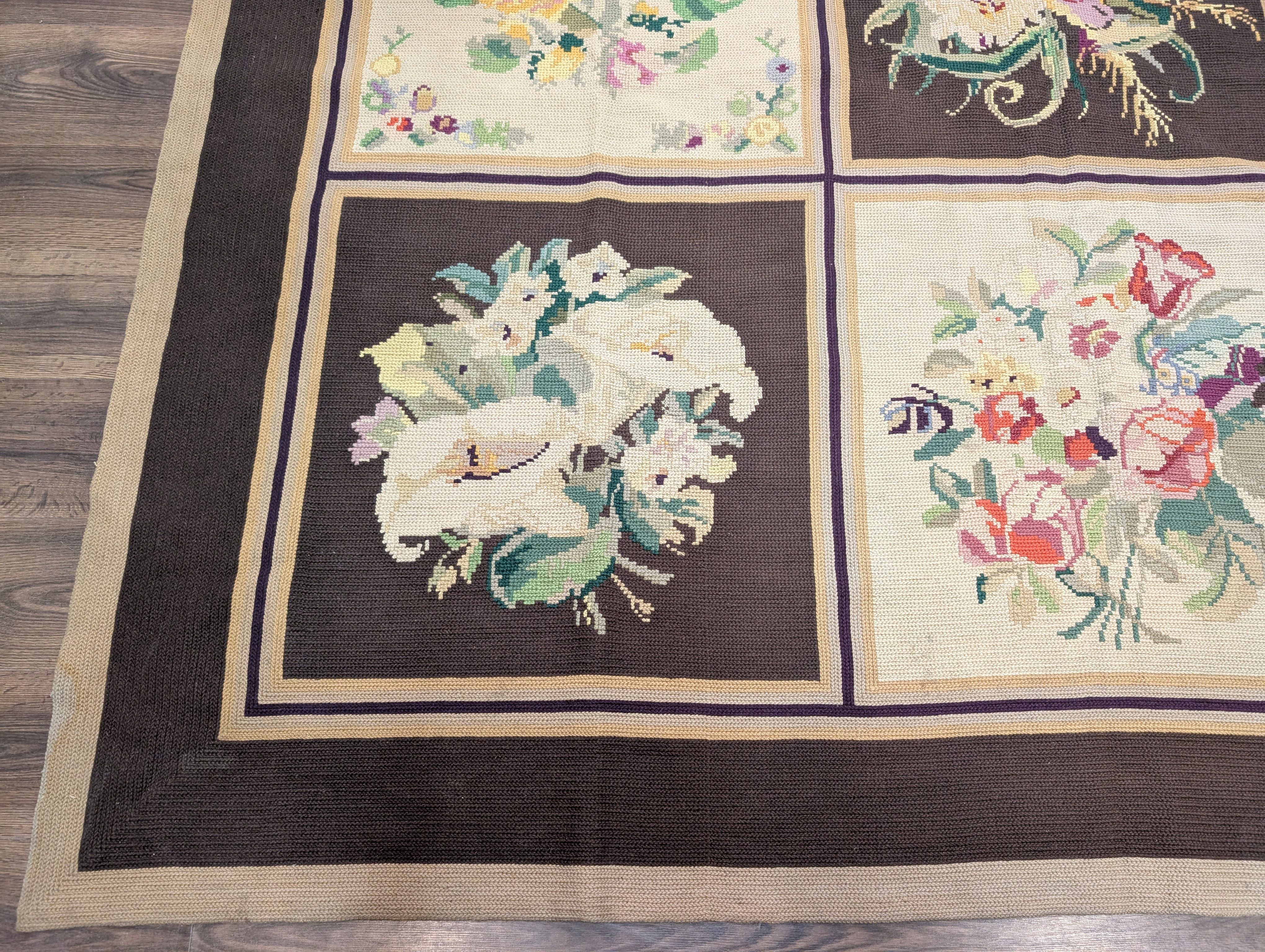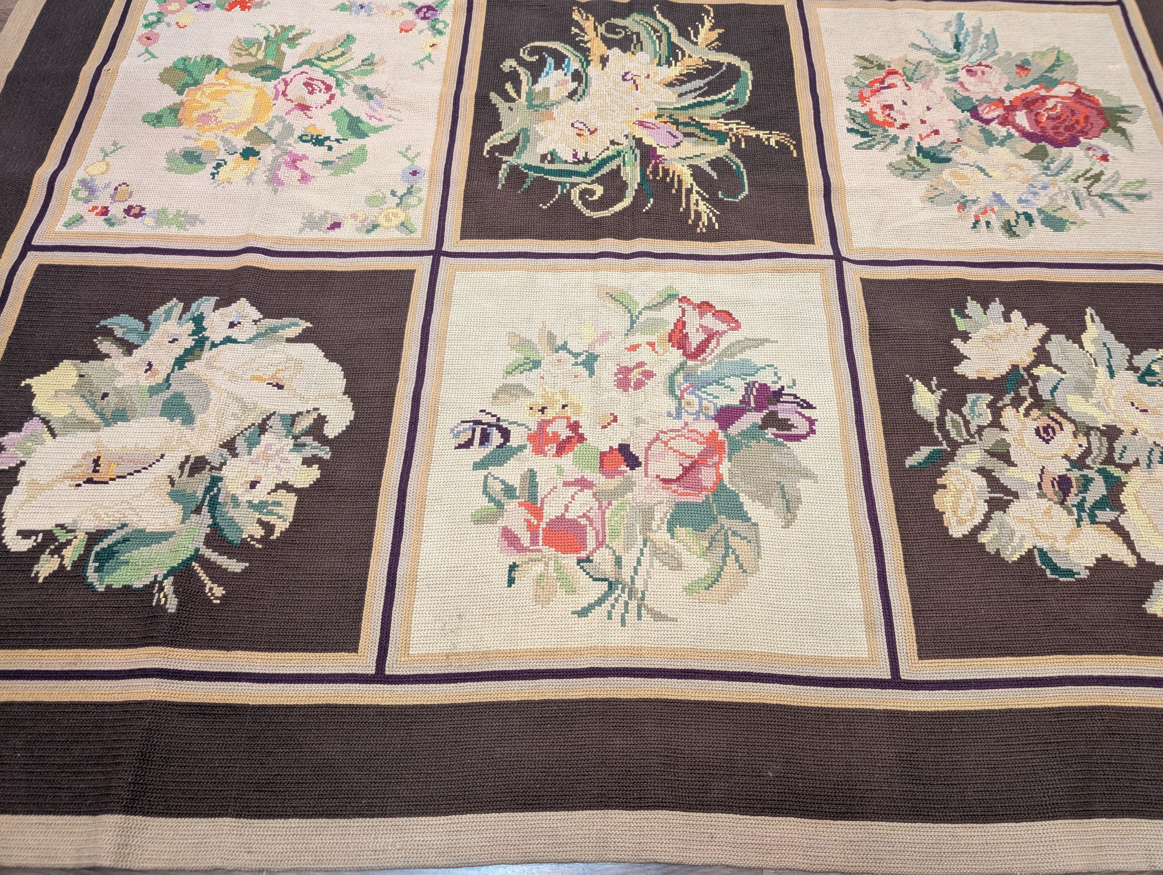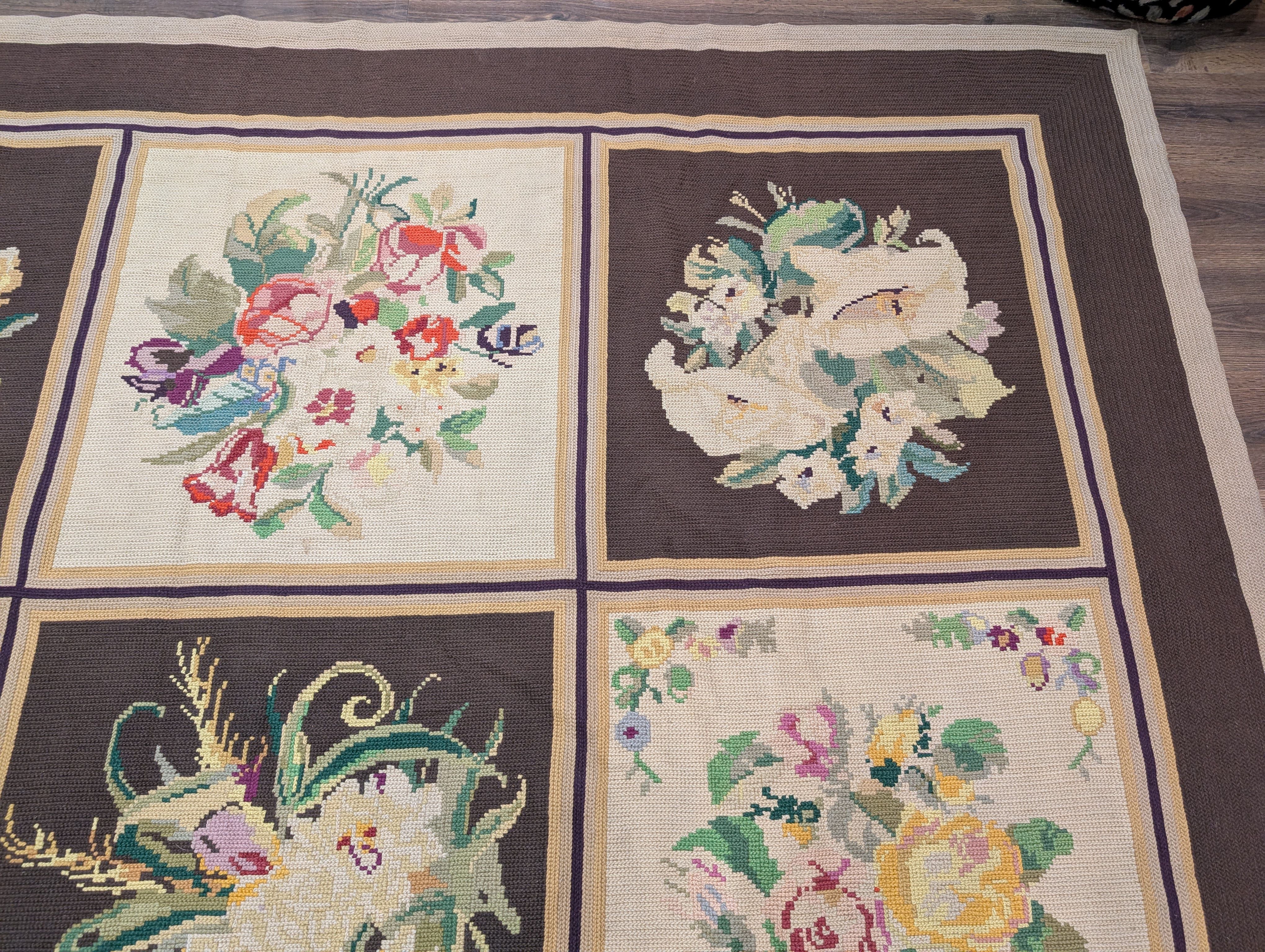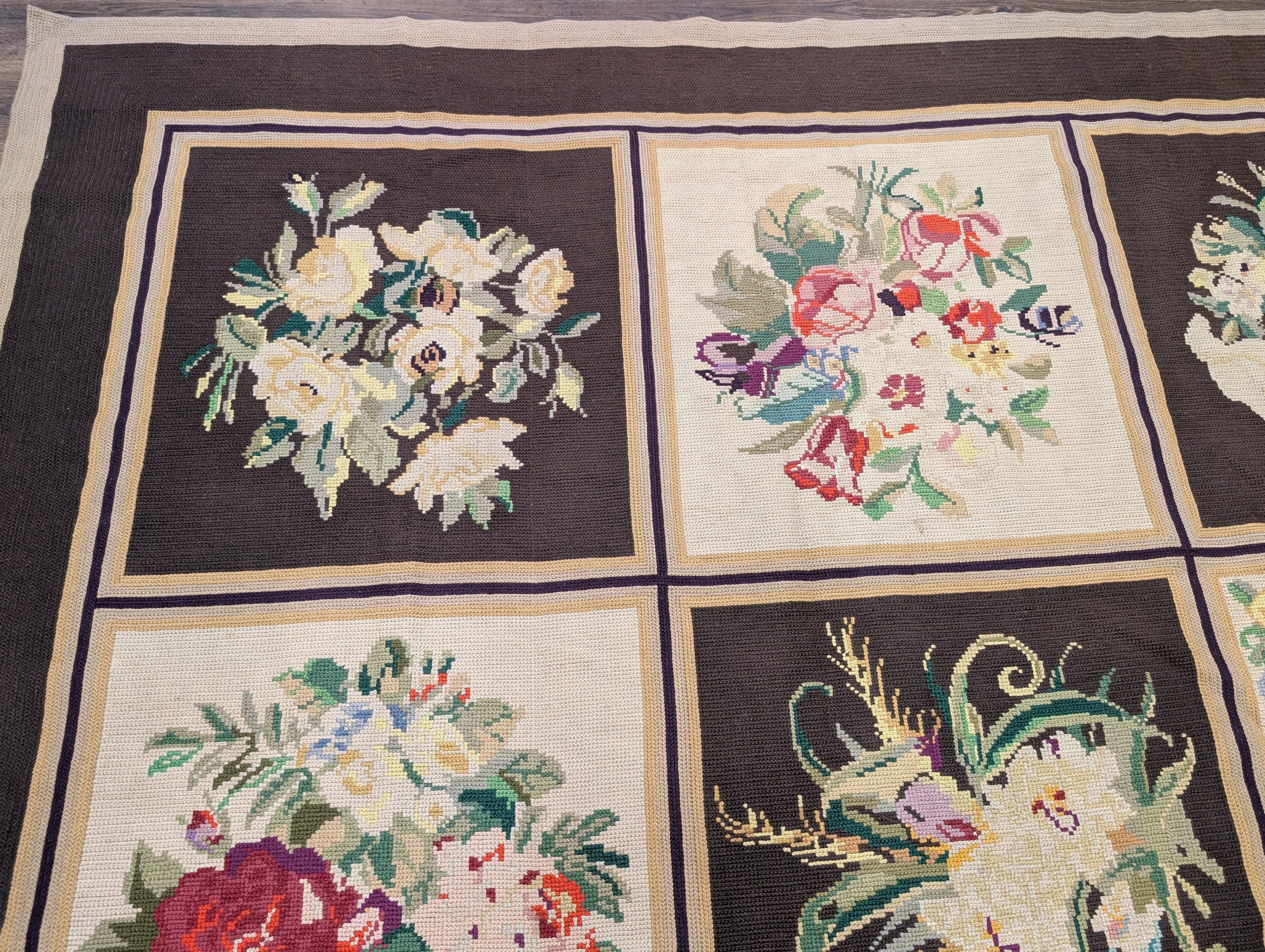 Stark Needlepoint Rug 9x14, Antique European Portuguese Needlepoint Carpet, English Panel Design, Floral Bouquets