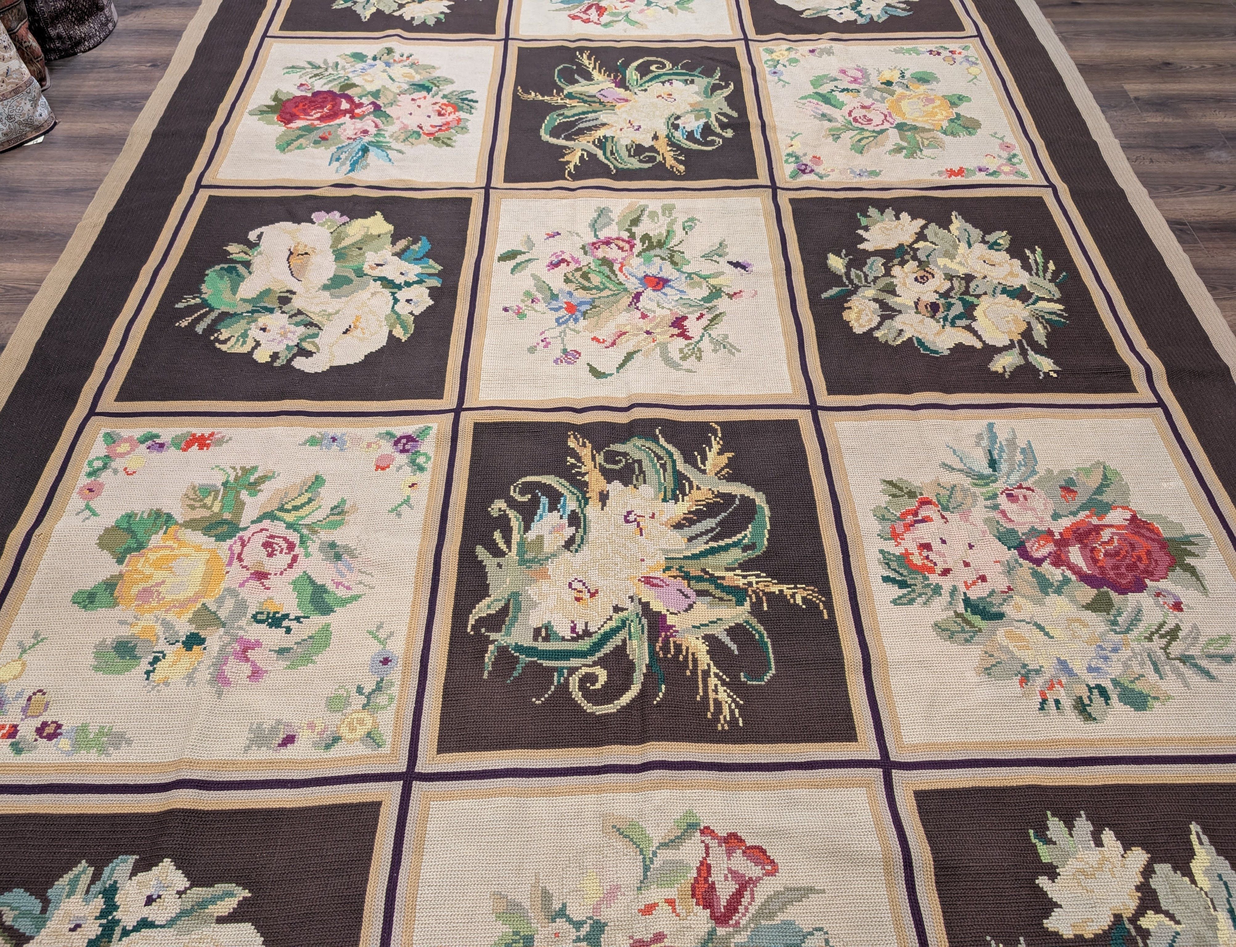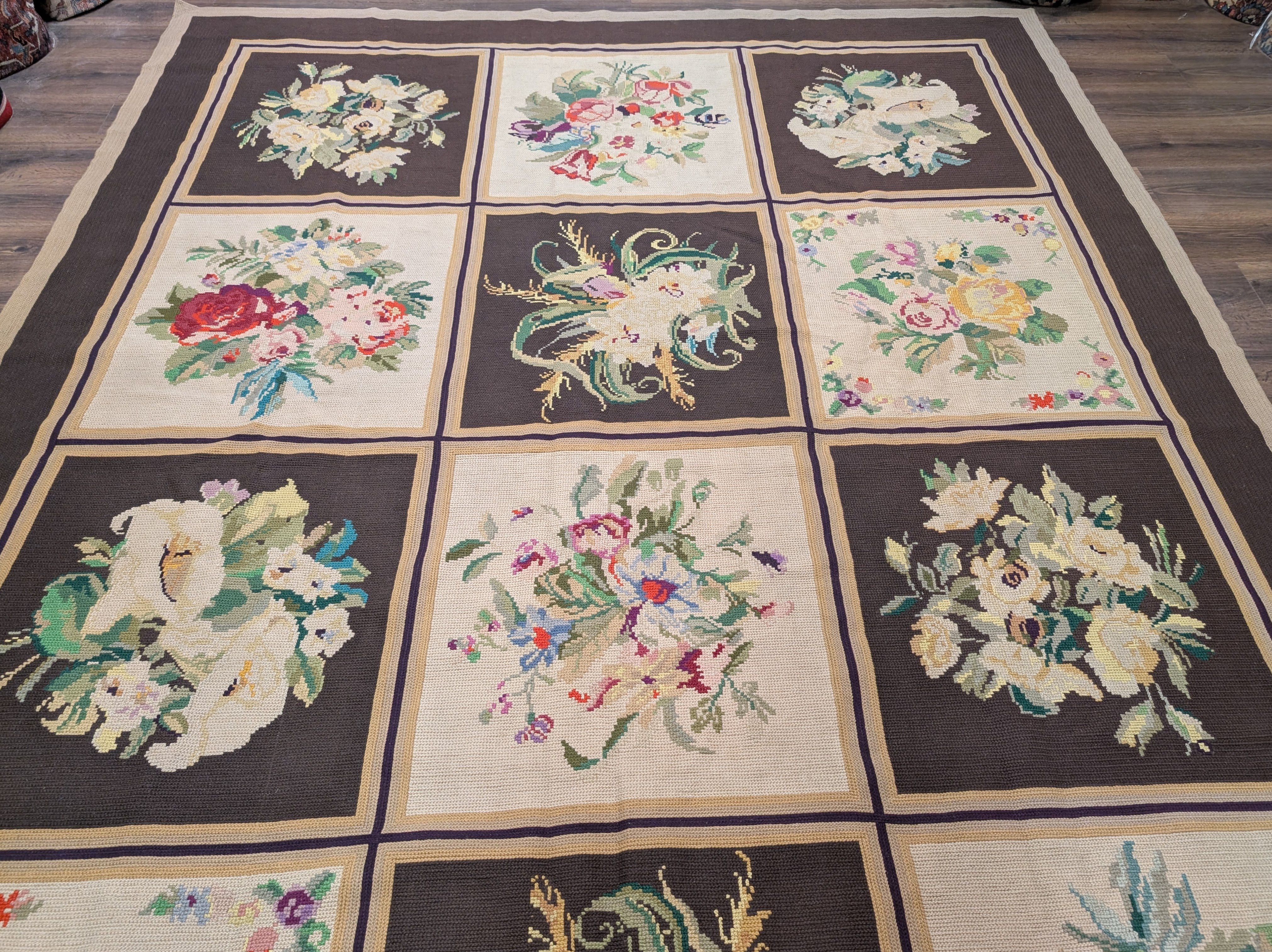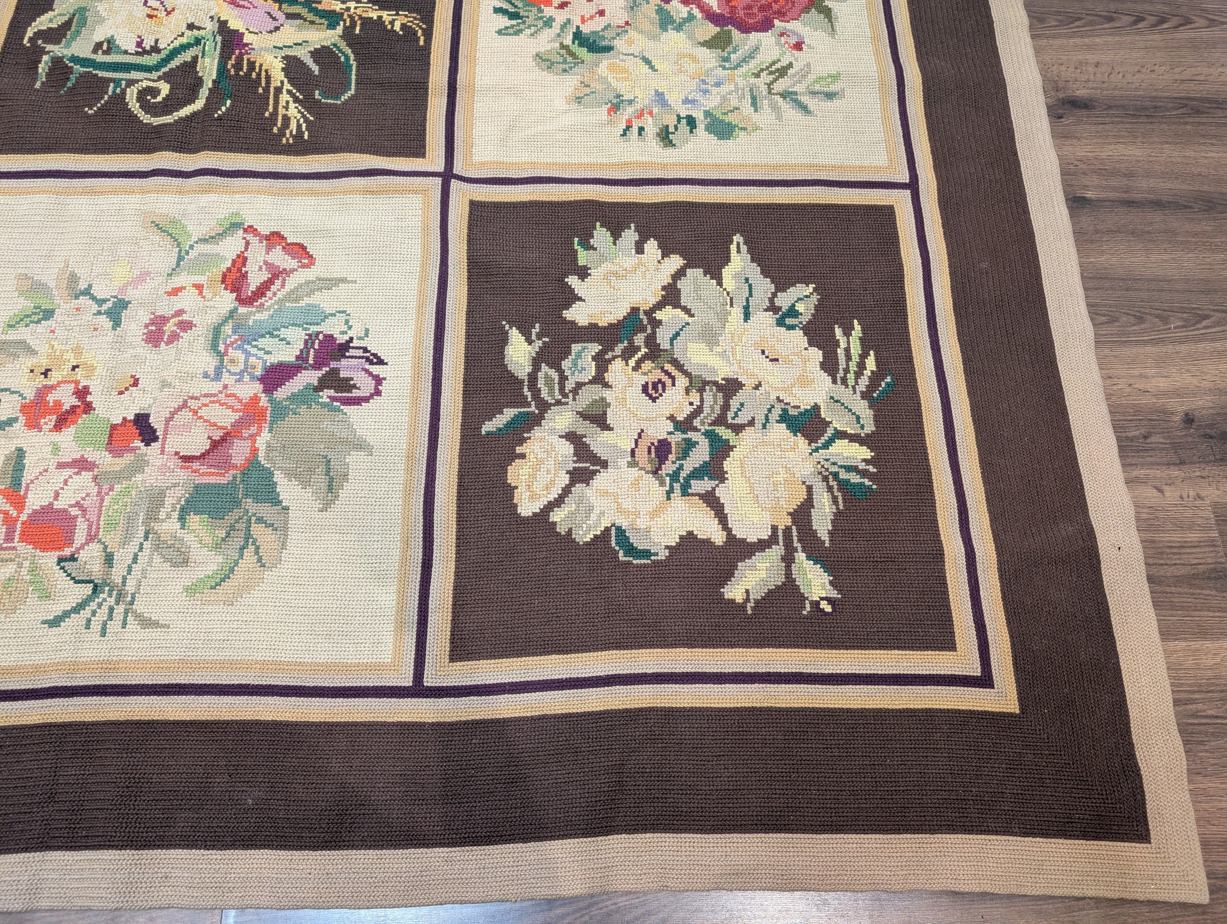 Stark Needlepoint Rug 9x14, Antique European Portuguese Needlepoint Carpet, English Panel Design, Floral Bouquets