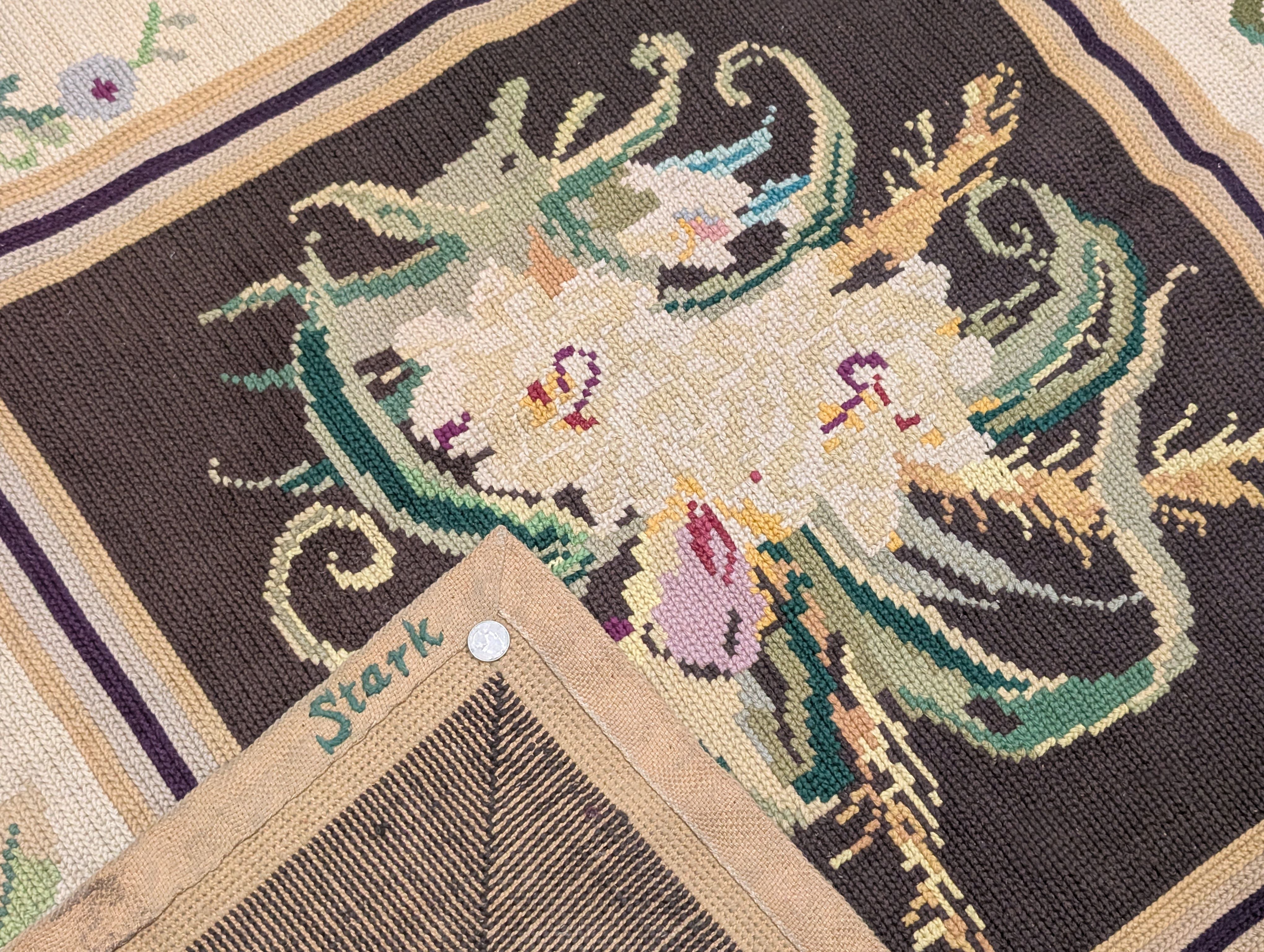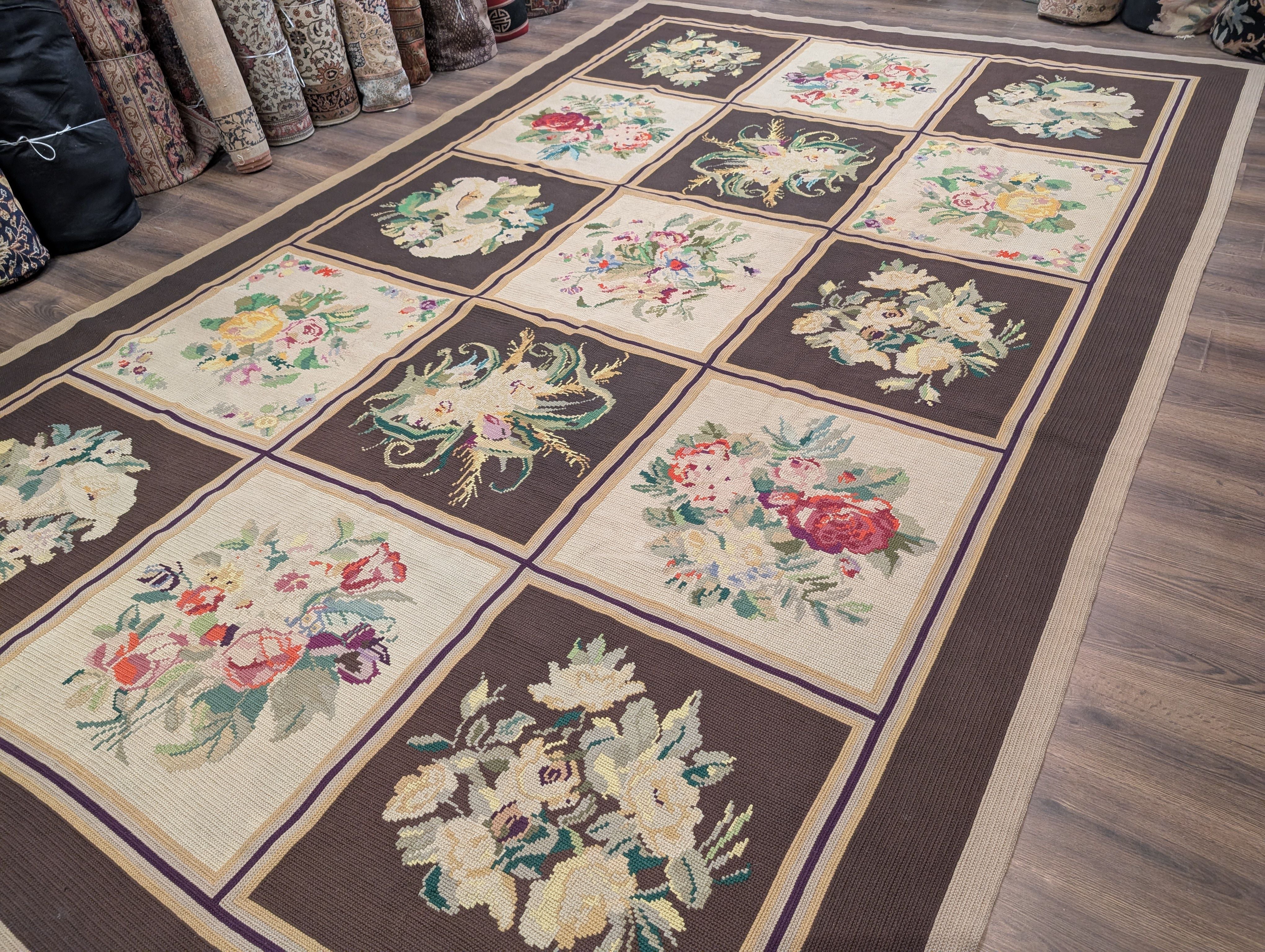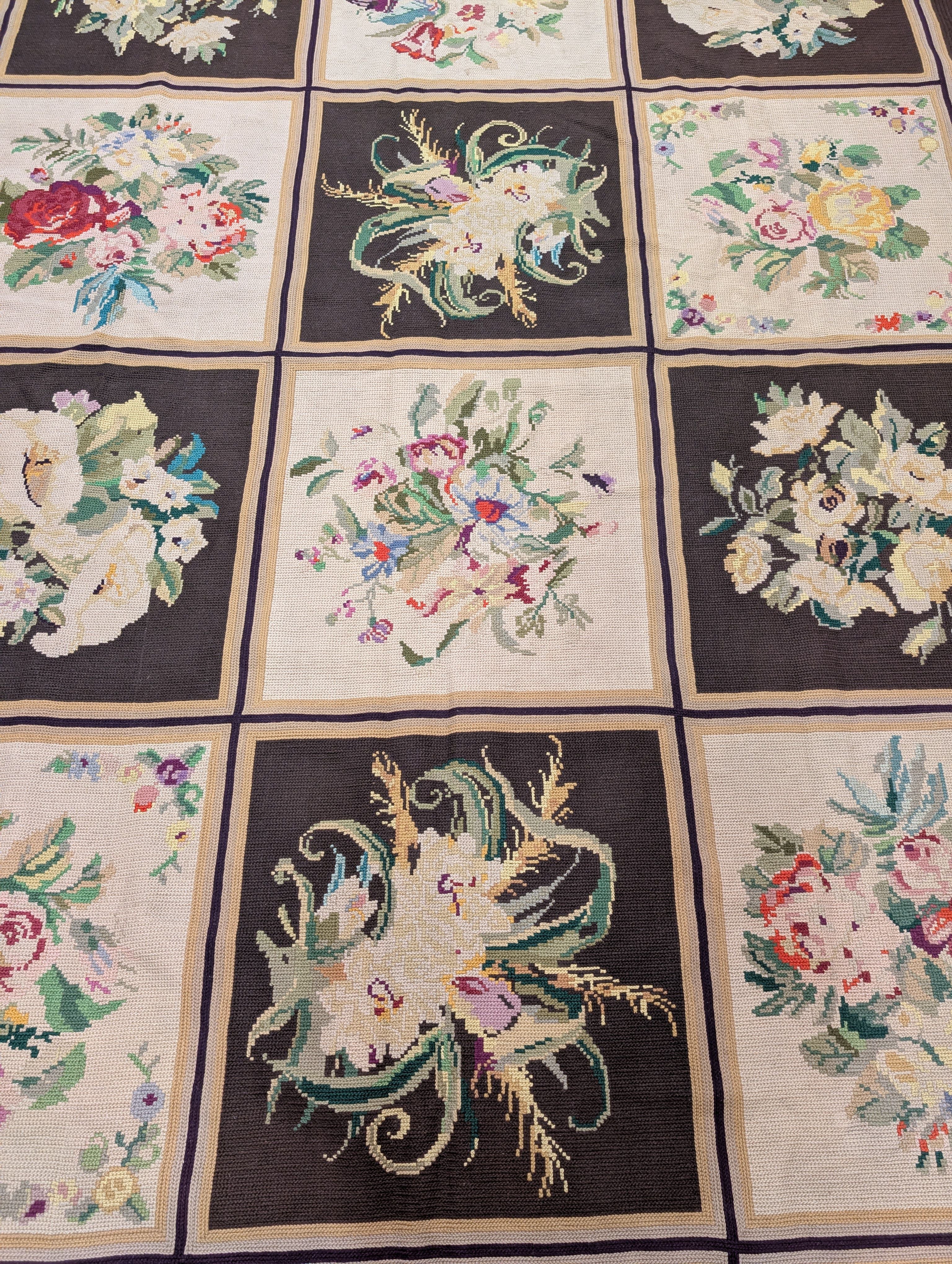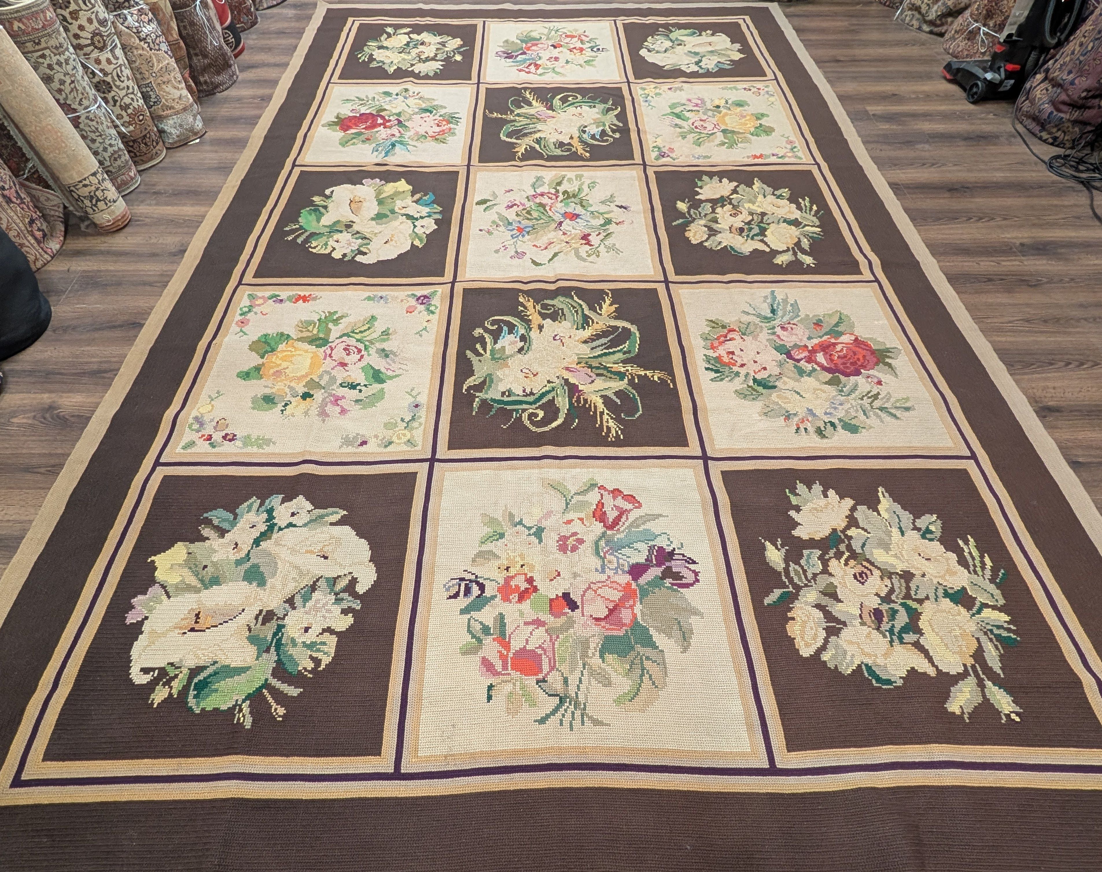 Stark Needlepoint Rug 9x14, Antique European Portuguese Needlepoint Carpet, English Panel Design, Floral Bouquets