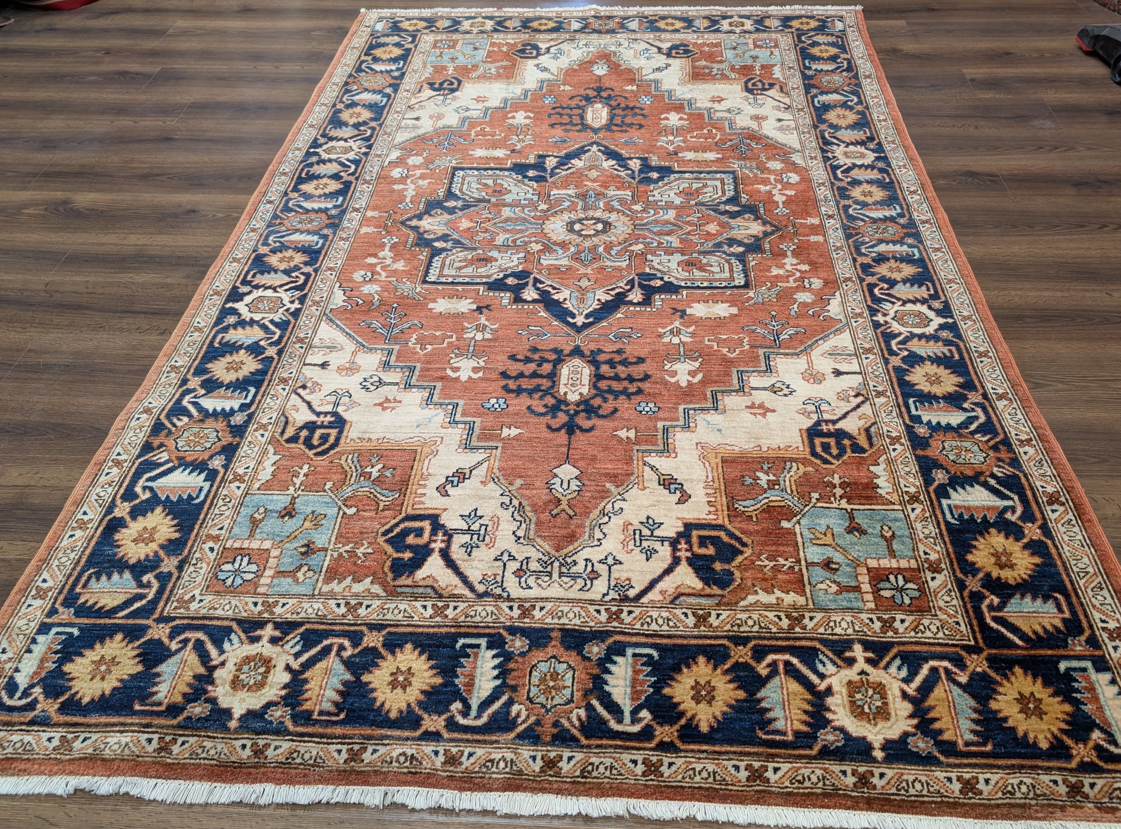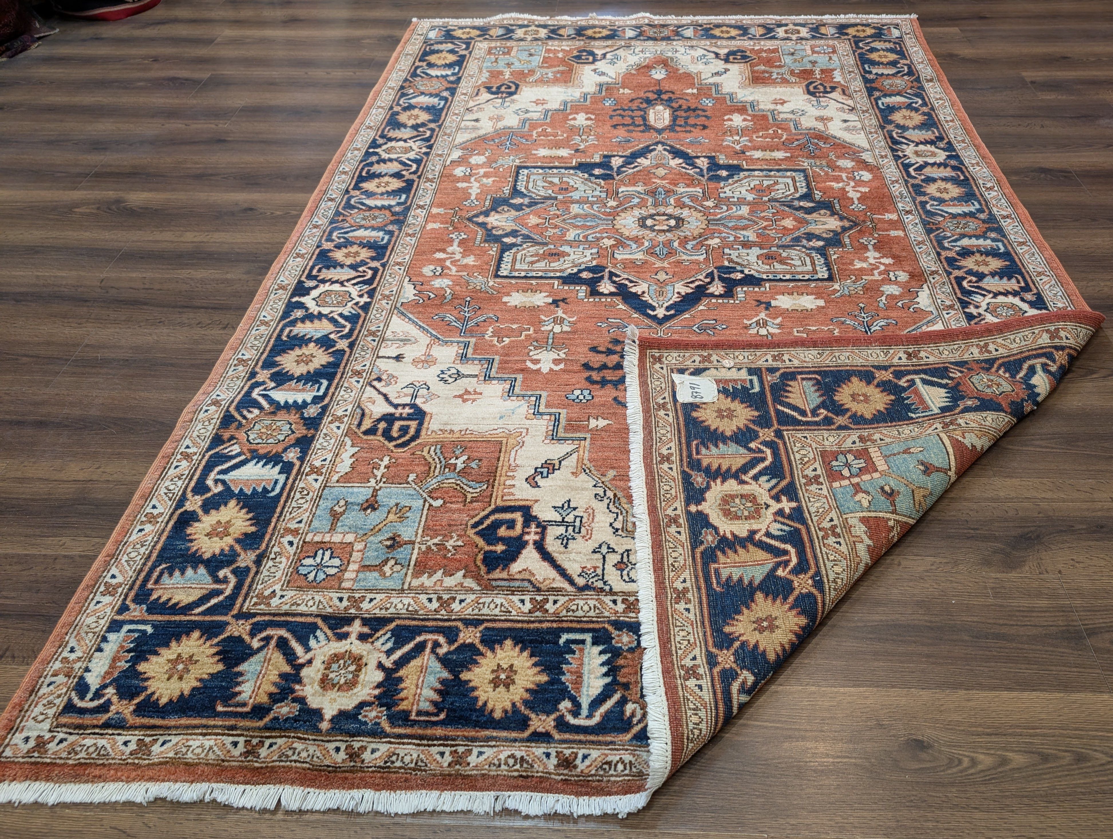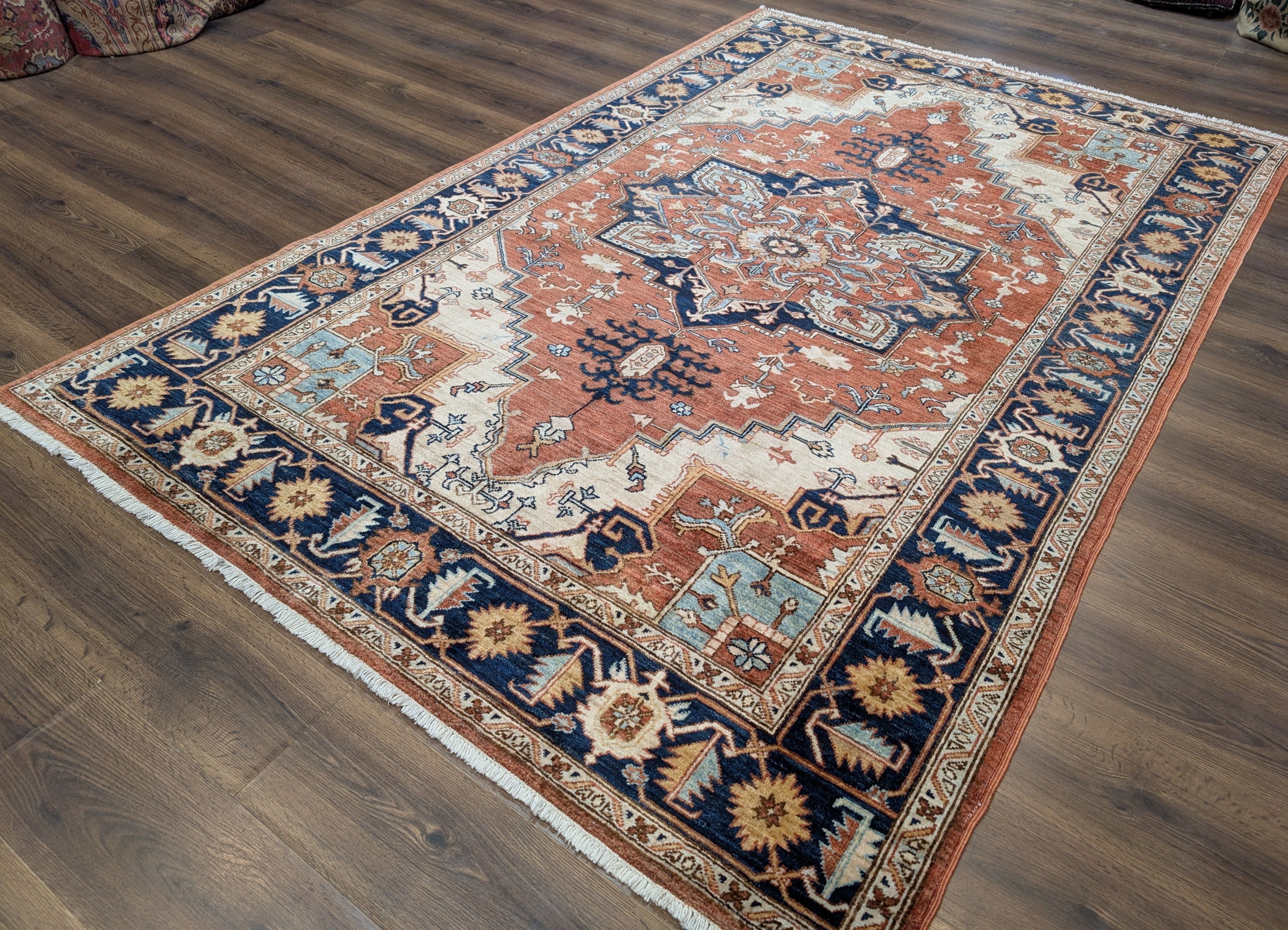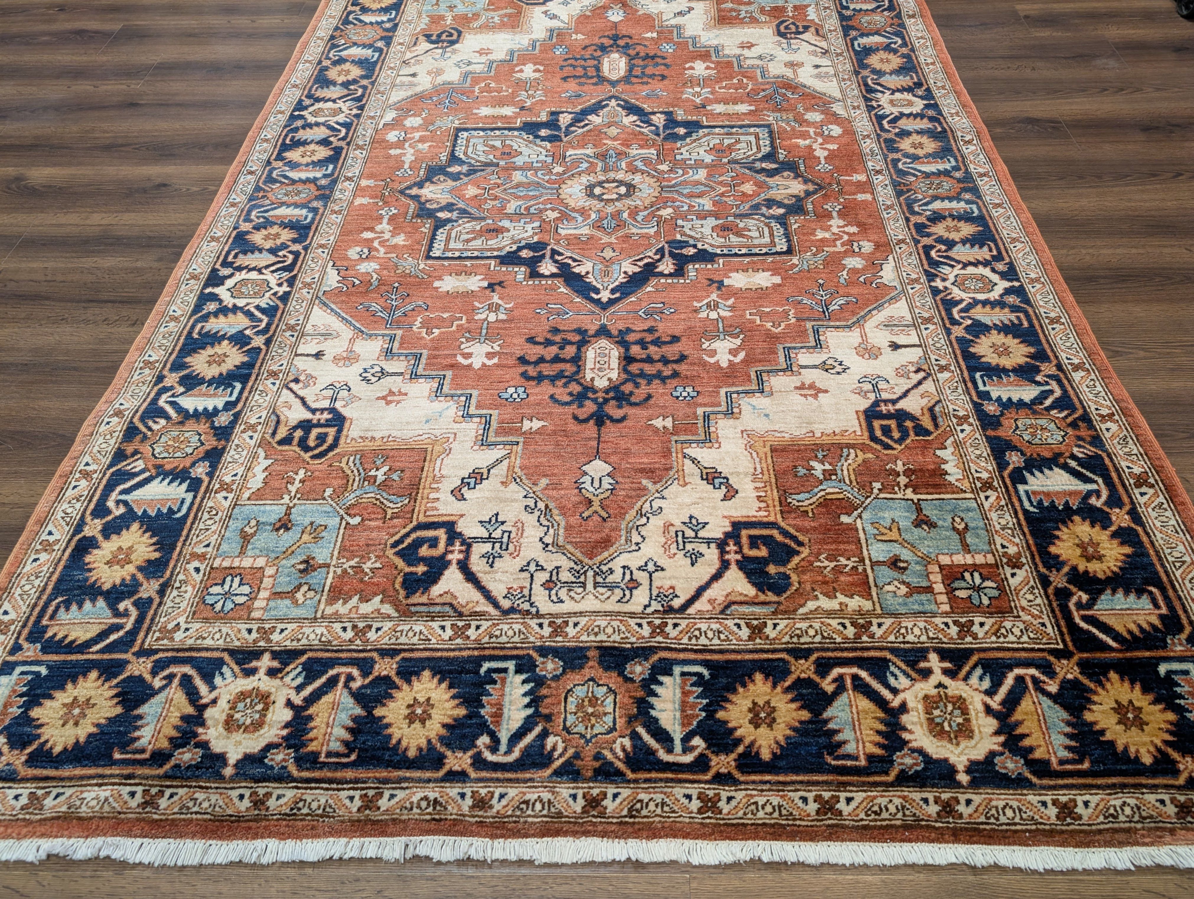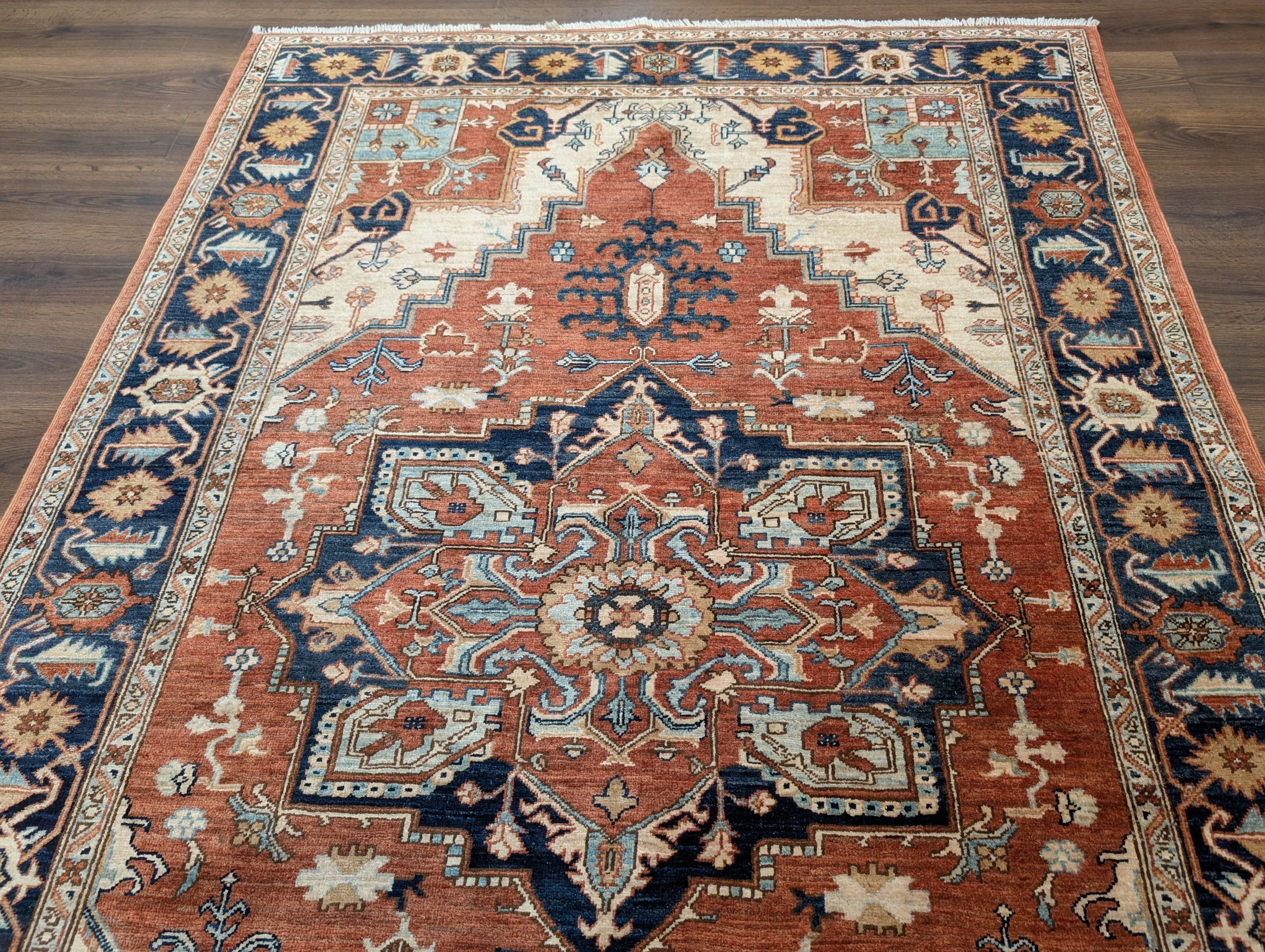 Turkish Heriz Serapi Rug 6x9, Geometric Medallion, Terracotta and Navy Blue, Handmade