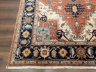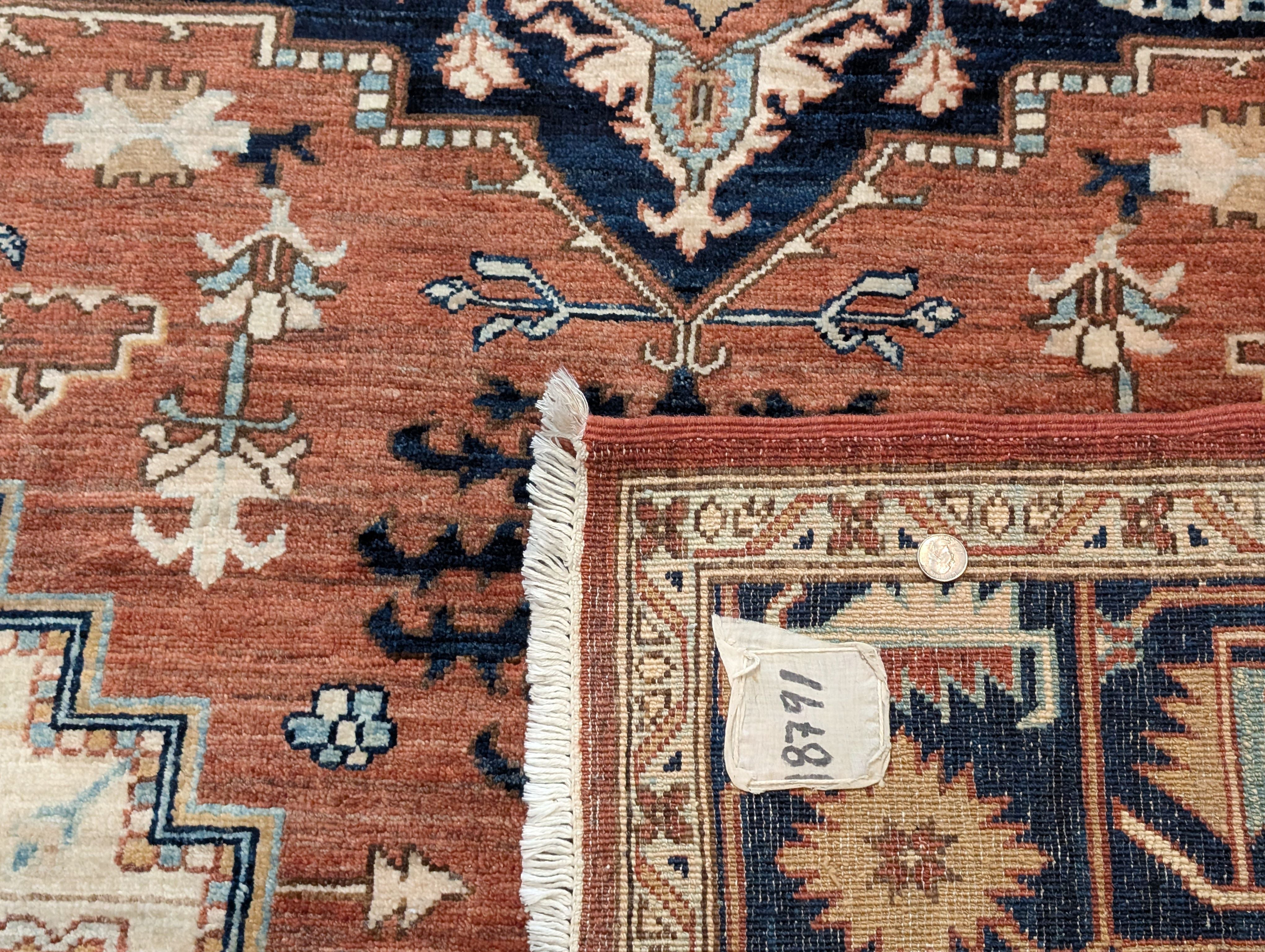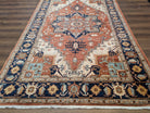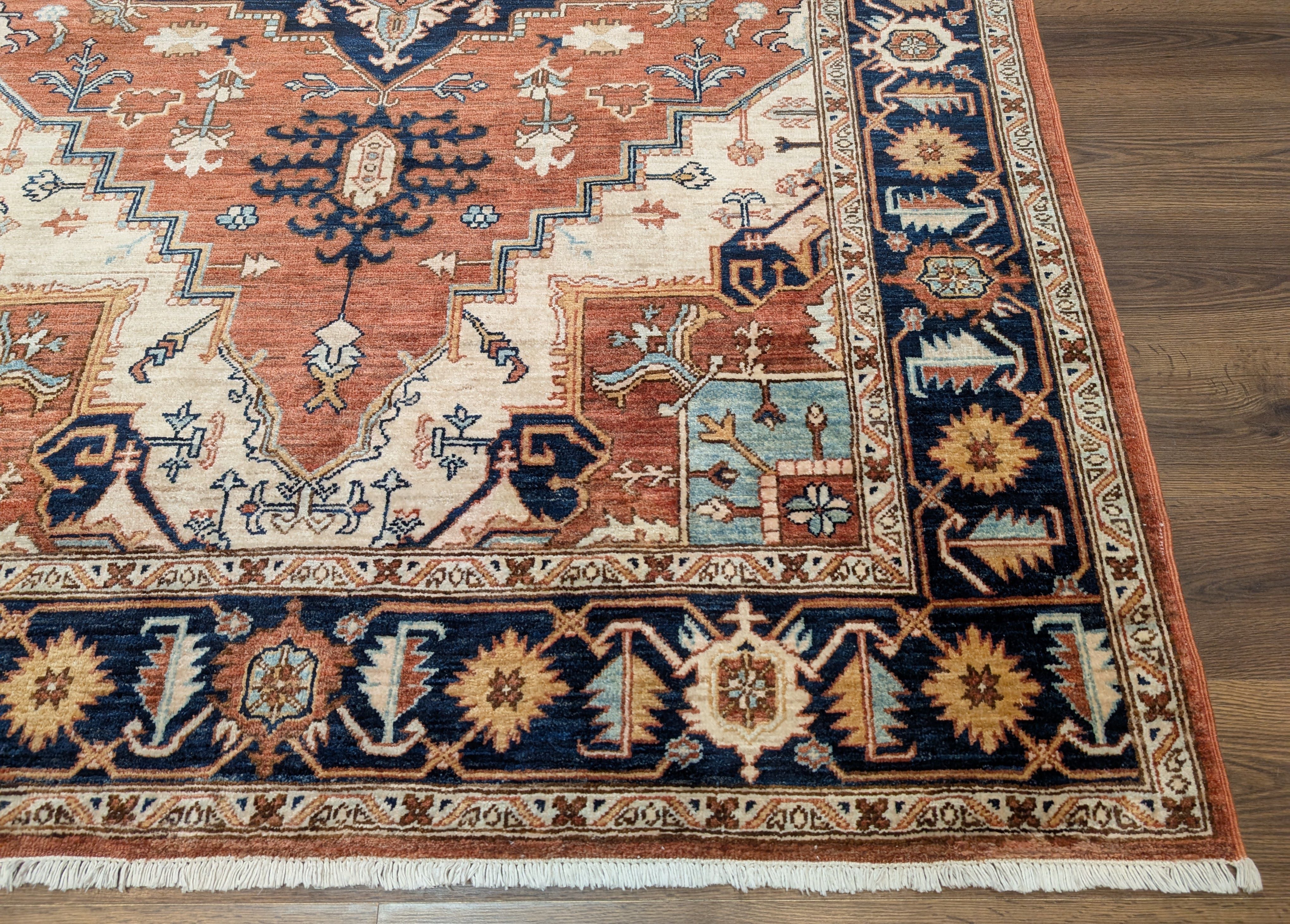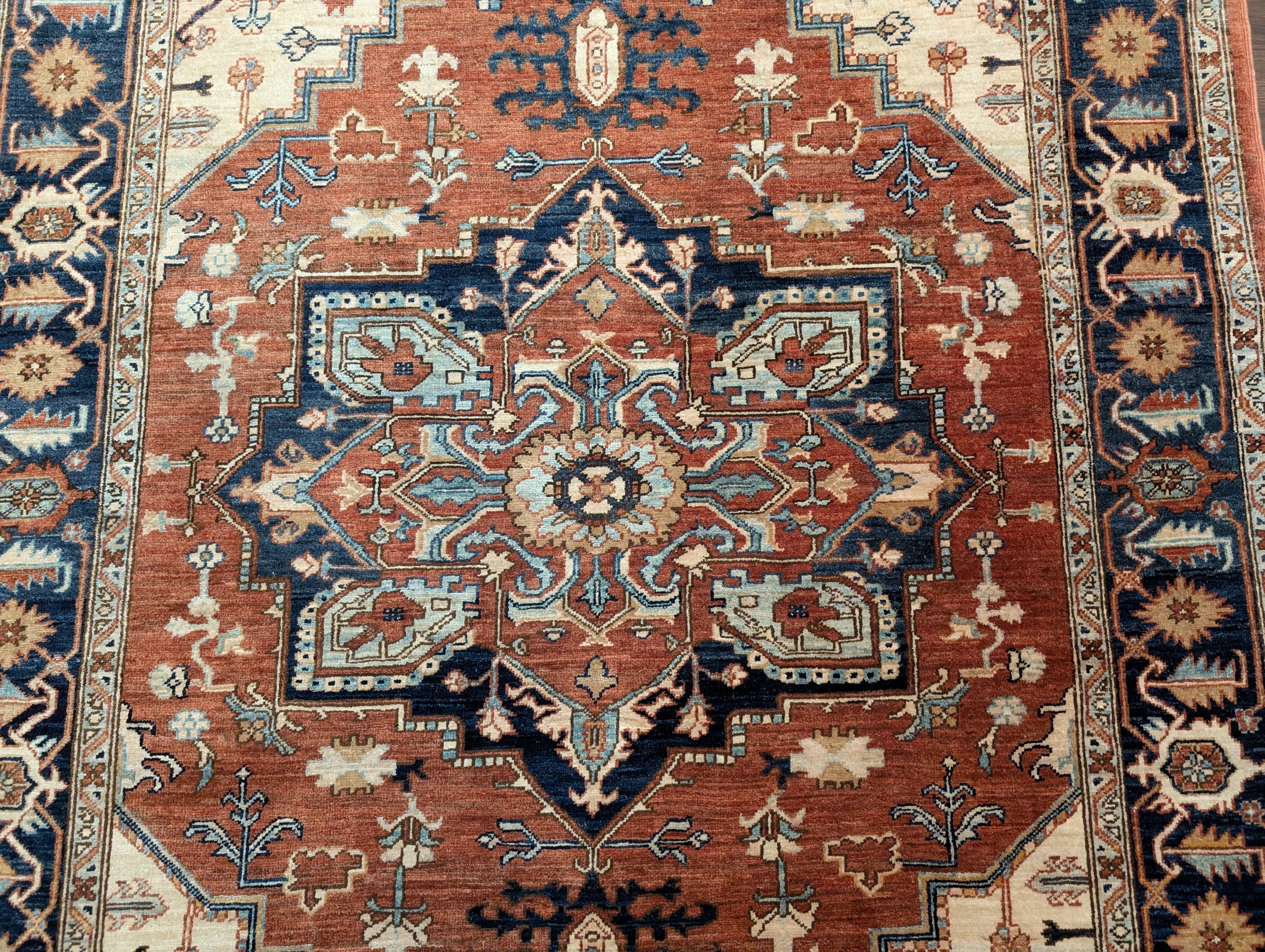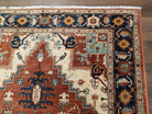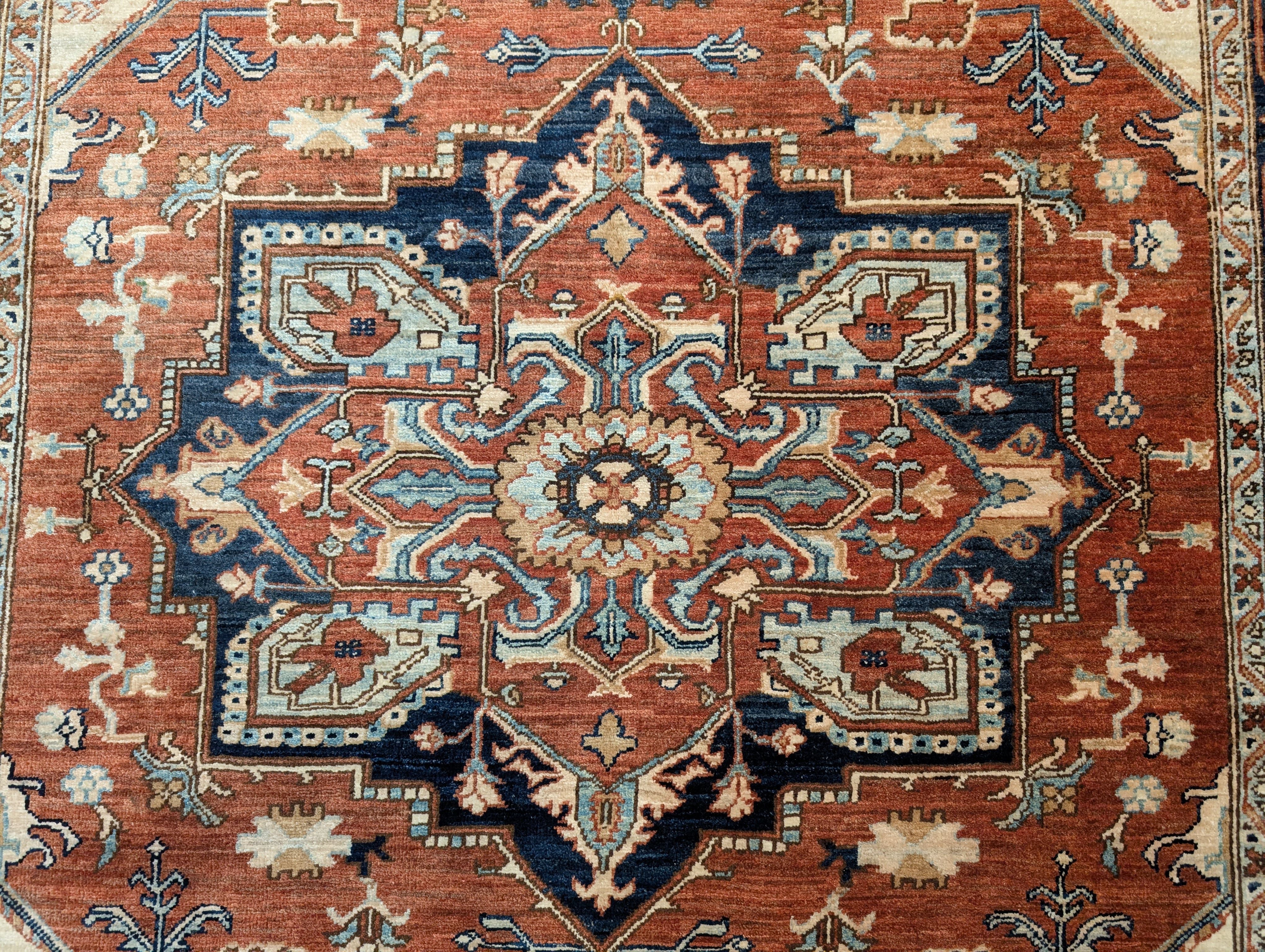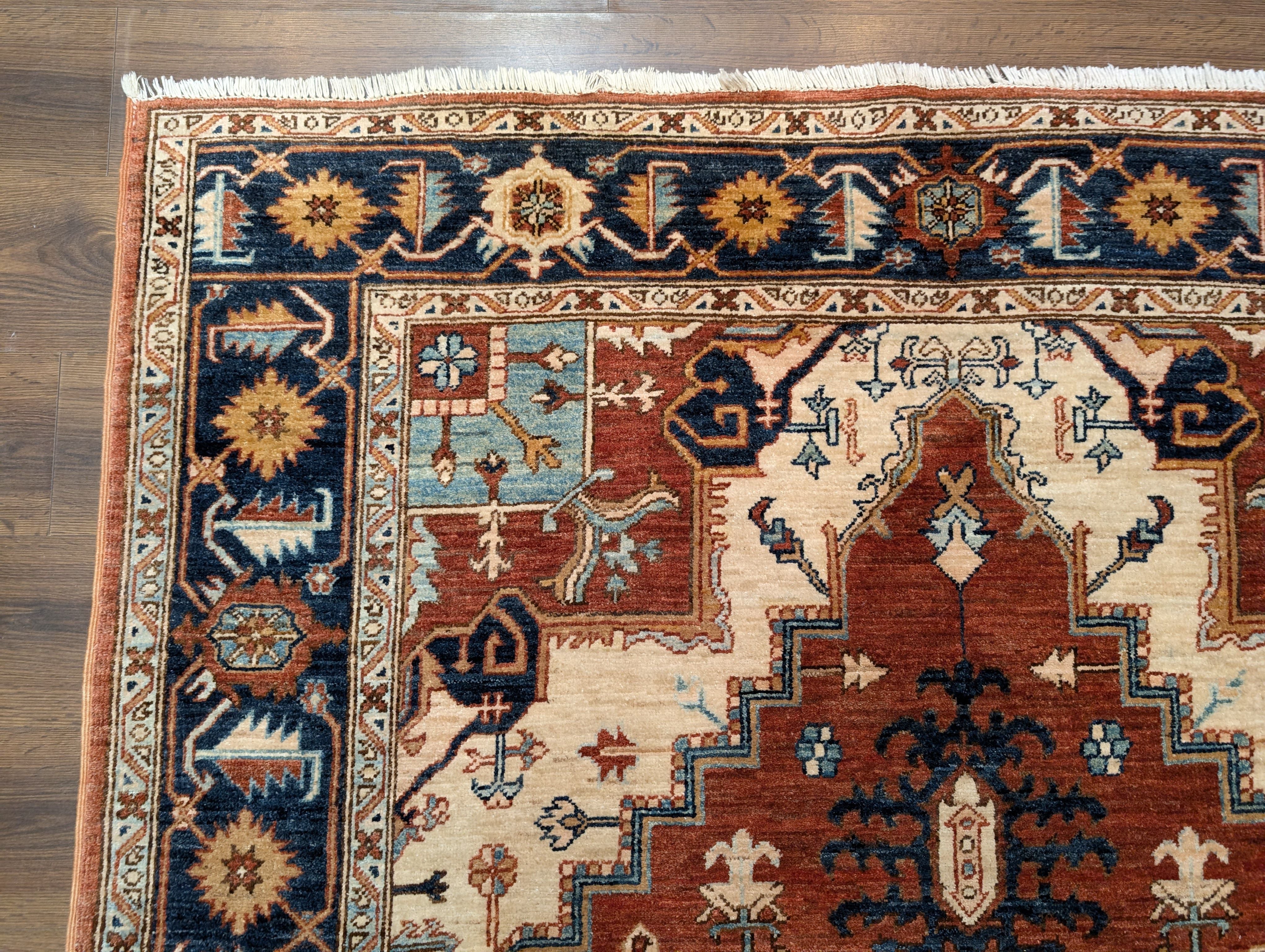 Turkish Heriz Serapi Rug 6x9, Geometric Medallion, Terracotta and Navy Blue, Handmade
